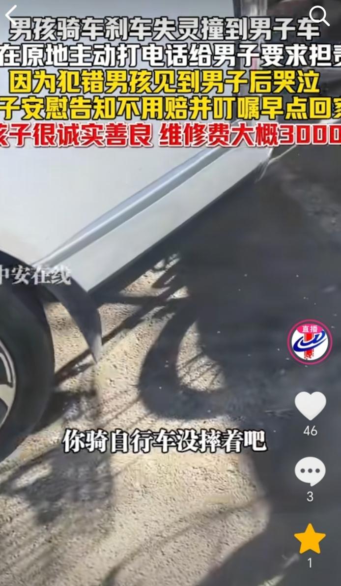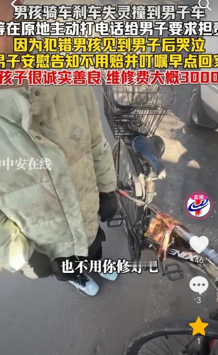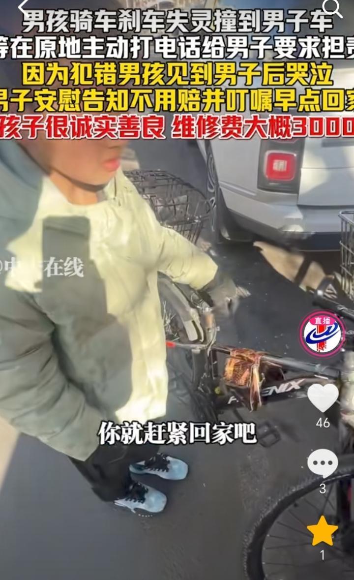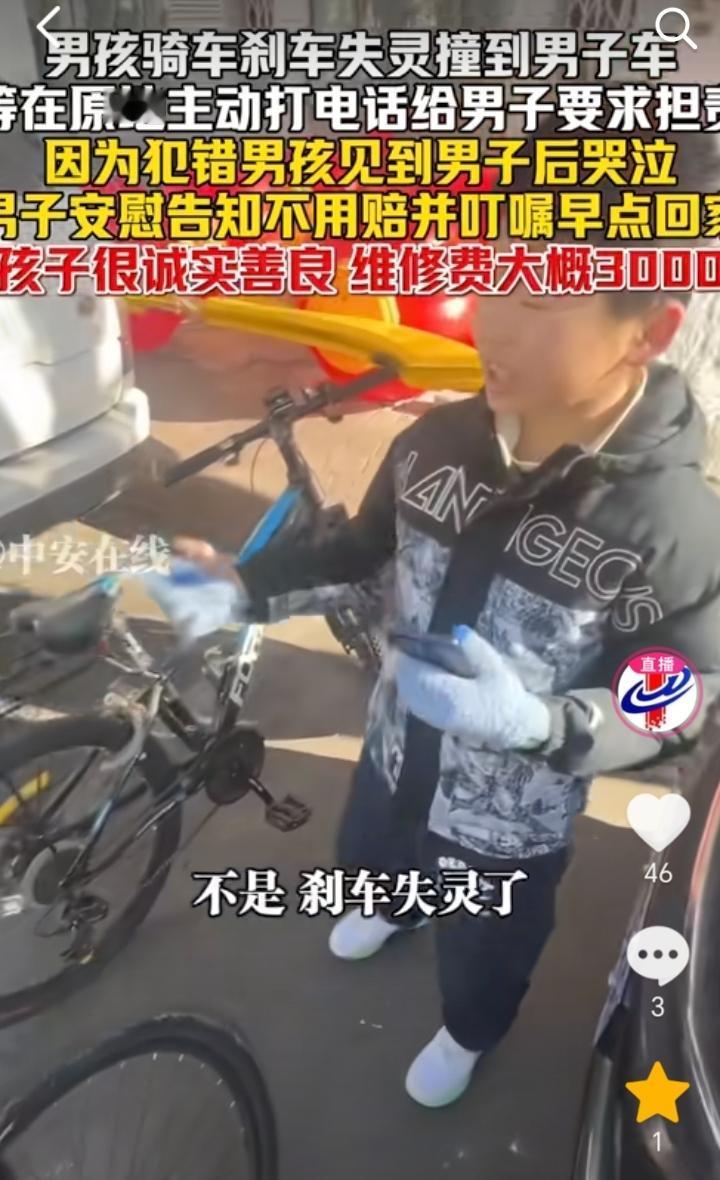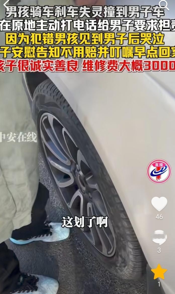 有担当!内蒙古,男孩骑车刹车失灵结果撞上了男子的车,男孩主动打电话给男子要求担责,男子到场查看后询问男孩家里大人呢?男孩顿时就哭了起来,男子连忙安慰男孩不要哭,并且询问有没有摔着以及怎样撞上的,和男孩一块的小伙伴解释称,刹车失灵了捏不住了就撞上了,男子听后虽然维修大概需要3000元,但是男子并没有让男孩担责,而是表示自己有保险让男孩赶紧回家。 男孩骑车撞了男子的车,没有因为害怕而逃跑,而是主动联系男子要求担责,由此可见男孩是一个有担当敢于承担错误的人,就凭借这一点,就值得为男孩点赞,应该也就是男孩的言行感动到了男子,因此才没有让男孩赔偿。 不管做任何事,如果做错了就要敢于担当,不要想着逃避,如果男孩选择逃避可能就会是另一种结果。