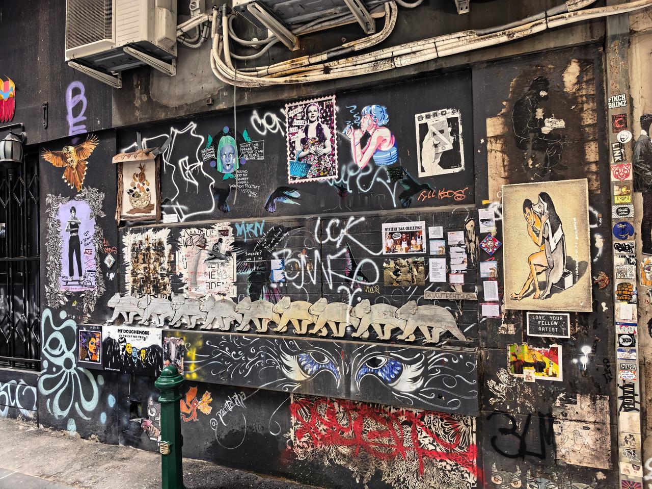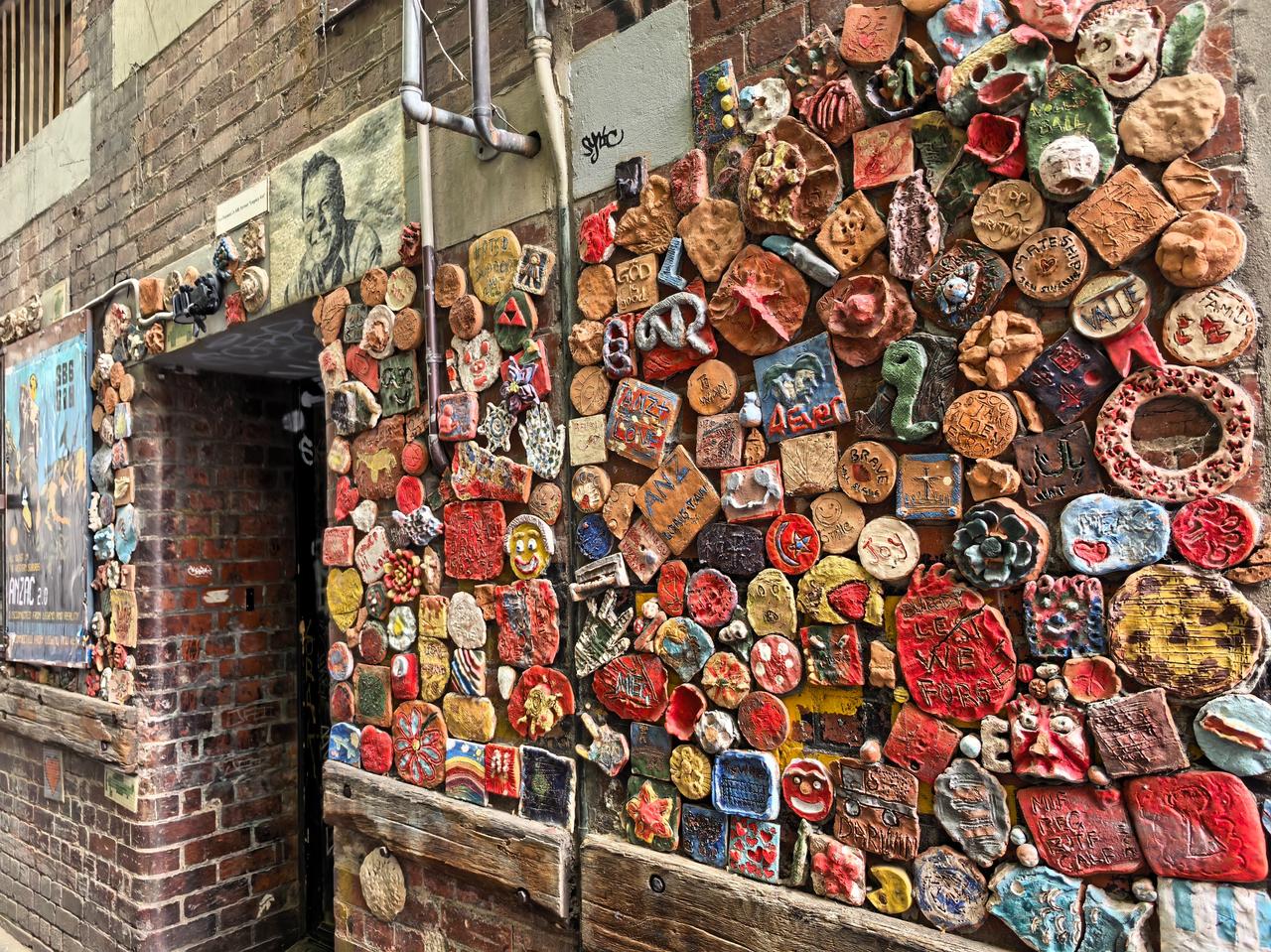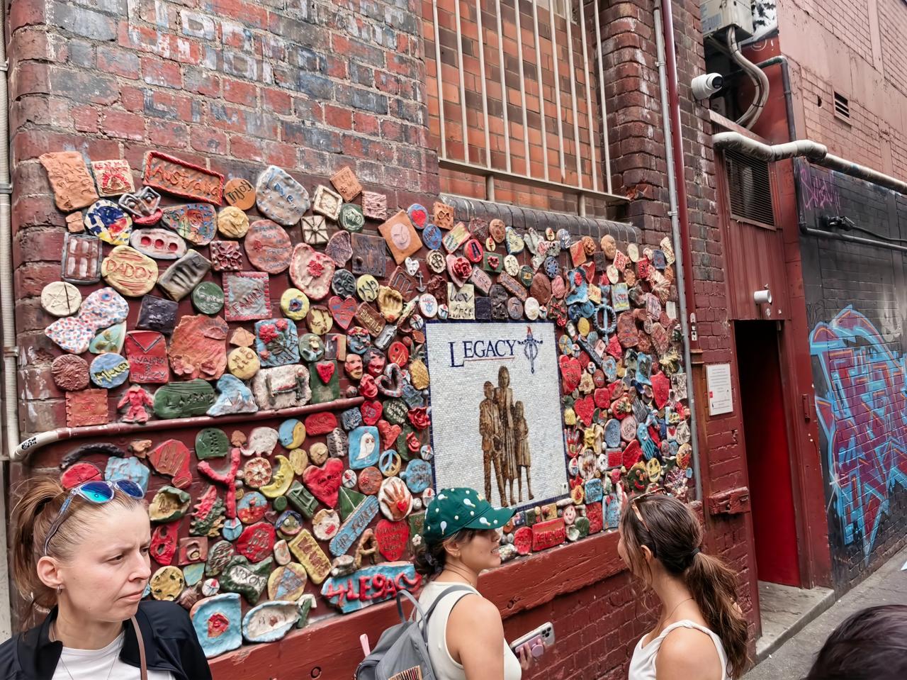 墨尔本中心小巷子,自殖民时期遗留[看] 无数街头艺术驻留,俗称涂鸦[可爱] 因为2005年的英联邦运动会,平面涂鸦被禁止,年轻人通过相框的方式,创造了立体涂鸦[大笑] 墙面陶瓷片,建筑外墙立体雕像有讽刺政客与社会的风格[笑]