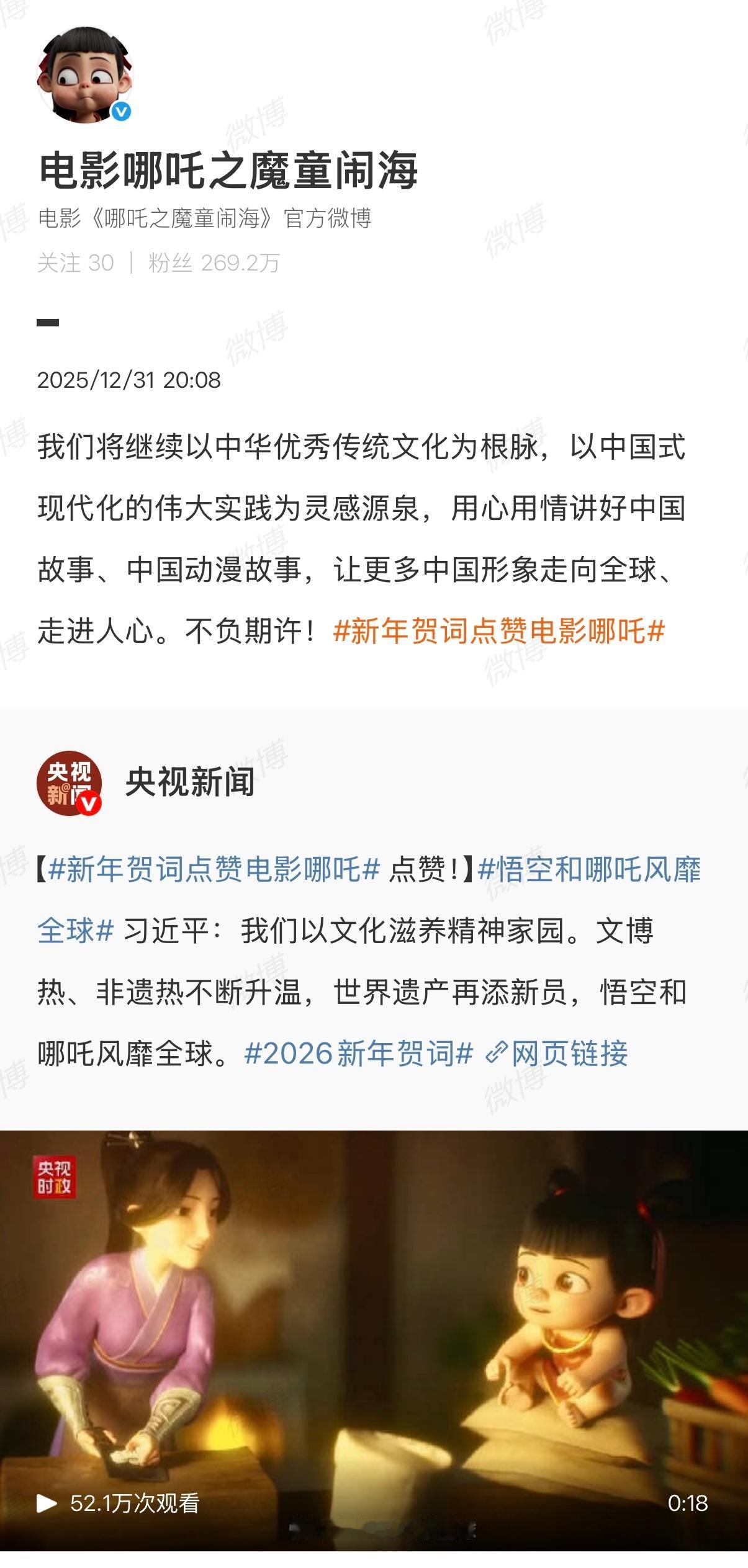 哪吒官微说不负期许哪吒官微跨年夜发博 哇为吒儿骄傲!新年贺词点赞电影哪吒,发博回应:“我们将继续以中华优秀传统文化为根脉,以中国式现代化的伟大实践为灵感源泉,用心用情讲好中国故事、中国动漫故事,让更多中国形象走向全球、走进人心。中国电影,越来越好!”