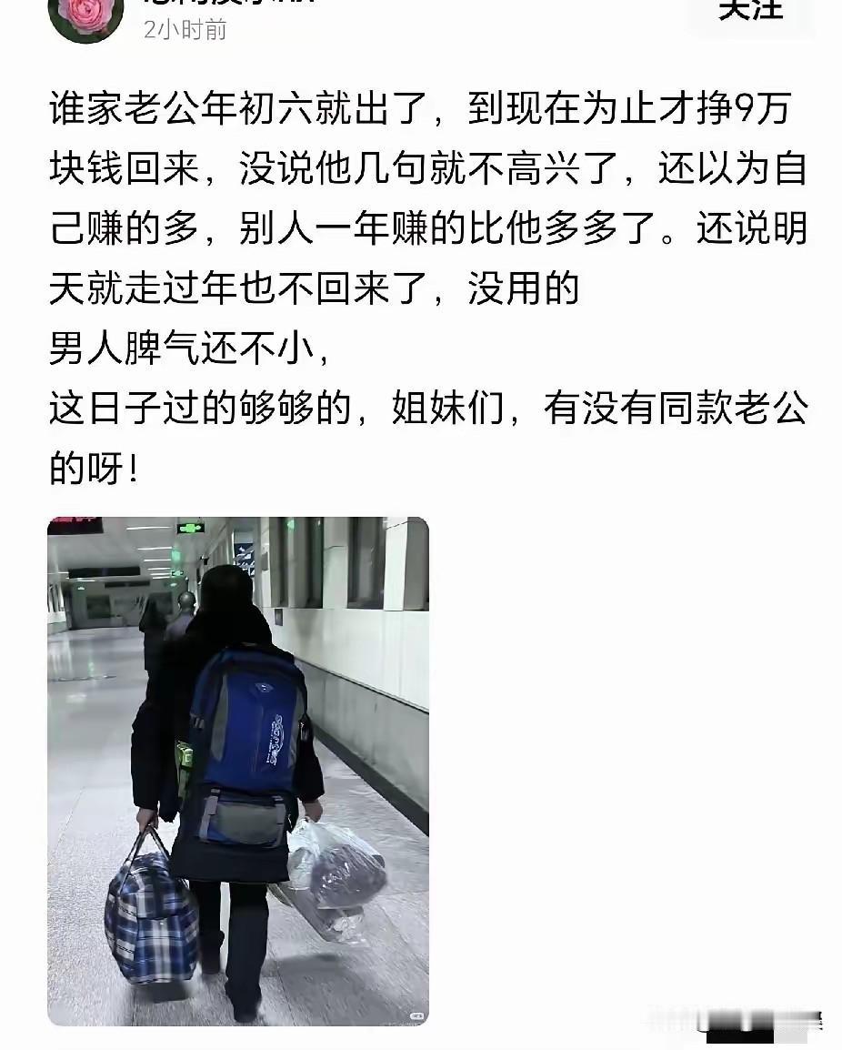 哎,这女人啊,真不知足。一味地抱怨丈夫没用,年初六就出去打工了,年尾回来的时候只带 9 万块钱。 数落他两句,就非常的不高兴,赚钱能力不行,脾气还挺大,别人一年比他赚的多多了。 字里行间透露着对丈夫的不尊重,不理解,更别说心疼了。她认为丈夫赚钱能力不行,不能满足她和家庭的需要,还称这样的日子过得够够的了。 在她看来外面大把大把赚钱的机会,遍地黄金的那种。随随便便搞搞一年弄个三五十万轻轻松松。 殊不知,绝大多数普通人,辛辛苦苦一个月也就赚个几千块钱而已。抛去房租生活费水电燃气七七八八的费用,一年能剩下几万块钱已经很不错了。 不养家不知钱难赚。这种女人啊,太让男人寒心了!对老公的无奈 对老公抱怨 对老婆的无奈 老婆游手好闲 老婆好久不开车 丈夫不努力 丈夫叫苦没力气