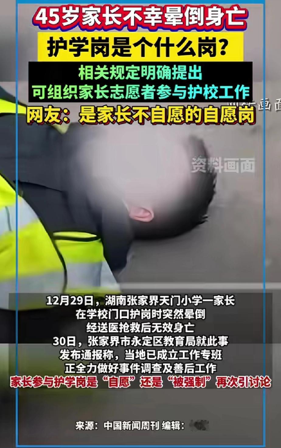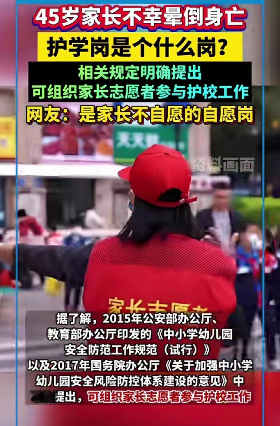 刚听说有人倒在了护学岗位上,又看到一位年轻的妈妈,一手死死抓住一位幼儿后衣领子,一手拿着小红旗在指挥过往行人和车辆。到底谁要守护谁安全? 据说,护学岗是在学校的授意下,有家委会组织的志愿者参与的岗位。说是志愿,其实谁是135,谁是246,早就排好的值班顺序。 既然已经排好了顺序,哪个家长也不好意思不到位,毕竟还要顾虑自家孩子在学校的情况。没有固定工作的家长还好,时间比较自由,有的家长却只能在单位请假,甚至放弃工资来坚守这个岗位。于是,这个岗位就成了家长不自愿的自愿岗。 如果,家长身体不舒服了,或者还有二宝或三宝没人照看,那就只能如上面两个例子那样,带病或是带娃上岗了。 关键是这个岗应该没有保险吧!一旦出了事,算谁的责任? 如果是为了安全考虑,增设护学岗,而护学岗却给家长带来负担和安全忧患,那学校就应该考虑这个岗位的合理性了。 图片来自网络侵删致歉