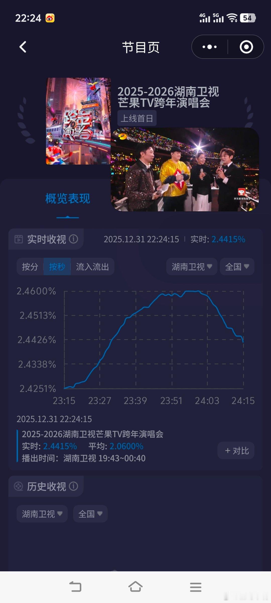 湖南跨年把春晚搬来了今年最惊喜的节目:花车秀春晚主题!好热闹啊!这才是过年该有的氛围!酷云收视飙升到2.4600,成为今晚最高峰值!如果时间段安排在22:00之前会更好!请明年继续做保留这个节目环节!