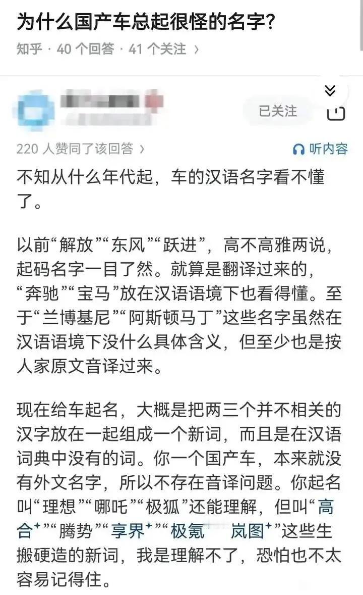 这些名字怪异的车,主要是想取个好听的英文名字,从英语造词的角度看显得有意义。然而,这种生搬硬造的做法使得其中文名字变得极其怪异。说白了,这些车企由老一辈领导掌舵,存在崇洋媚外的思想,更倾向于取好听的英文名字,而不以中文母语为核心。 从现实情况来看,像理想、蔚来、小鹏这类以中文命名的汽车,销量反而更好。甚至名字相对不那么出彩的小鹏汽车,也比传统大厂那些名字怪异的车型卖得好,由此可见取名确实至关重要。