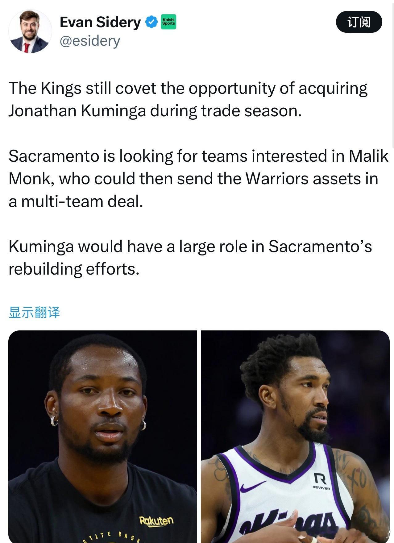 Evan Sidery:国王仍渴望交易得到库明加。国王正在寻找对马利克·蒙克感兴趣的球队,他们可能会在一笔多方交易中将筹码送到勇士。