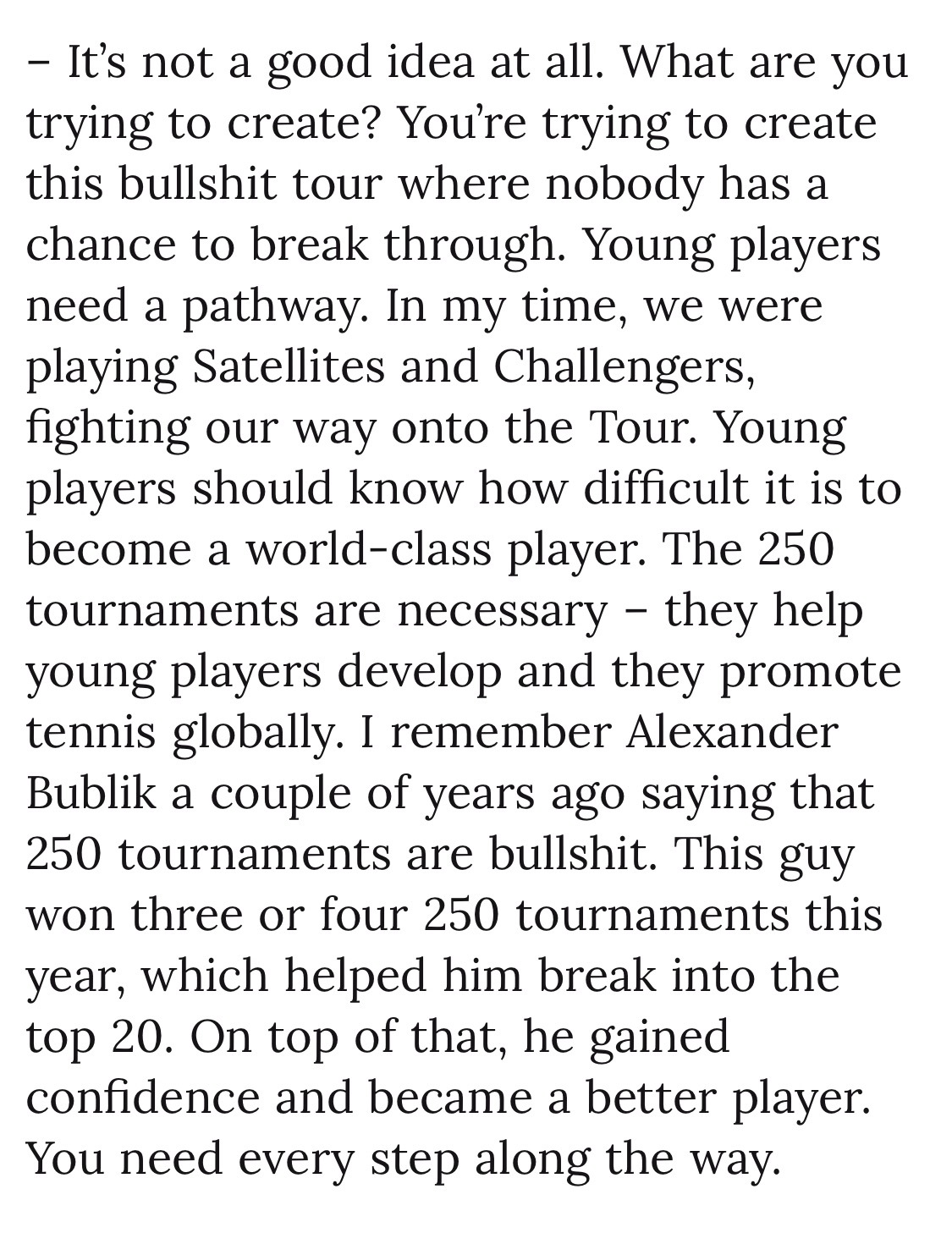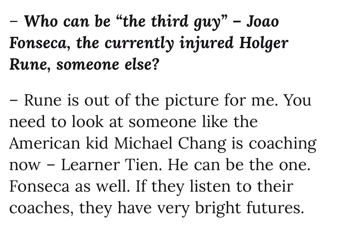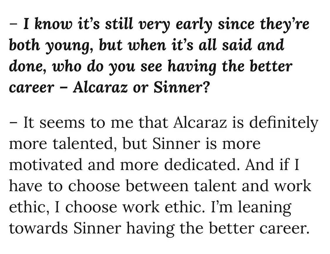 卡费尔尼科夫的访谈我一直很爱听,有名宿的洞察,却没有老江湖的世故,所以很少客套话,有啥说啥,还总能直击要害。最近他与《CLAY》杂志的一次专访就超级有料,记者专挑敏感话题问,卡费也是各种话糙理不糙。我给你们划个重点——关于阿卡与费雷罗分手:“最大的错误就是家长来干预执教。。。在我家我是做主的,我爸从来不过问训练方面的事情。据我所知费雷罗和阿卡他爸很不对付,这种情况都会对球员造成负面影响,阿卡是成年人,他应该自己做决定。”关于阿卡未来的教练人选:“新教练的第一件事就是要求父母靠边站。他们可以坐在包厢,可以一起旅行,但不能干预。。。说实话我不知道现在谁能来接这个活。”关于球员们抱怨赛程:“17岁的时候你要通过巡回赛来争取积分和排名,而有了名气以后就看不上巡回赛了,但恰恰是巡回赛成就了你。现在的球员,最大的问题就在于,他们对成就自己的人和事缺乏尊重。我还听有人说不需要250赛,狗屁!年轻的时候你可是无比渴望这些比赛的,多尊重一下帮你造星的巡回赛吧!”关于未来要砍掉250赛:“完全不是一个好主意。。。我记得布勃利克曾说,250赛都是狗屁,但他今年就拿了三四个250冠军,这些赛事帮助他闯进了前20,而且还收获了自信,成了一名更好的球员。”关于兹维列夫夺大满贯的前景:“这个阶段还想进步很难,因为这意味着巨大的牺牲,做出很多改变。同样的情况也存在于梅德维德夫身上,除非他们做出根本性的改变,否则拿不到大满贯了。。。最大的问题是,他们是否愿意这样做呢,每周七天,一天24小时的投入,很多球员不愿这样做,他们已经安于现状了。”关于德约的25贯:“讲真,我怀疑他再也拿不到了。。。身体和新陈代谢决定了你无法像年轻人那样迅速恢复,39岁和22岁的巅峰状态去拼,就是太老了。三盘两胜还能打打,五盘三胜基本上没戏了。”关于阿卡和辛纳谁的职业成就更高:“阿卡无疑更有天份,但辛纳更有动力也更舍得投入。如果要在天赋和工作态度之间来选,我倾向于工作态度,所以我觉得辛纳的成就会更高一点。”关于第三人是谁:“鲁内已经不在我的视野里了。你得去看看类似于张德培带的那个美国孩子——勒纳·钱,他能成。丰塞卡也可以,如果他们能听教练的话,那就能有光明的未来。”