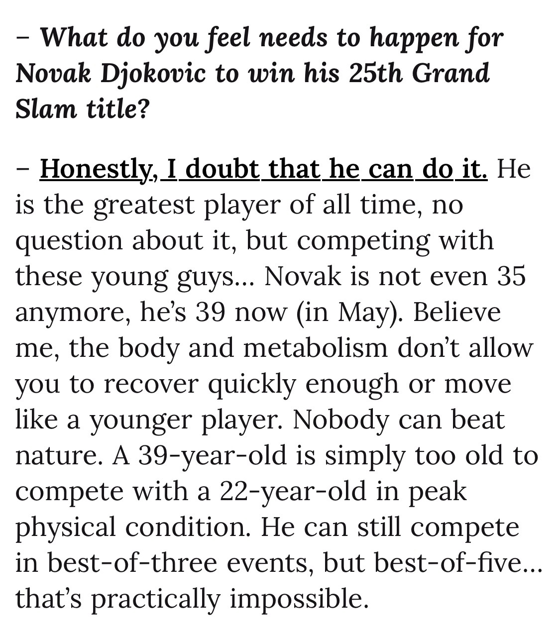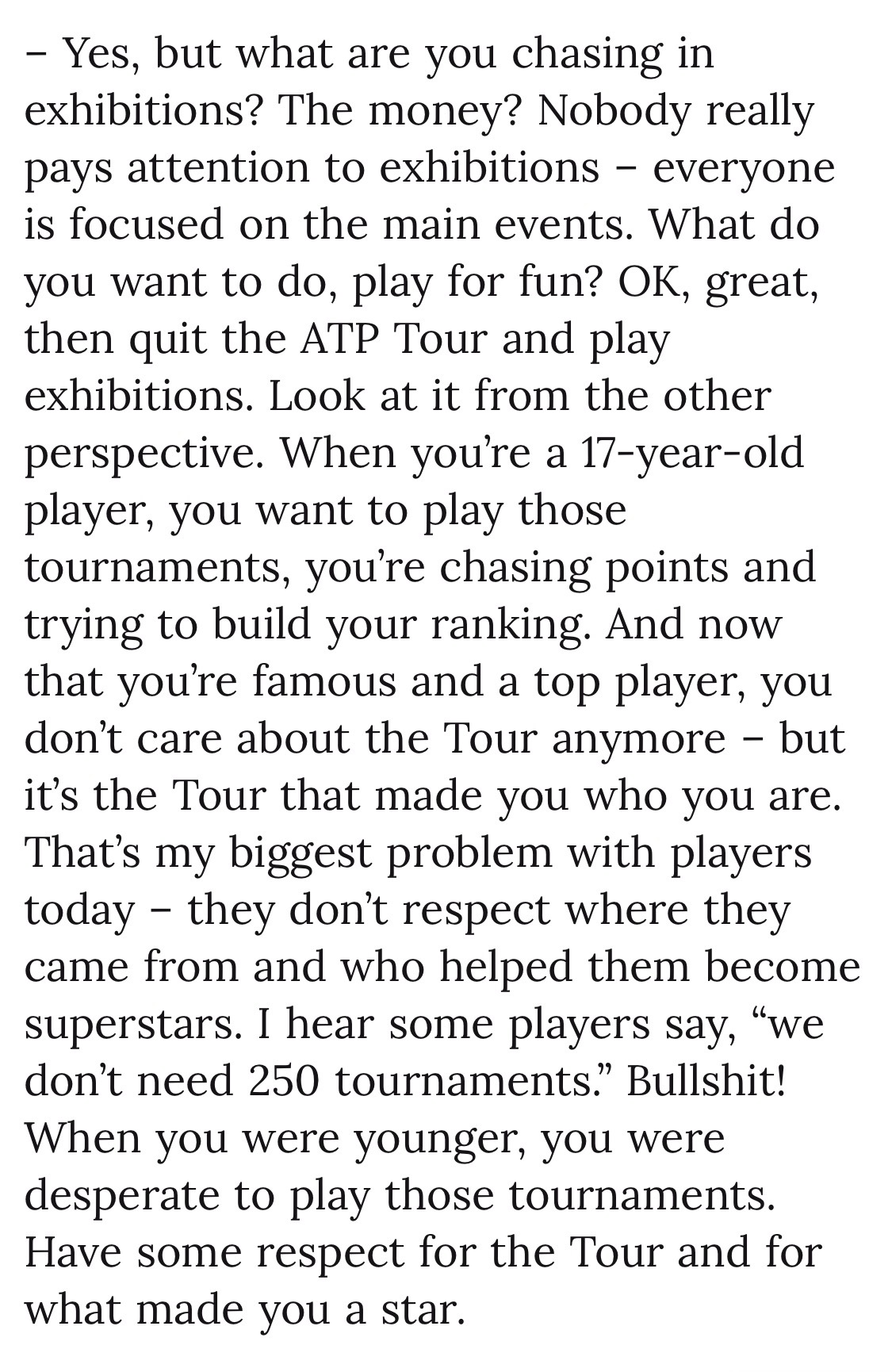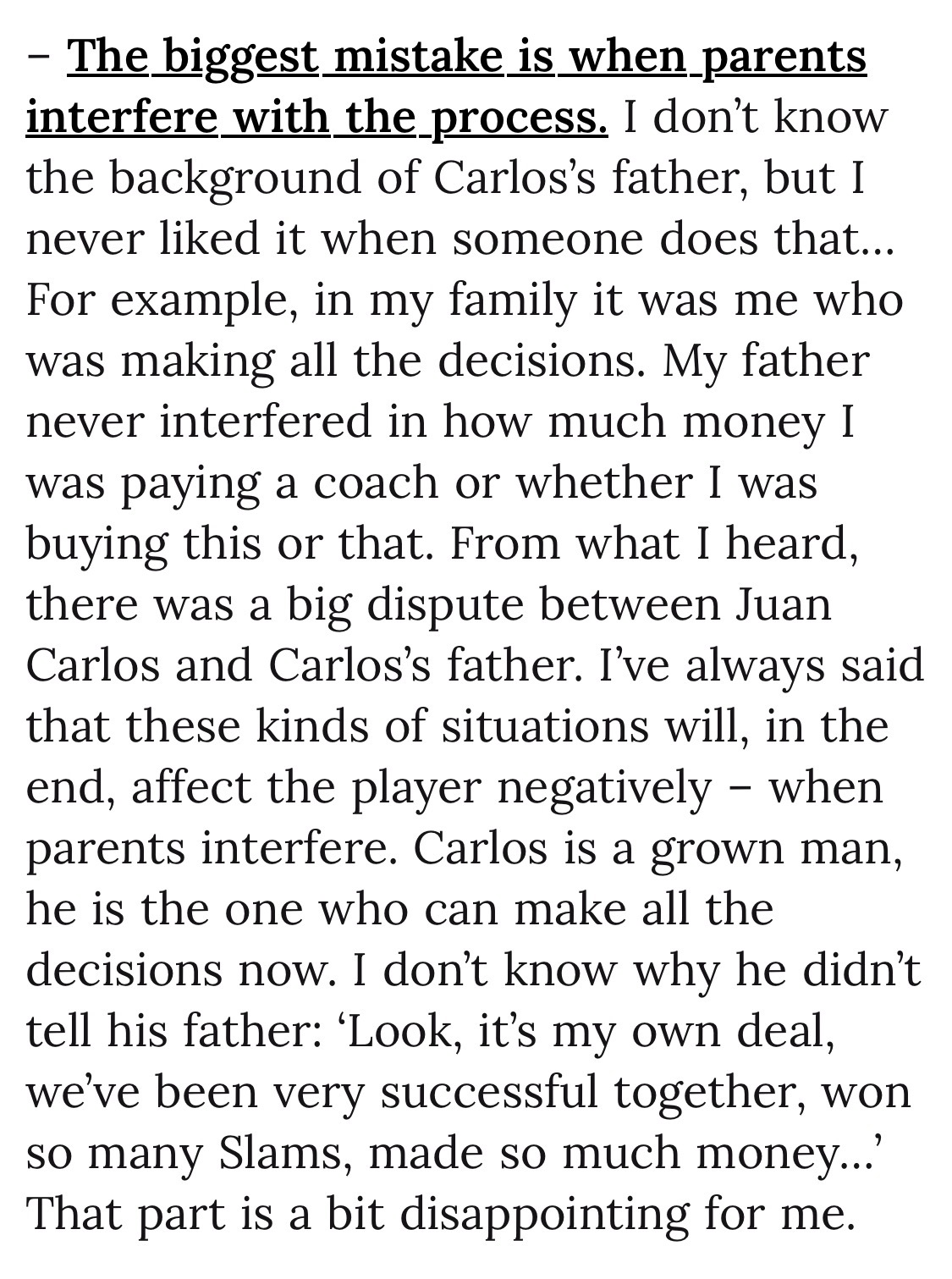 卡费尔尼科夫的访谈我一直很爱听,有名宿的洞察,却没有老江湖的世故,所以很少客套话,有啥说啥,还总能直击要害。最近他与《CLAY》杂志的一次专访就超级有料,记者专挑敏感话题问,卡费也是各种话糙理不糙。我给你们划个重点——关于阿卡与费雷罗分手:“最大的错误就是家长来干预执教。。。在我家我是做主的,我爸从来不过问训练方面的事情。据我所知费雷罗和阿卡他爸很不对付,这种情况都会对球员造成负面影响,阿卡是成年人,他应该自己做决定。”关于阿卡未来的教练人选:“新教练的第一件事就是要求父母靠边站。他们可以坐在包厢,可以一起旅行,但不能干预。。。说实话我不知道现在谁能来接这个活。”关于球员们抱怨赛程:“17岁的时候你要通过巡回赛来争取积分和排名,而有了名气以后就看不上巡回赛了,但恰恰是巡回赛成就了你。现在的球员,最大的问题就在于,他们对成就自己的人和事缺乏尊重。我还听有人说不需要250赛,狗屁!年轻的时候你可是无比渴望这些比赛的,多尊重一下帮你造星的巡回赛吧!”关于未来要砍掉250赛:“完全不是一个好主意。。。我记得布勃利克曾说,250赛都是狗屁,但他今年就拿了三四个250冠军,这些赛事帮助他闯进了前20,而且还收获了自信,成了一名更好的球员。”关于兹维列夫夺大满贯的前景:“这个阶段还想进步很难,因为这意味着巨大的牺牲,做出很多改变。同样的情况也存在于梅德维德夫身上,除非他们做出根本性的改变,否则拿不到大满贯了。。。最大的问题是,他们是否愿意这样做呢,每周七天,一天24小时的投入,很多球员不愿这样做,他们已经安于现状了。”关于德约的25贯:“讲真,我怀疑他再也拿不到了。。。身体和新陈代谢决定了你无法像年轻人那样迅速恢复,39岁和22岁的巅峰状态去拼,就是太老了。三盘两胜还能打打,五盘三胜基本上没戏了。”关于阿卡和辛纳谁的职业成就更高:“阿卡无疑更有天份,但辛纳更有动力也更舍得投入。如果要在天赋和工作态度之间来选,我倾向于工作态度,所以我觉得辛纳的成就会更高一点。”关于第三人是谁:“鲁内已经不在我的视野里了。你得去看看类似于张德培带的那个美国孩子——勒纳·钱,他能成。丰塞卡也可以,如果他们能听教练的话,那就能有光明的未来。”