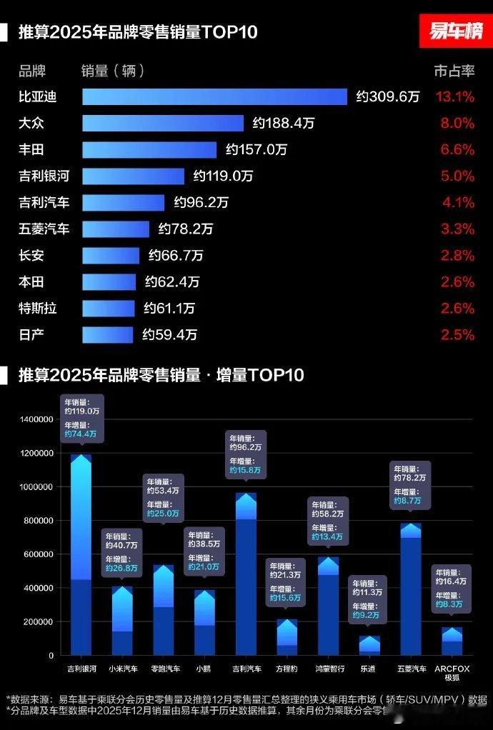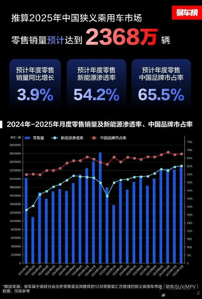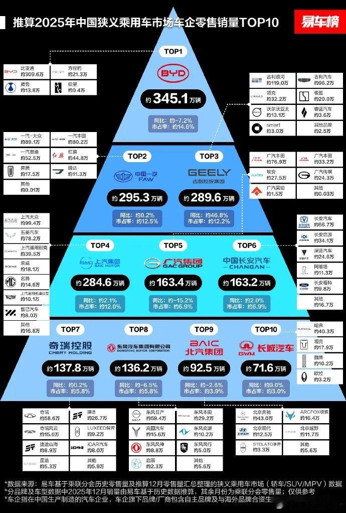 看完这份2025年车市“剧透”,感觉格局真的彻底变了,信息量巨大!简单说就是三点:拐点之战:新能源渗透率预计达54.2%,历史上首次过半,油电地位正式逆转。国货当道:中国品牌市占率预计65.5%,每卖10辆车,近7辆是国产,主导市场。座次洗牌:比亚迪(345万辆)稳坐第一,但同比微降。吉利(289万辆)暴涨近47%,势头最猛,和第三名差距极小。“老面孔” 一汽-大众、上汽通用等合资车企,排名和销量正被中国品牌集体赶超。车型方面也全是看点:年度车型销量前三(星愿、宏光MINIEV、Model Y)全是新能源。在燃油车阵地,轩逸、朗逸等依旧是轿车主力,但SUV销量王已是吉利的星越L。总结:2025年,将是中国品牌凭借新能源,全面主导市场、重塑格局的一年。合资品牌面临的压力,前所未有。建哥看本质