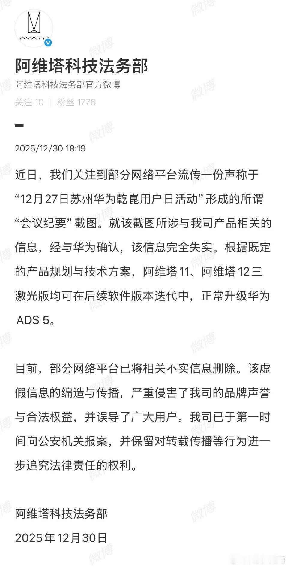 【阿维塔辟谣会议纪要截图】阿维塔已就不实信息报案 阿维塔这波辟谣够硬气,直接报警怼谣言!明摆着有人眼红CHN模式,想搅黄华为ADS 5升级。老车主把心放肚子里,三激光版照样能打,坐等OTA就完事了!