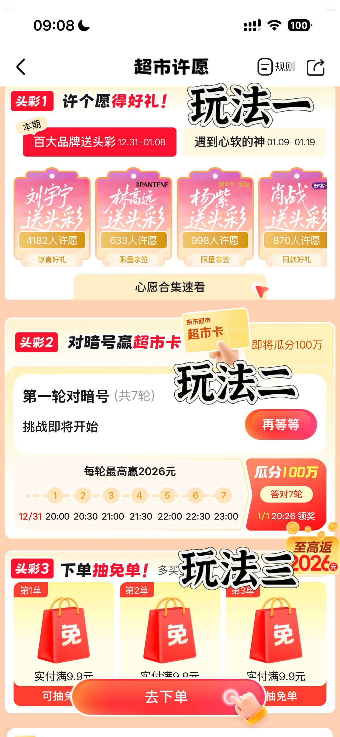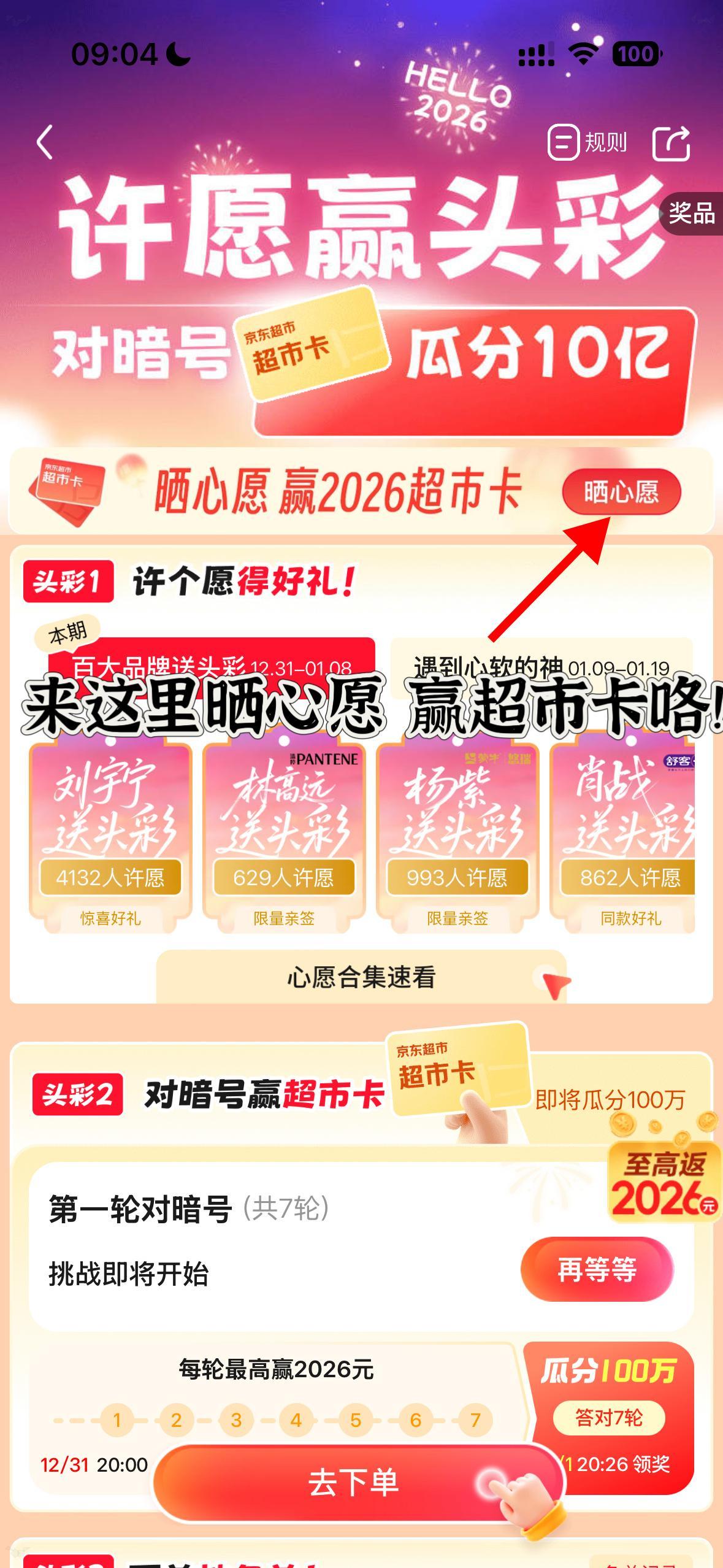 许愿2026还用等流星?京东超市直接把圆梦攻略拍我脸上了!这一波从百大品牌包圆,到明星助力圆梦时刻,从博主亲自派礼到福利层层升级,妥妥的“保姆级许愿指南”!12月31日起每天都是圆梦盲盒,本行动派已经准备好小本本记日程了!12月31日,心愿办事处正式成立了!打开京东app搜索【许愿2026】,四种玩法助力每一位实现心愿,一、心愿办事处许愿互动预约好礼,二、看跨晚答题对暗号瓜分10亿,三、天天抽免单,四、点击去黑眼圈社区晒心愿赢2026元超市卡!另外,在微博带话题包圆马年的2026个心愿 发布新年愿望,有机会被京东超市pick成为锦鲤!还等啥?参与许愿赢头彩好礼,看跨晚参与答题瓜分10亿!晒心愿还能赢2026元超市卡!戳【网页链接】京东超市等你来许愿,新年好运从这里开始!今晚边看湖南跨晚边买同款,京东超市新年购物季好物低至五折!还有机会返至高2026元超市卡! 2026你来许愿 京东超市来实现 看跨晚上京东 买新年好礼 看跨晚上京东抽跨年大奖
