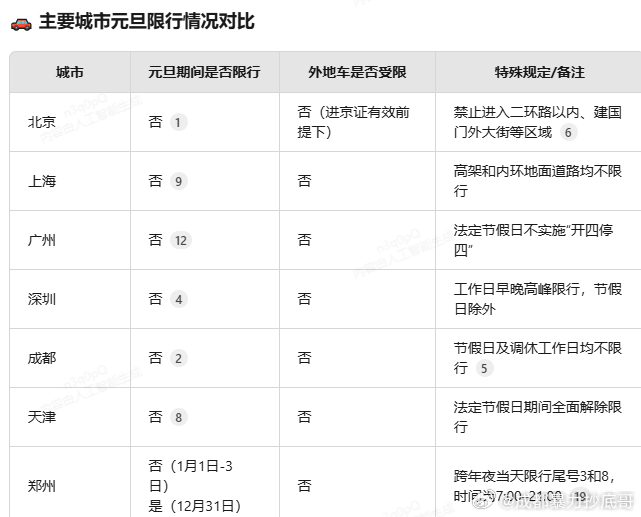 元旦节车辆限行吗 2026年元旦节期间,全国多数城市对本地及外地号牌小型客车均不限行根据成都市交通管理部门的常规政策,国家法定节假日(包括元旦)以及周末均不实施机动车尾号限行措施。2026年元旦假期为1月1日至1月3日,其中1月1日(周四)和1月2日(周五)为法定节假日,1月3日(周六)为调休休息日2。在此期间,成都市将暂停尾号限行规定