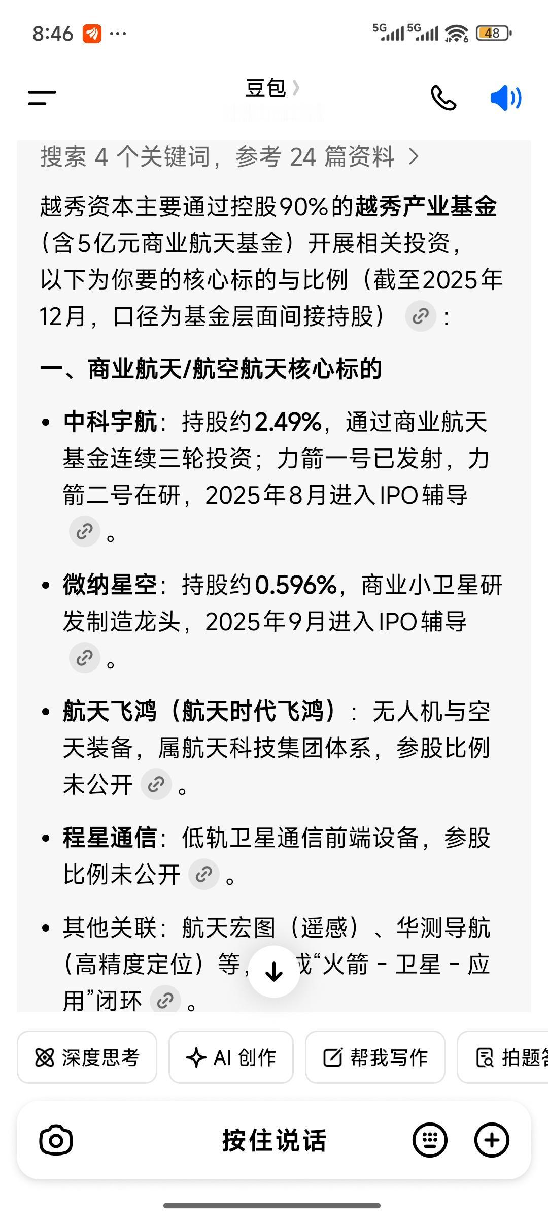 近期,鲁信创投因间接持有不到0.2%的蓝箭航天概念,迎来连续4 - 5个疯狂的涨停拉升。 我们积极寻找下一个鲁信创投,目标锁定在有产业资本投资的航空航天概念。我发现了越秀资本,它参股了众多商业航天、航空航天类公司,且这些公司都在进行IPO辅导,明年或许将迎来丰收期。 所以,我认为越秀资本值得积极关注并介入。可以先将其加入自选股,择机小仓位潜入。 航空航天板块 航天科技控股 蓝箭航天 中国蓝箭航天 蓝箭科技 央企创投基金 红鹰激光飞机