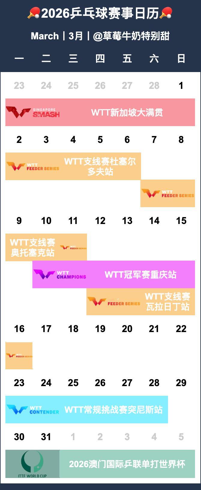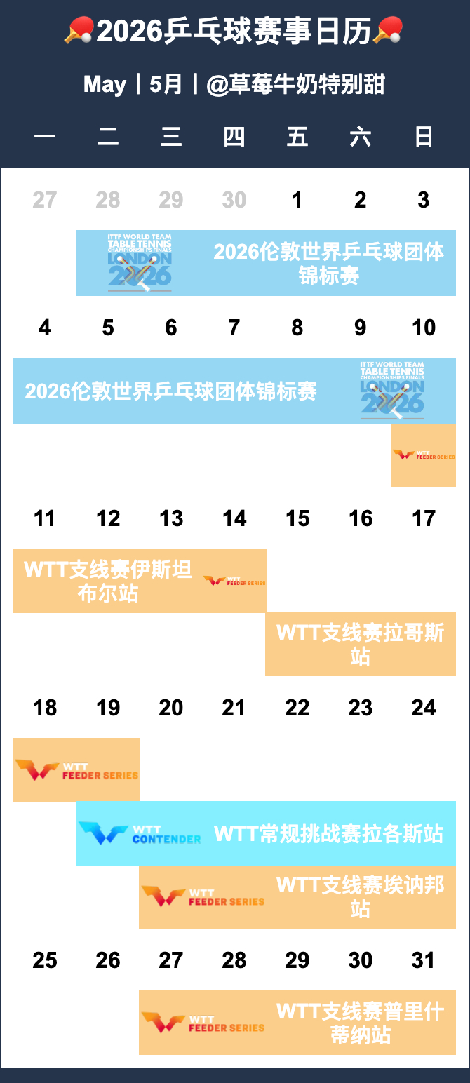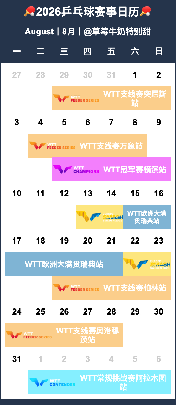 🏓2026乒乓球赛事日历🏓【P1-12】月历【P13-14】年历&总表•待定赛事-2026全国乒乓球锦标赛-2026赛季中国乒乓球俱乐部超级联赛