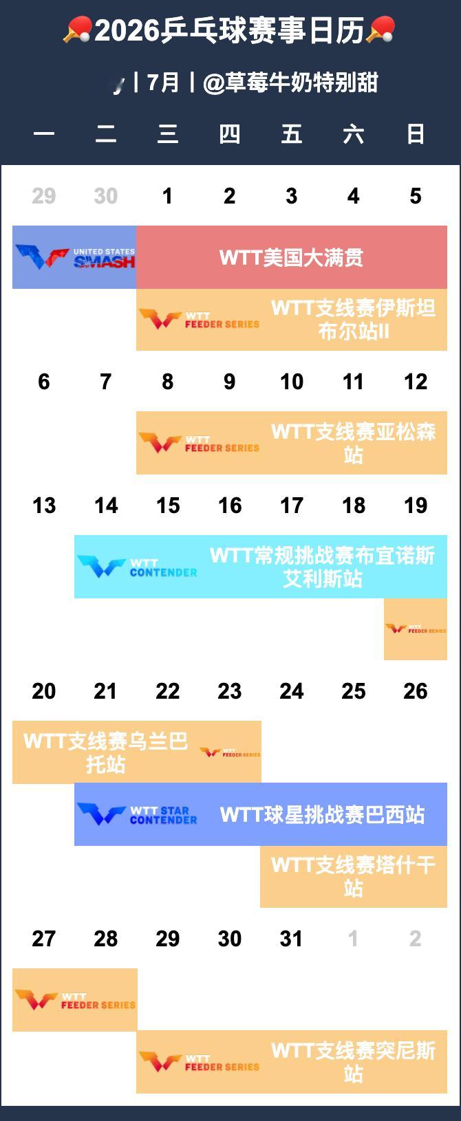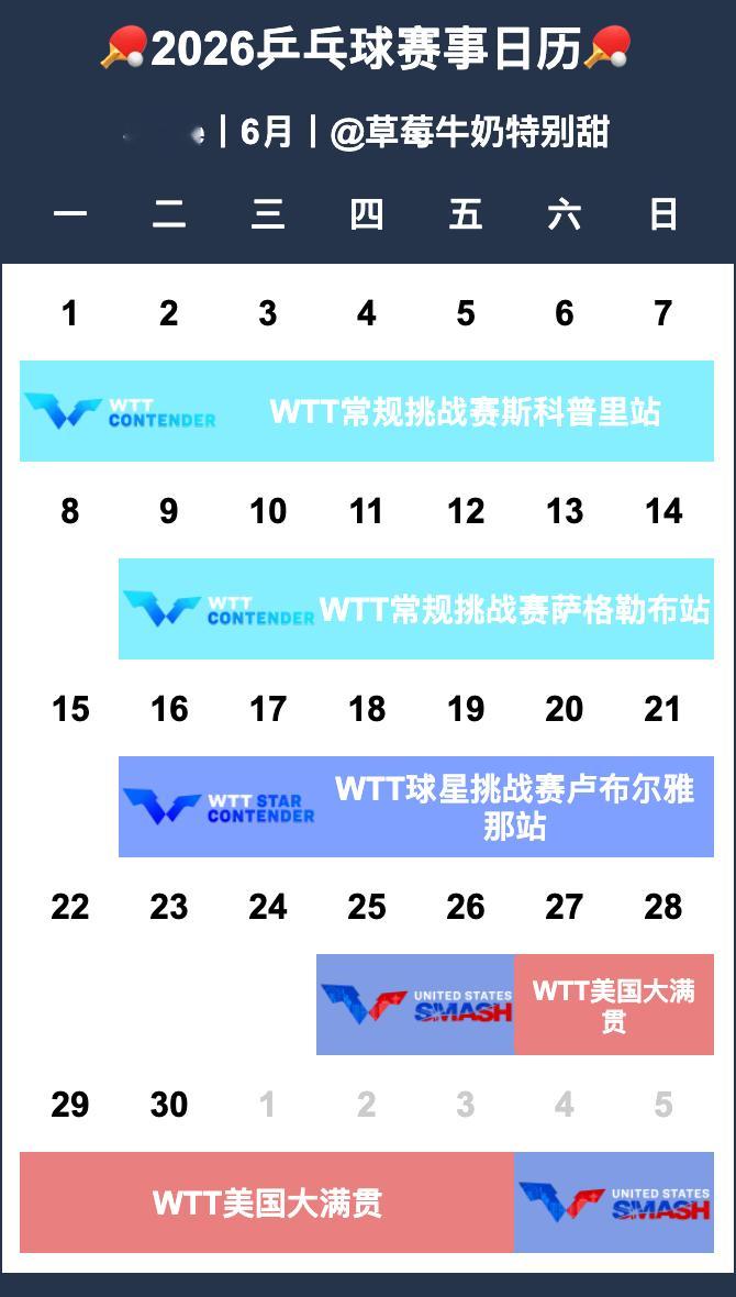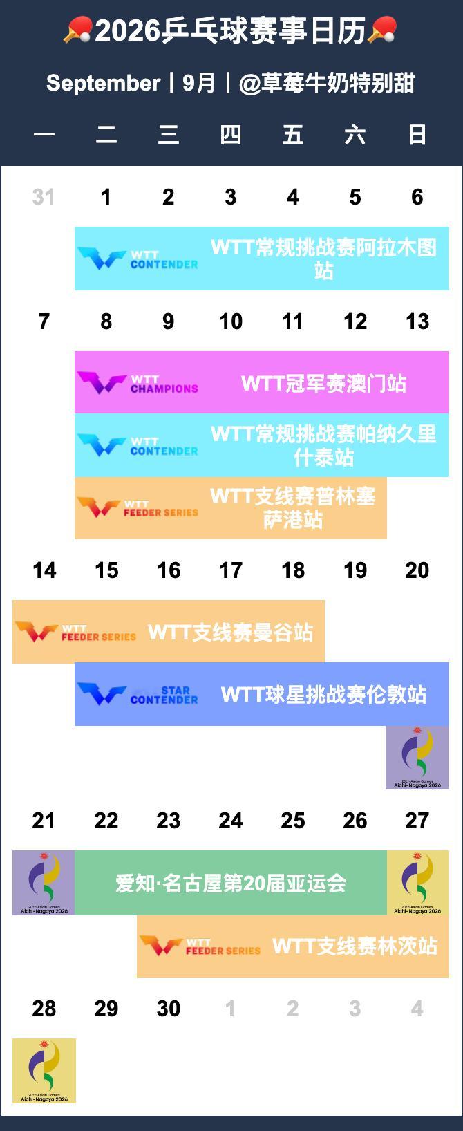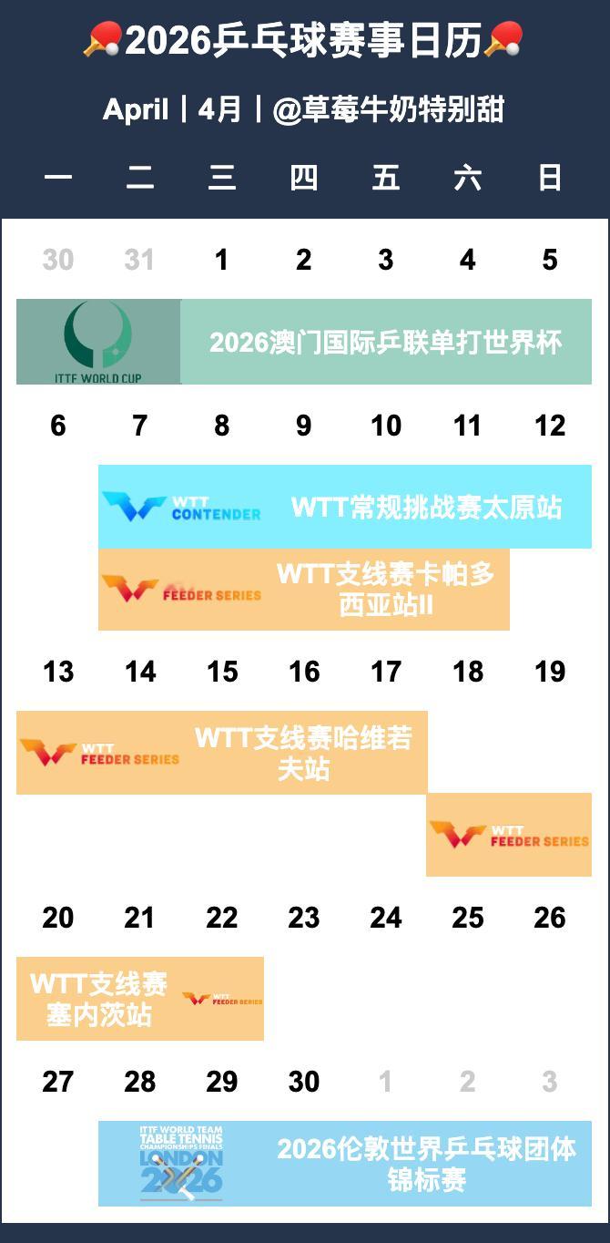 🏓2026乒乓球赛事日历🏓【P1-12】月历【P13-14】年历&总表•待定赛事-2026全国乒乓球锦标赛-2026赛季中国乒乓球俱乐部超级联赛