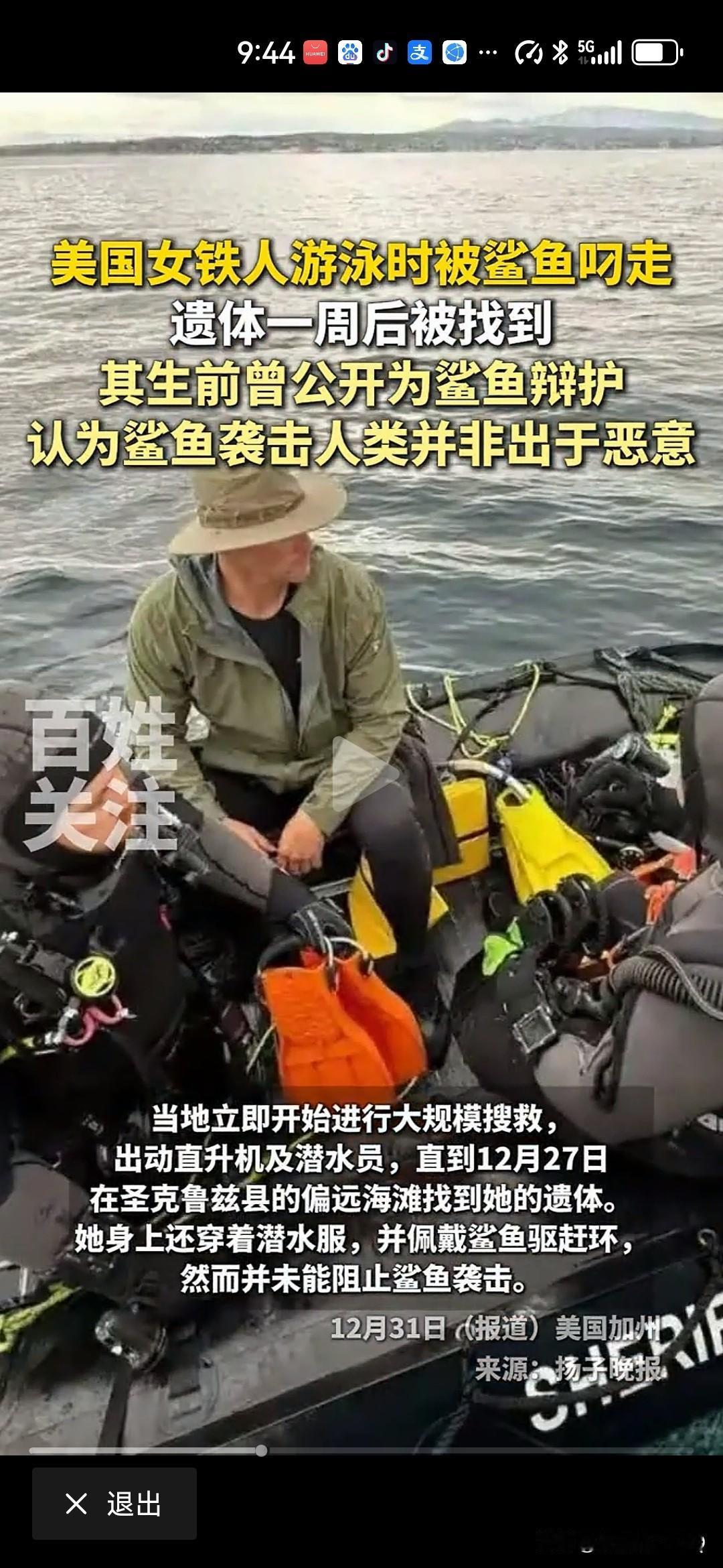 美女子被鲨鱼叼走一周后遗体被找到!天大的笑话!美国女子铁人三项冠军艾瑞卡,福克斯是一位鲨鱼辩护人,认为鲨鱼攻击人类并非恶意!而自己恰恰在大海游泳时被鲨鱼叼走了,遗体被鲨鱼吃了部分,这样自己辩解究竟是鲨鱼不同意还是鲨鱼要证明她研究结果是正确的?人与动物之间和谐相处吗?反正你跟老虎狮子豹子鳄鱼鲨鱼等讲道理是自寻死路!