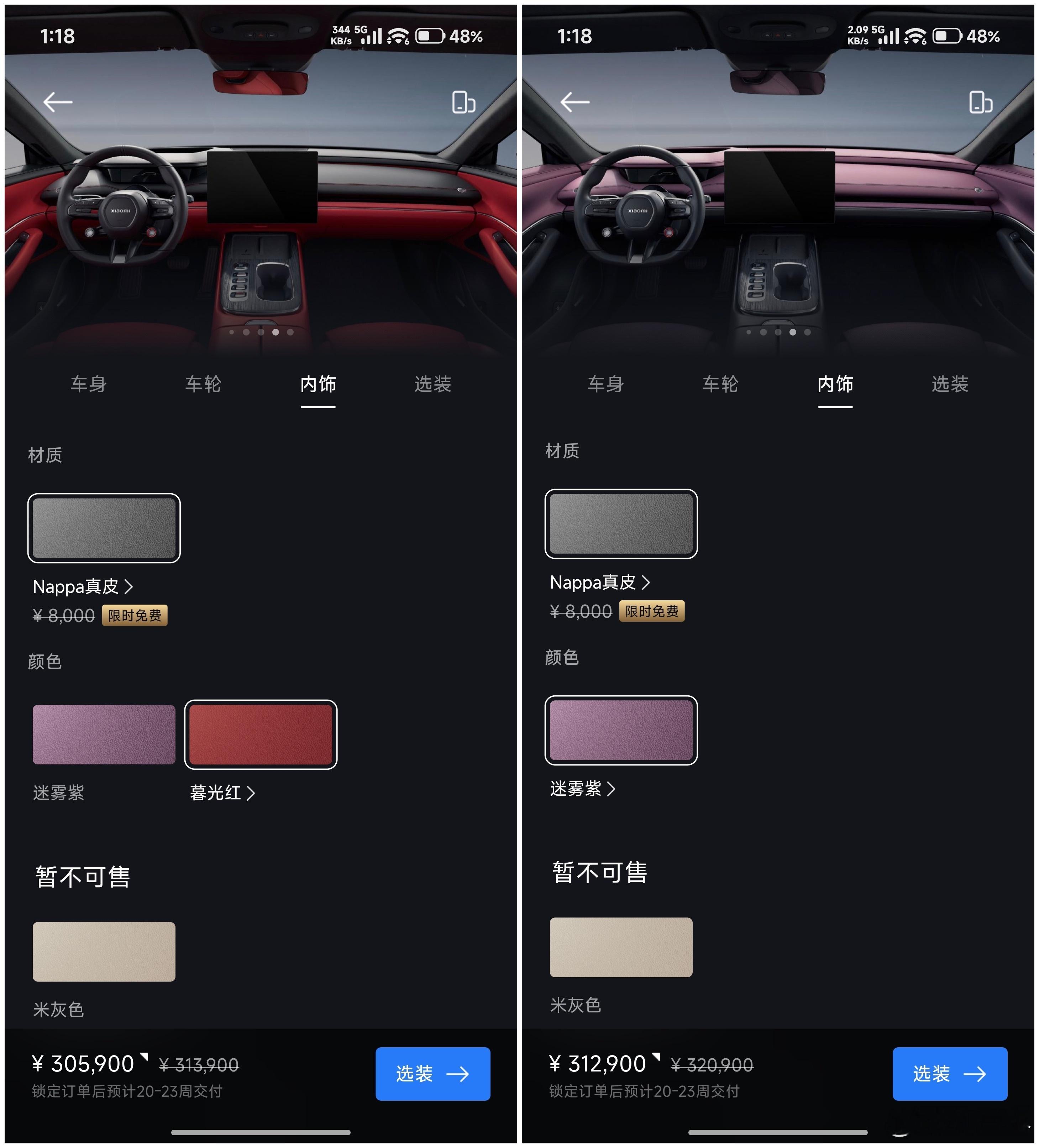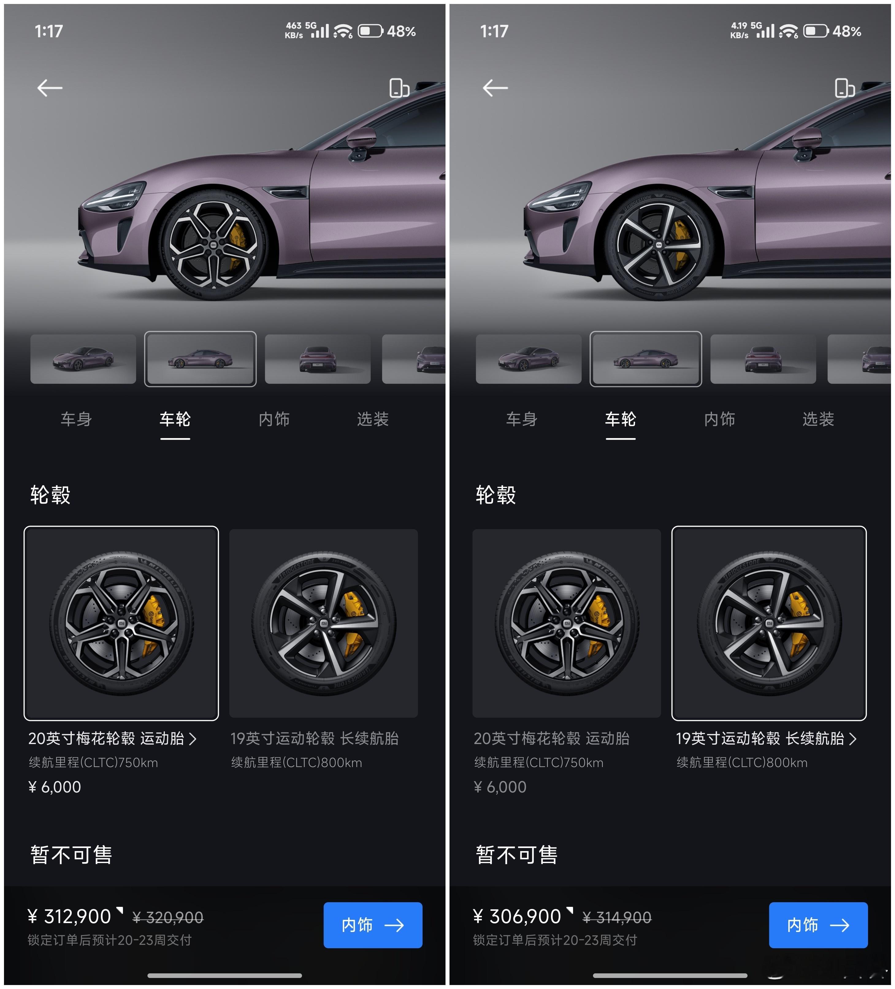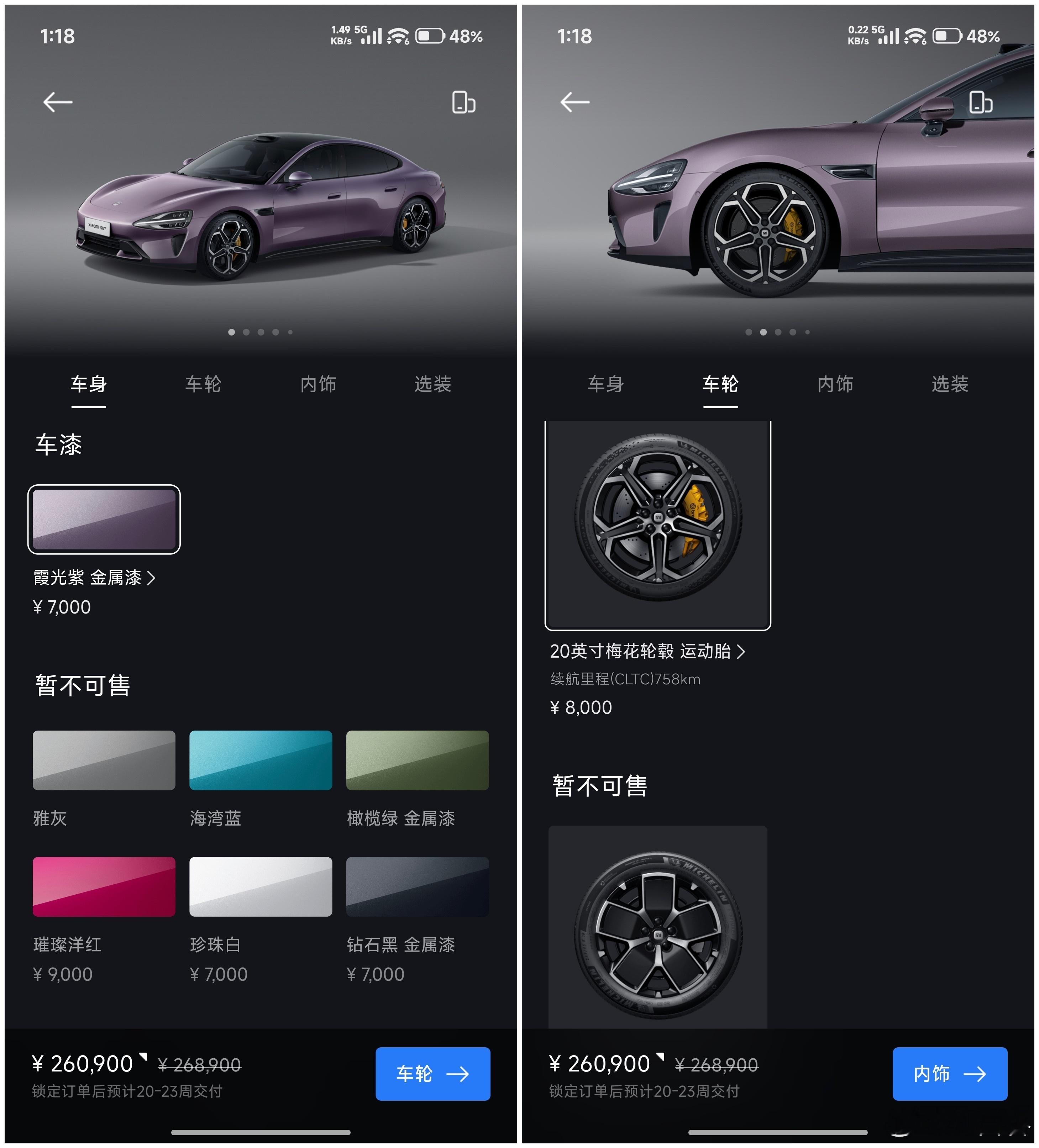 突发!SU7 选购重大调整三款配置均只可选雅灰和霞光紫,其他搭配也有调整SU7 标准版(图1-图3)共有 7 个 SKU霞光紫车漆仅可搭配 19" 低风阻轮毂和迷雾紫内饰雅灰车漆可搭配 19" / 20" 梅花轮毂和三种内饰SU7 Max(图4-图6)共有 4 个 SKU雅灰车漆仅可配 20" 梅花轮毂和迷雾紫 / 暮光红内饰霞光紫车漆配 19" 运动 / 20" 梅花轮毂和迷雾紫内饰图7:另外 SU7 标准版 / Max 均无法选装任何配置SU7 Pro(图8图9)仅有 1 个 SKU霞光紫车漆搭配 20" 梅花轮毂和迷雾紫内饰难得的是 Pro 支持选装尾翼,这也是仅剩的选装项换言之:SU7 在首次亮相超两年后,经过多次选配调整,目前仅剩最后的 12 个 SKU另外,SU7 所有现车和展车已全部下架,这是否说明……