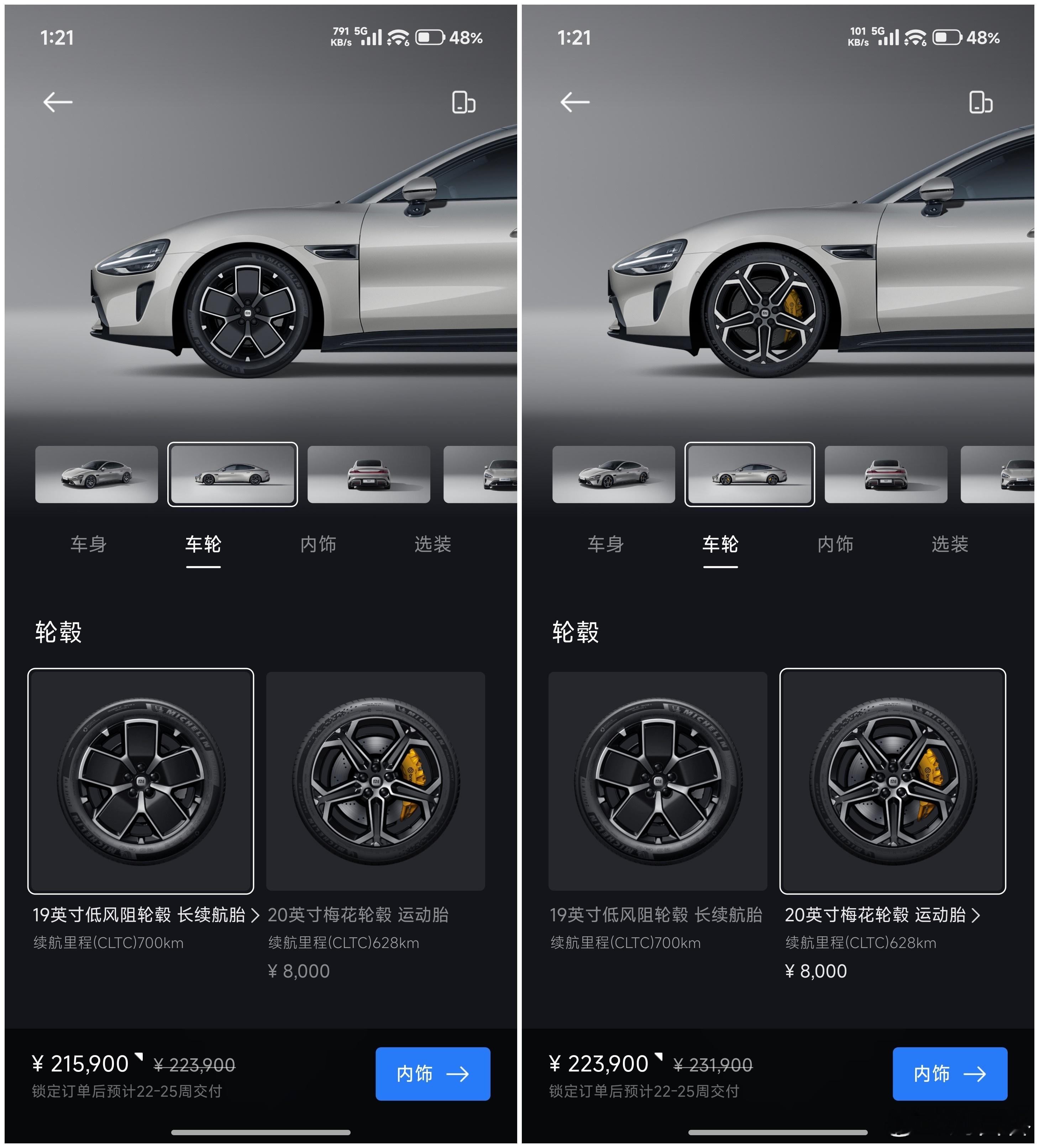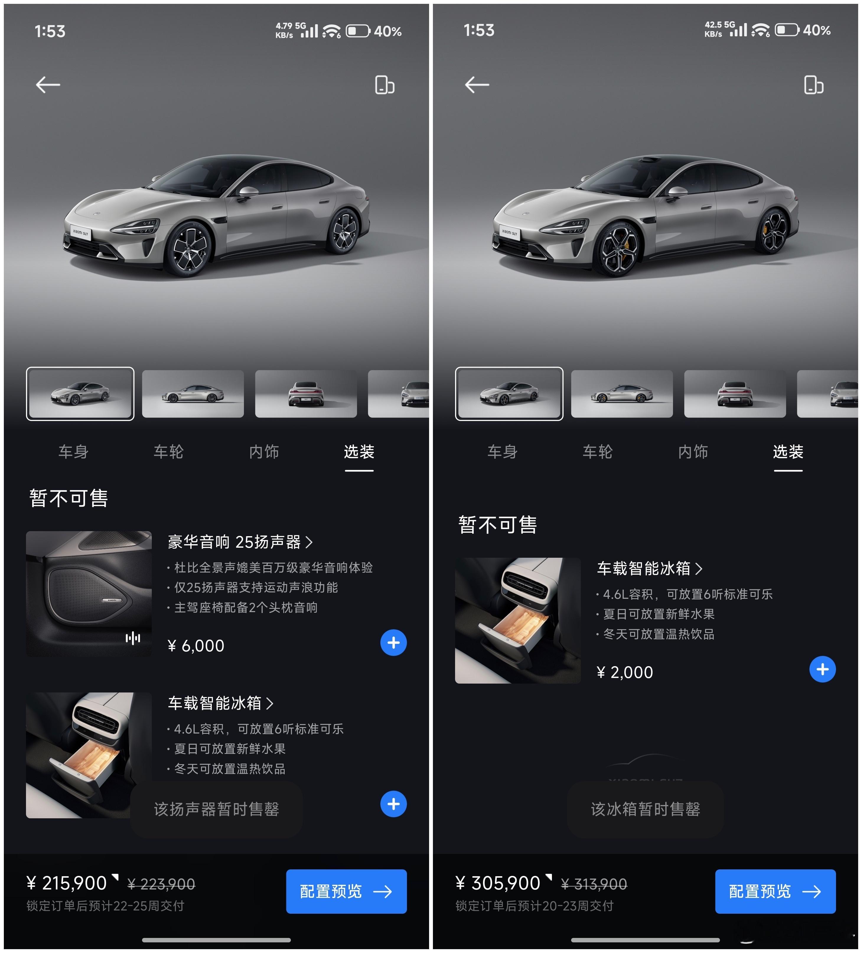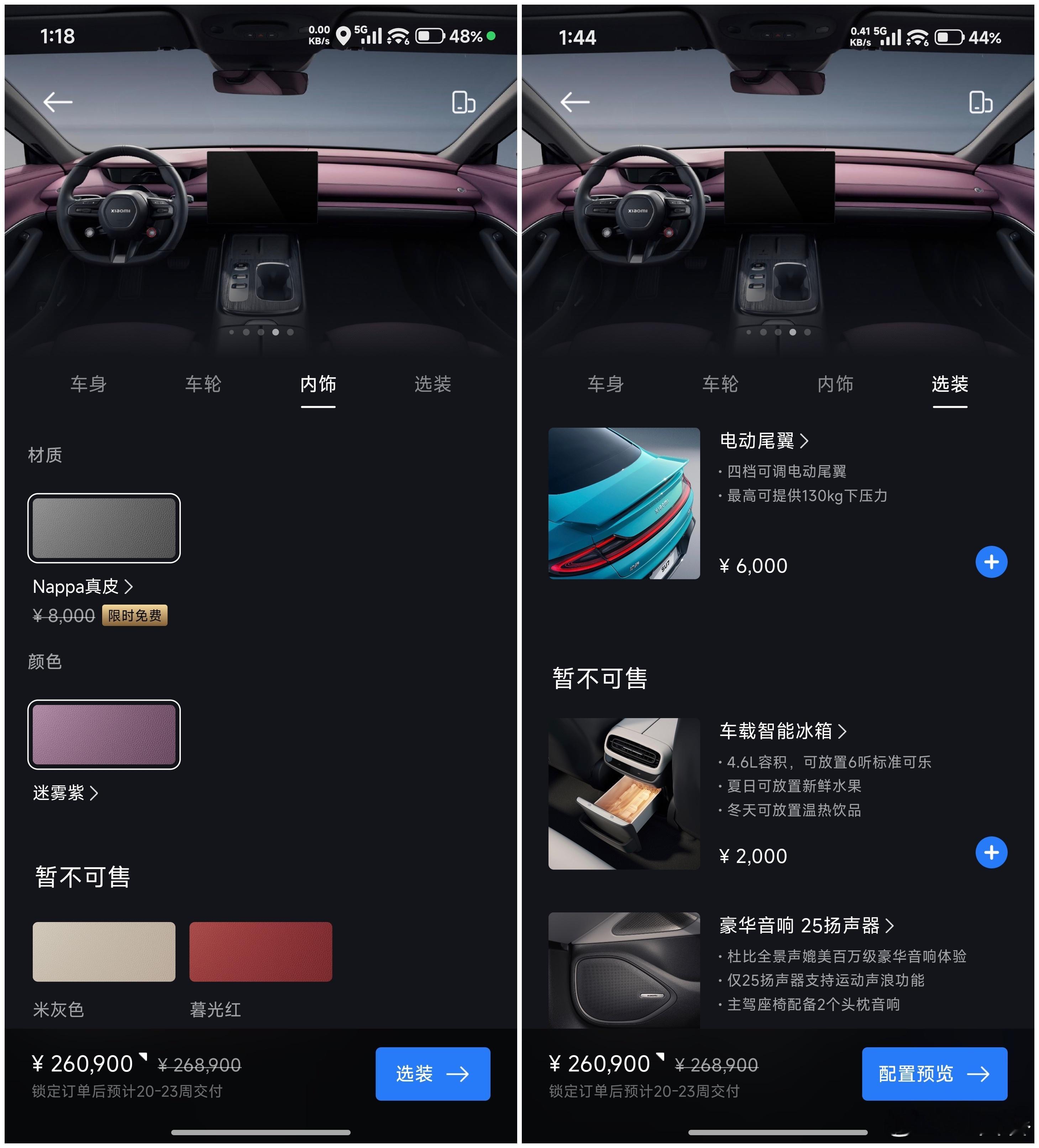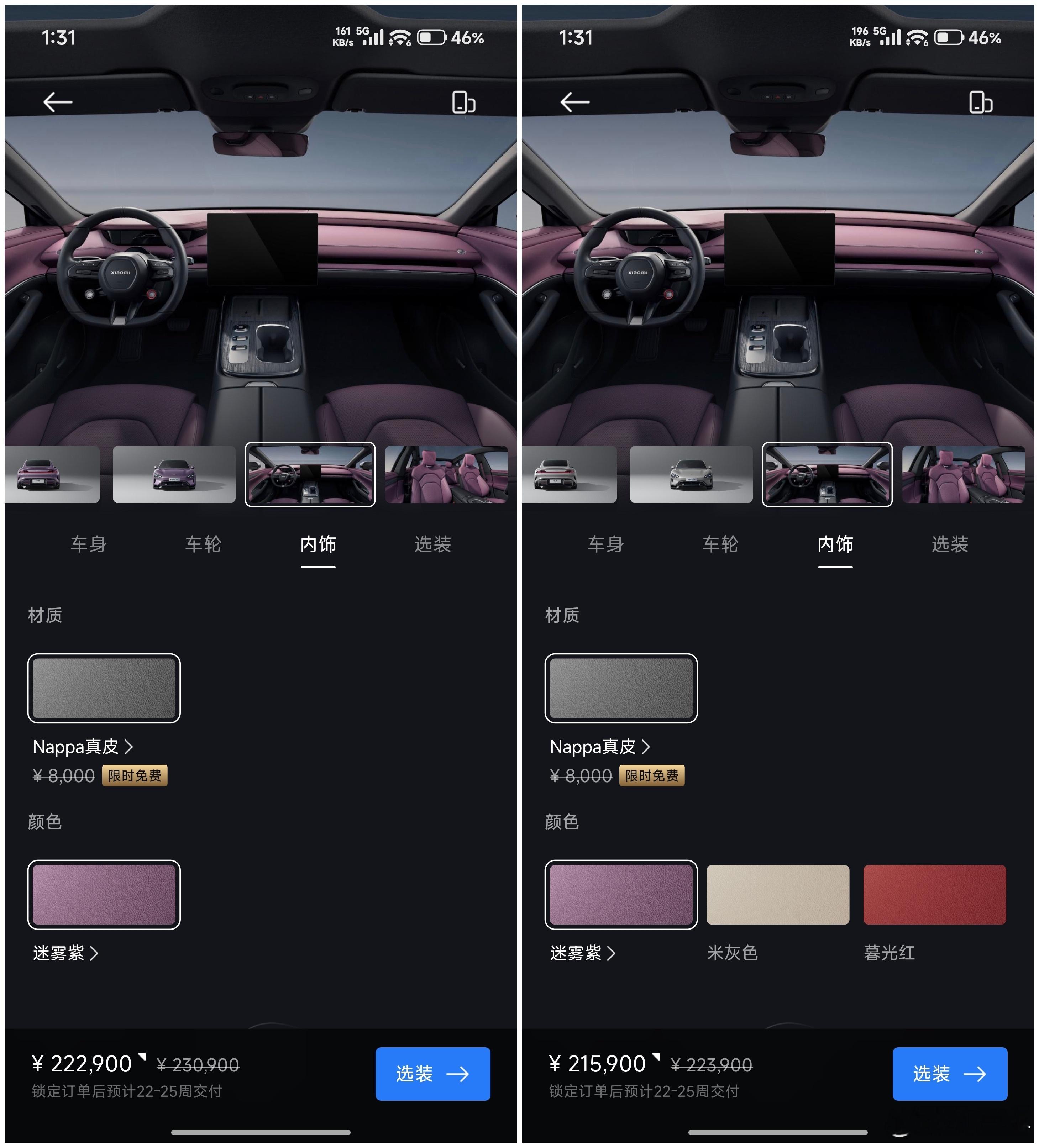 突发!SU7 选购重大调整三款配置均只可选雅灰和霞光紫,其他搭配也有调整SU7 标准版(图1-图3)共有 7 个 SKU霞光紫车漆仅可搭配 19" 低风阻轮毂和迷雾紫内饰雅灰车漆可搭配 19" / 20" 梅花轮毂和三种内饰SU7 Max(图4-图6)共有 4 个 SKU雅灰车漆仅可配 20" 梅花轮毂和迷雾紫 / 暮光红内饰霞光紫车漆配 19" 运动 / 20" 梅花轮毂和迷雾紫内饰图7:另外 SU7 标准版 / Max 均无法选装任何配置SU7 Pro(图8图9)仅有 1 个 SKU霞光紫车漆搭配 20" 梅花轮毂和迷雾紫内饰难得的是 Pro 支持选装尾翼,这也是仅剩的选装项换言之:SU7 在首次亮相超两年后,经过多次选配调整,目前仅剩最后的 12 个 SKU另外,SU7 所有现车和展车已全部下架,这是否说明……