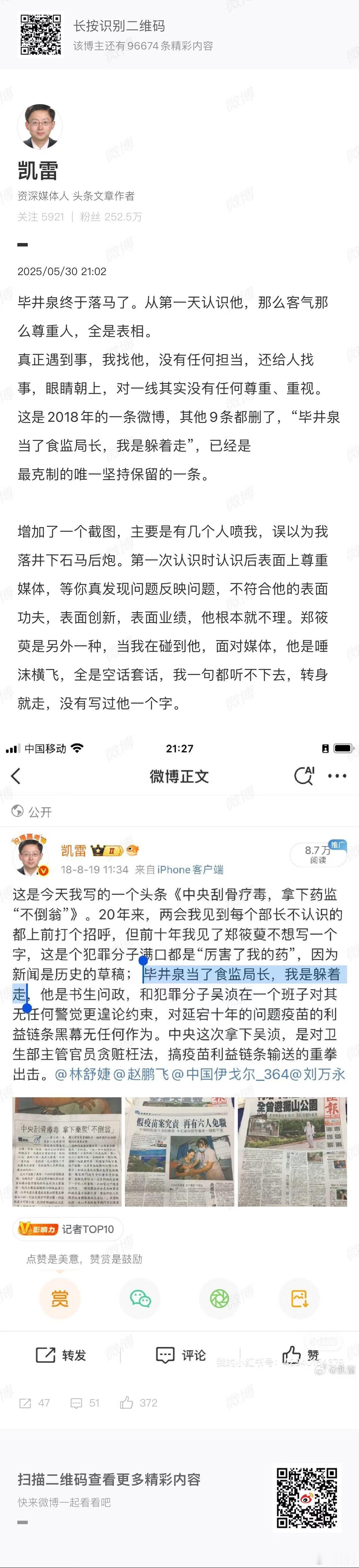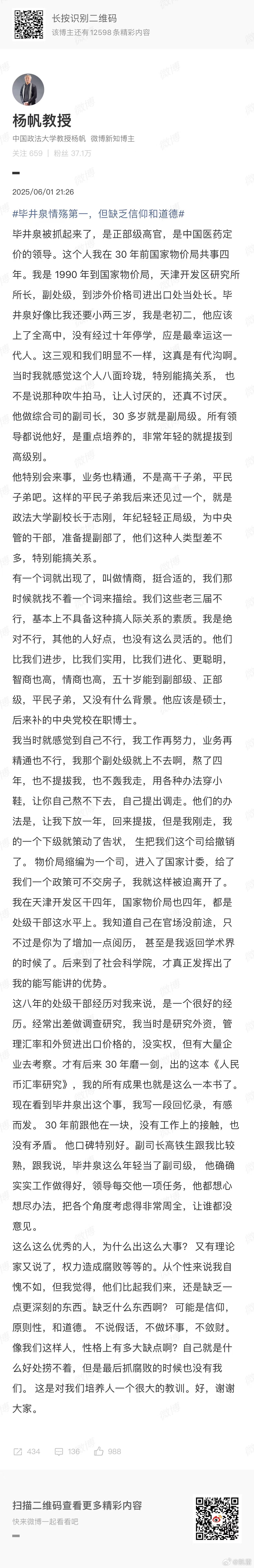 2025等到的一个事:毕井泉落马。两个图⬇️第一个图,2018年“毕井泉当了食监局长,我是躲着走”,等了七年,他结了两次婚终于落马。还有好几个,尽欺负人瞎干事瞎整人的,还高高在上,未来五年2030等得到。第二个图,2000年25年前的夏天在三峡游船上认识的政法大学杨帆教授,和他一起掉进江里又一起被捞上来幸好有安全背心背带,刚好和他坐在一排就两个人,等眼镜也一把捞起来就这样认识了听了他的上班经历难忘。他的微博,1990年35年前他与毕井泉被迫呆在一起上班,在国家物价局缩成一个司并入国家计委前的这四年,对毕进泉的印象六个字:沒原则高情殇。 【中纪委连打三虎】中央纪委国家监委网站12月8日发布三条“打虎”消息:十四届全国政协原常委、经济委员会原副主任毕井泉严重违纪违法被开除党籍和公职经中共中央批准,中央纪委国家监委对十四届全国政协原常委、经济委员会原副主任毕井泉严重违纪违法问题进行了立案审查调查。经查,毕井泉丧失理想信念,背弃初心使命,对抗组织审查;违反中央八项规定精神,违规收受礼金,违规借用私营企业主车辆,接受可能影响公正执行公务的宴请以及旅游、打高尔夫球等活动安排;违背组织原则,不按规定报告个人有关事项,在职工录用等工作中为他人谋取利益并收受财物;廉洁底线失守,由他人支付应当由其个人支付的费用,违规为亲属谋取利益;家风不正,对配偶、子女失管失教;将党和人民赋予的公权力异化为谋取私利的工具,大肆收钱敛财,利用职务便利为他人在企业经营、职工录用等方面谋利,并非法收受巨额财物。毕井泉严重违反党的政治纪律、组织纪律、廉洁纪律和生活纪律,构成严重职务违法并涉嫌受贿犯罪,且在党的十八大后不收敛、不收手,性质严重,影响恶劣,应予严肃处理。依据《中国共产党纪律处分条例》《中华人民共和国监察法》《中华人民共和国公职人员政务处分法》等有关规定,经中央纪委常委会会议研究并报中共中央批准,决定给予毕井泉开除党籍处分;由国家监委给予其开除公职处分;收缴其违纪违法所得;将其涉嫌犯罪问题移送检察机关依法审查起诉,所涉财物一并移送。广西壮族自治区政协原党组成员、副主席彭晓春严重违纪违法被开除党籍经中共中央批准,中央纪委国家监委对广西壮族自治区政协原党组成员、副主席彭晓春严重违纪违法问题进行了立案审查调查。经查,彭晓春丧失理想信念,背离初心使命,履行全面从严治党主体责任不力,对抗组织审查;违反中央八项规定精神,违规接受宴请和旅游活动安排;不按规定报告个人有关事项,在组织谈话时不如实说明问题;违规收受礼品、礼金,违规拥有非上市公司股份;贪婪无度,大搞权钱交易,利用职务便利为他人在工程承揽、款项拨付等方面谋利,并非法收受巨额财物。彭晓春严重违反党的政治纪律、组织纪律、廉洁纪律和生活纪律,构成严重职务违法并涉嫌受贿犯罪,且在党的十八大后不收敛、不收手,性质严重,影响恶劣,应予严肃处理。依据《中国共产党纪律处分条例》《中华人民共和国监察法》《中华人民共和国公职人员政务处分法》等有关规定,经中央纪委常委会会议研究并报中共中央批准,决定给予彭晓春开除党籍处分;按规定取消其享受的待遇;终止其广西壮族自治区第十二次党代会代表资格;收缴其违纪违法所得;将其涉嫌犯罪问题移送检察机关依法审查起诉,所涉财物一并移送。北京大学原党委常委、副校长任羽中严重违纪违法被开除党籍和公职经中共中央批准,中央纪委国家监委对北京大学原党委常委、副校长任羽中严重违纪违法问题进行了立案审查调查。经查,任羽中丧失理想信念,背弃初心使命,违反中央八项规定精神,违规收受礼品、礼金;不按规定报告个人有关事项,在职工录用工作中为他人谋取利益;违规拥有非上市公司股份;毫无纪法底线,公器私用,“靠校吃校”,搞权钱交易,利用职务便利为他人在教育培训、升学就业等方面谋利,并非法收受巨额财物。任羽中严重违反党的组织纪律和廉洁纪律,构成严重职务违法并涉嫌受贿犯罪,且在党的十八大后不收敛、不收手,性质严重,影响恶劣,应予严肃处理。依据《中国共产党纪律处分条例》《中华人民共和国监察法》《中华人民共和国公职人员政务处分法》等有关规定,经中央纪委常委会会议研究并报中共中央批准,决定给予任羽中开除党籍处分;由国家监委给予其开除公职处分;收缴其违纪违法所得;将其涉嫌犯罪问题移送检察机关依法审查起诉,所涉财物一并移送。(中央纪委国家监委网站)