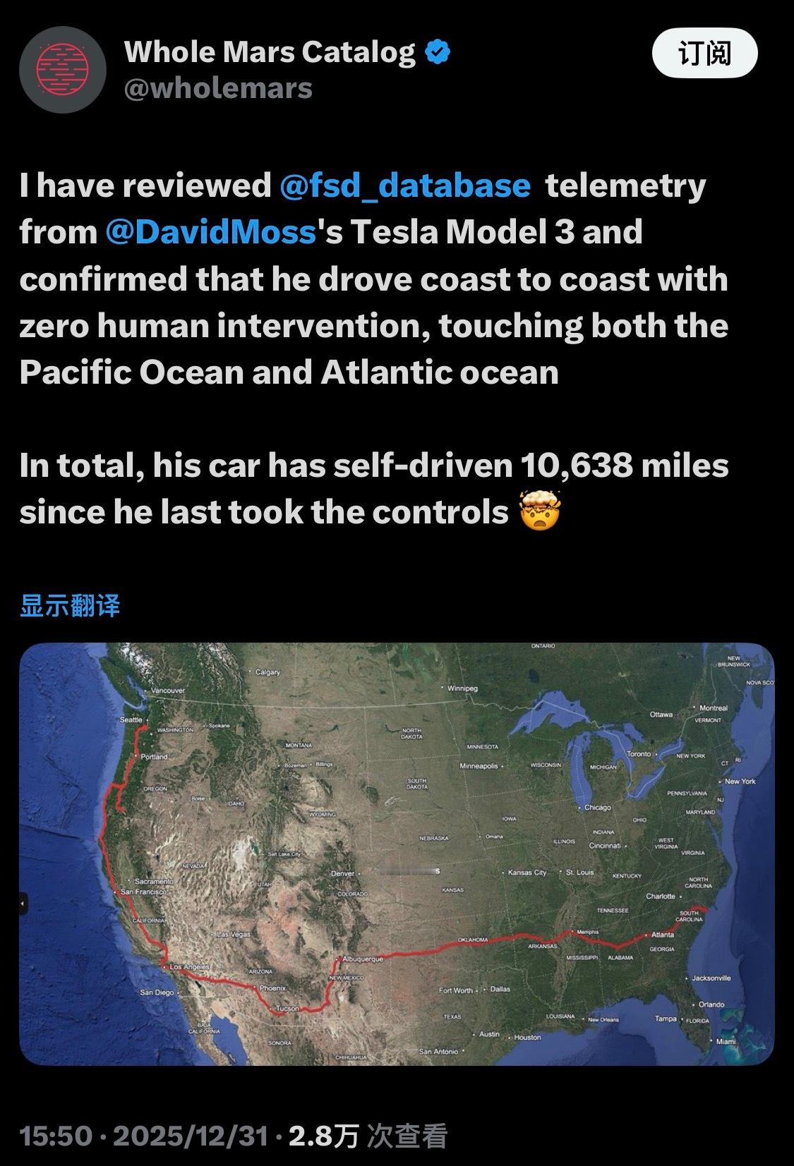 2025年的最后一天,来自美国的Divid Moss完成了人类历史上第一次横跨美国东西海岸的无人工干预的全自动驾驶,全程2732.4英里(约4400公里),用时2天20小时。在全自动驾驶技术接近成熟之际,美国的华尔街已经嗅到了金钱的味道,现在他们就在等一件事——埃隆·马斯克宣布正式取消特斯拉无人出租车内的安全员。这是一件可以彻底改变交通出行行业,甚至改写人类文明历史的事情。特斯拉汽车财经a股