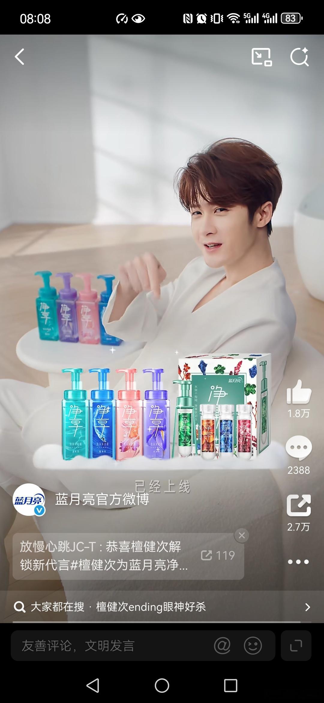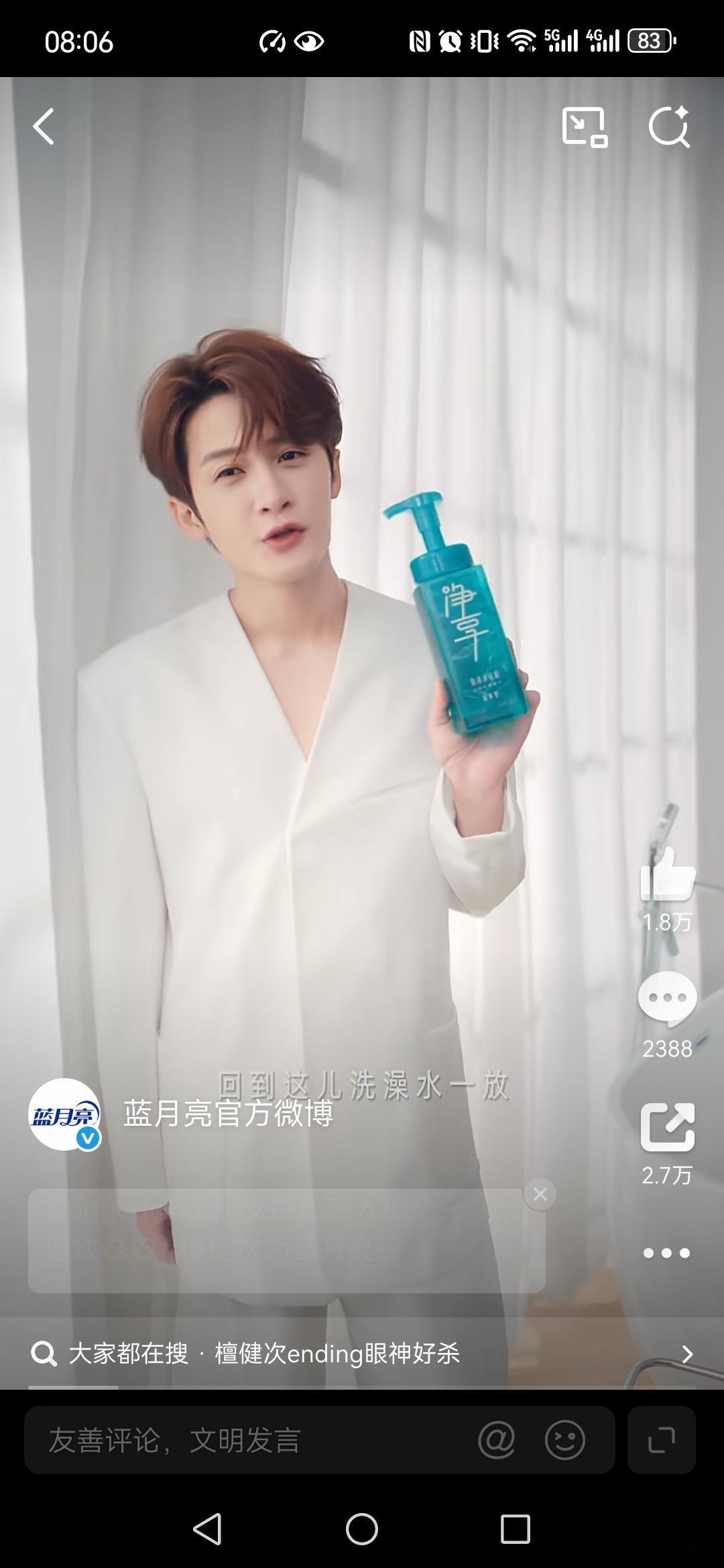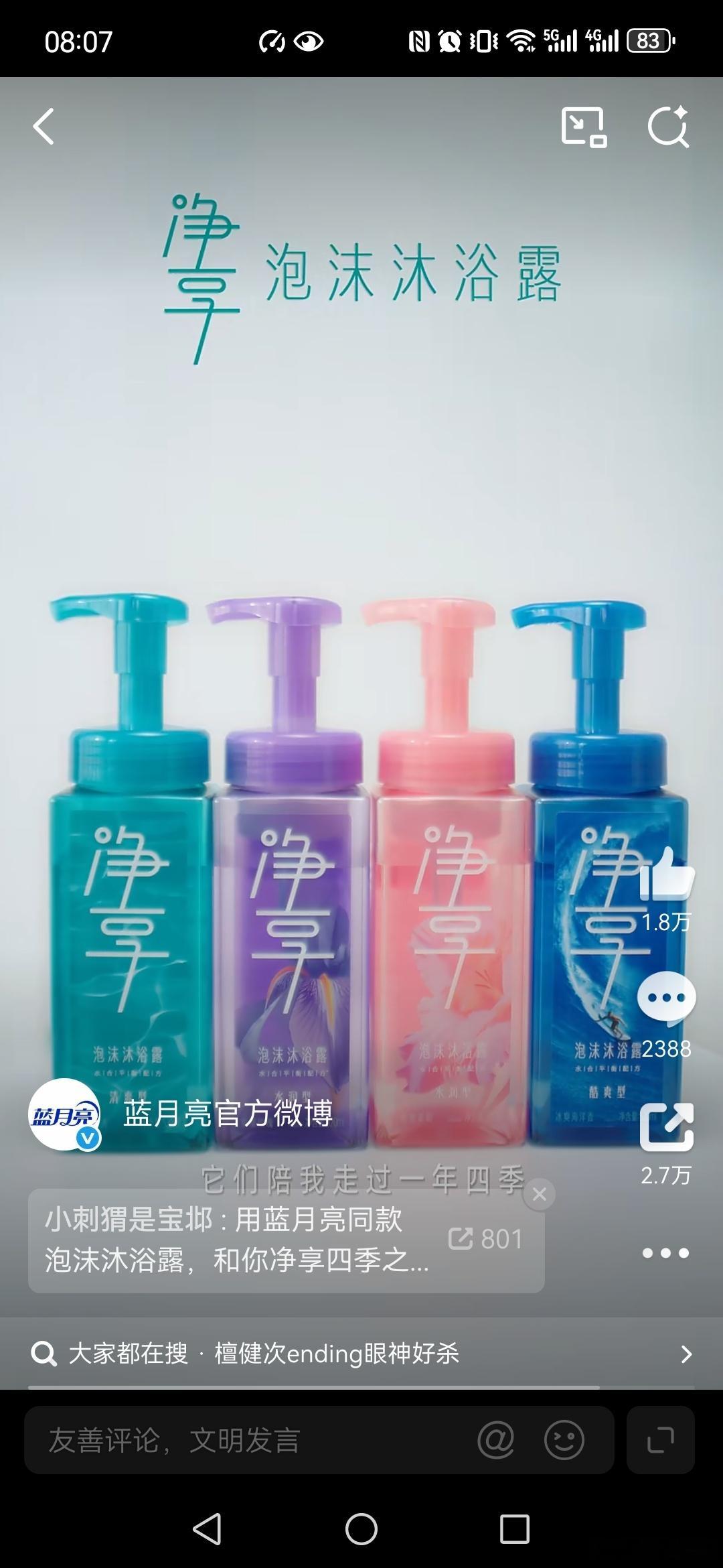 檀健次为蓝月亮净享沐浴全球代言檀健次蓝月亮净享全球代言人 恭喜成为蓝月亮净享泡沫沐浴露代言人,也感谢他和大家一起分享沐浴灵感。其实我也一直用的蓝月亮净享泡沫沫沐浴露。我和大家分享一下我的使用感受: 一是表现优秀,在保湿,清洁,体验方面表现的都令人满意。 清洁能力不错,可以高效去污,采用微米泡沫科技,可以深入毛孔清洁污垢、油脂和灰尘,不需要用力搓洗,轻松去污。涂抹后冲洗就可以。泡沫容易被冲走, 保湿性能不错,温和舒服,洗后皮肤水润有弹性,不易干燥紧绷,其采用氨基酸表活配方,刺激性小,皮肤清爽舒适,有青柠茶香、冰爽海洋香等多种香型可供选择,香味时间久,携带方便。