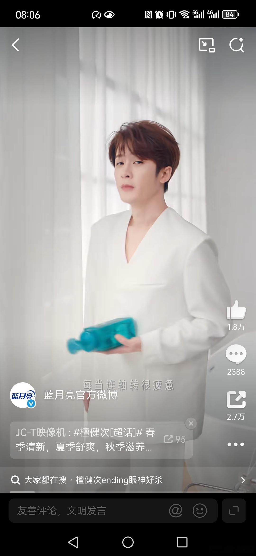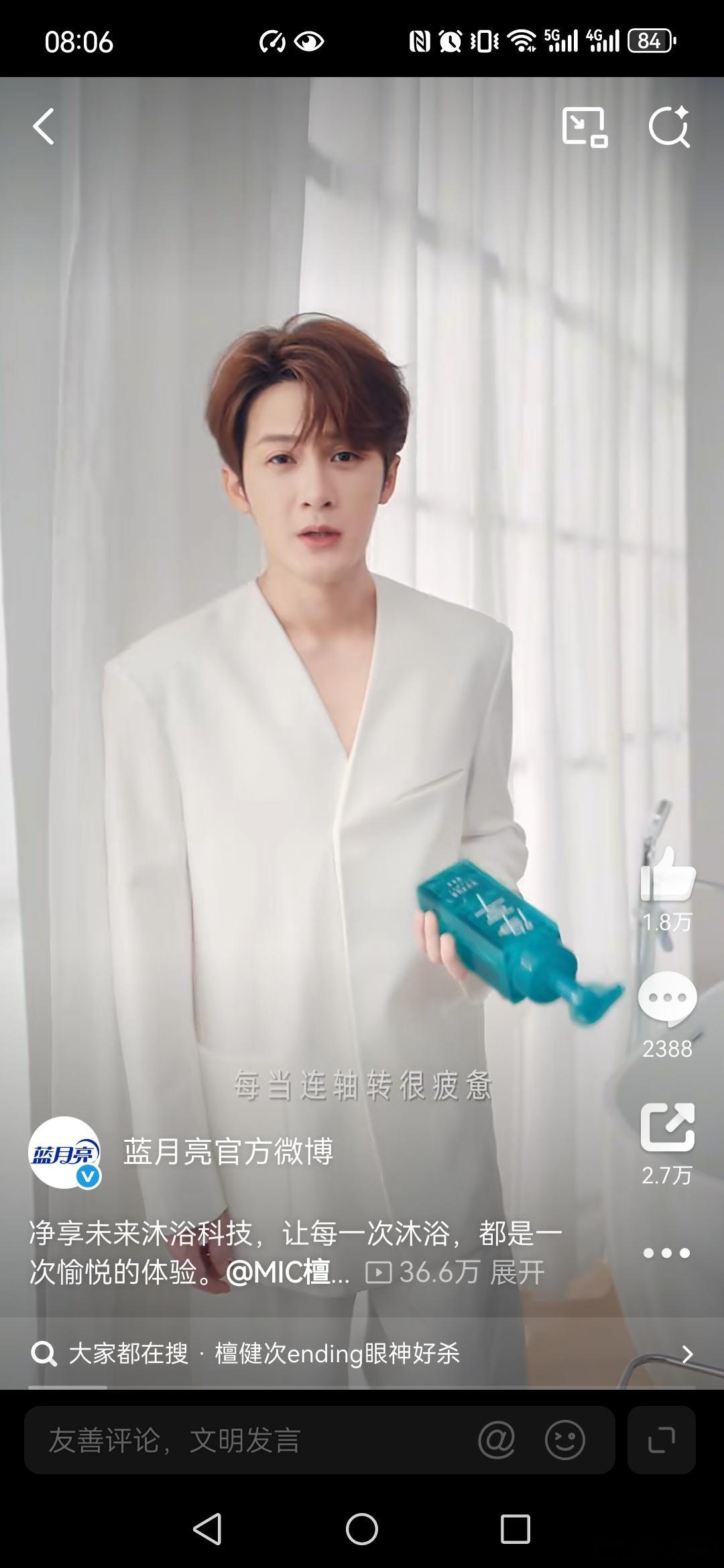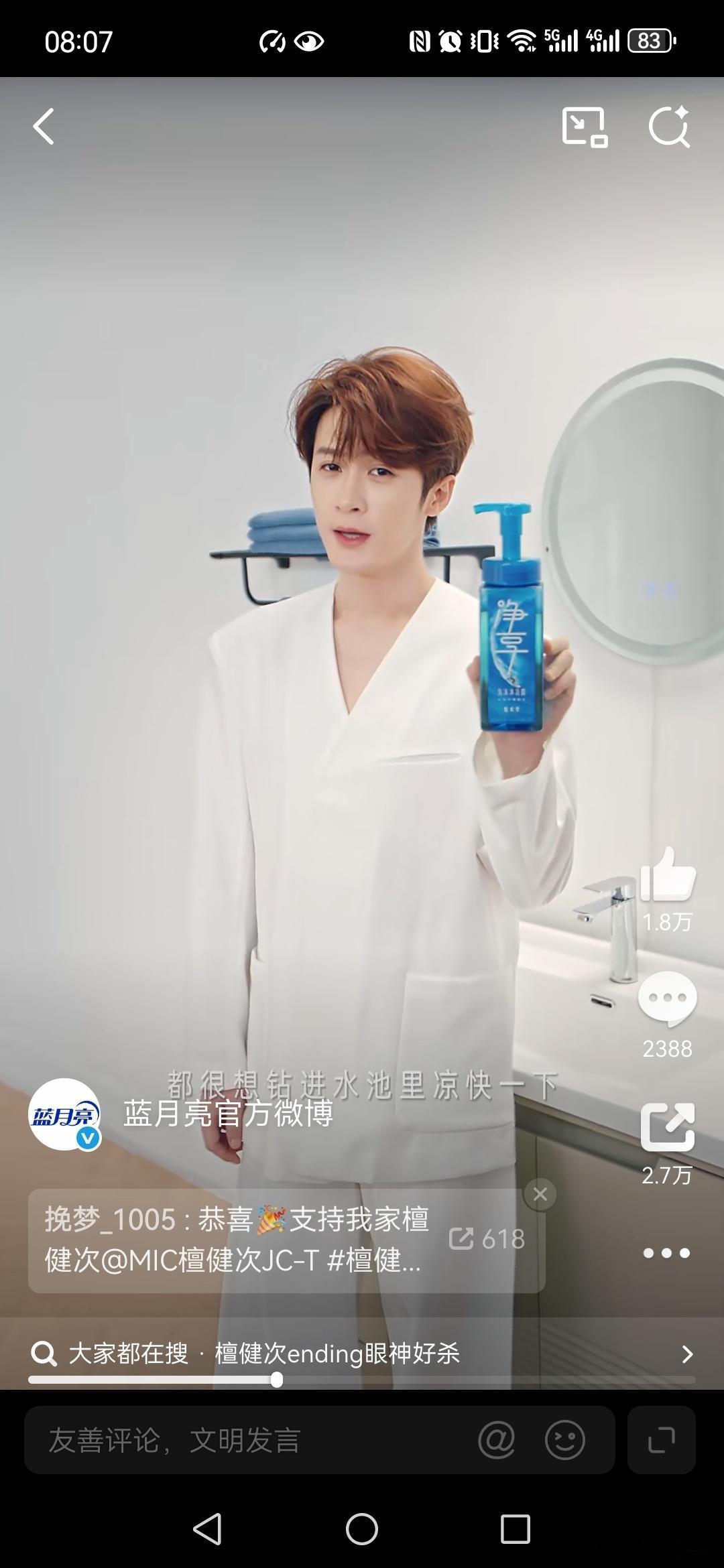 檀健次为蓝月亮净享沐浴全球代言檀健次蓝月亮净享全球代言人 恭喜成为蓝月亮净享泡沫沐浴露代言人,也感谢他和大家一起分享沐浴灵感。其实我也一直用的蓝月亮净享泡沫沫沐浴露。我和大家分享一下我的使用感受: 一是表现优秀,在保湿,清洁,体验方面表现的都令人满意。 清洁能力不错,可以高效去污,采用微米泡沫科技,可以深入毛孔清洁污垢、油脂和灰尘,不需要用力搓洗,轻松去污。涂抹后冲洗就可以。泡沫容易被冲走, 保湿性能不错,温和舒服,洗后皮肤水润有弹性,不易干燥紧绷,其采用氨基酸表活配方,刺激性小,皮肤清爽舒适,有青柠茶香、冰爽海洋香等多种香型可供选择,香味时间久,携带方便。