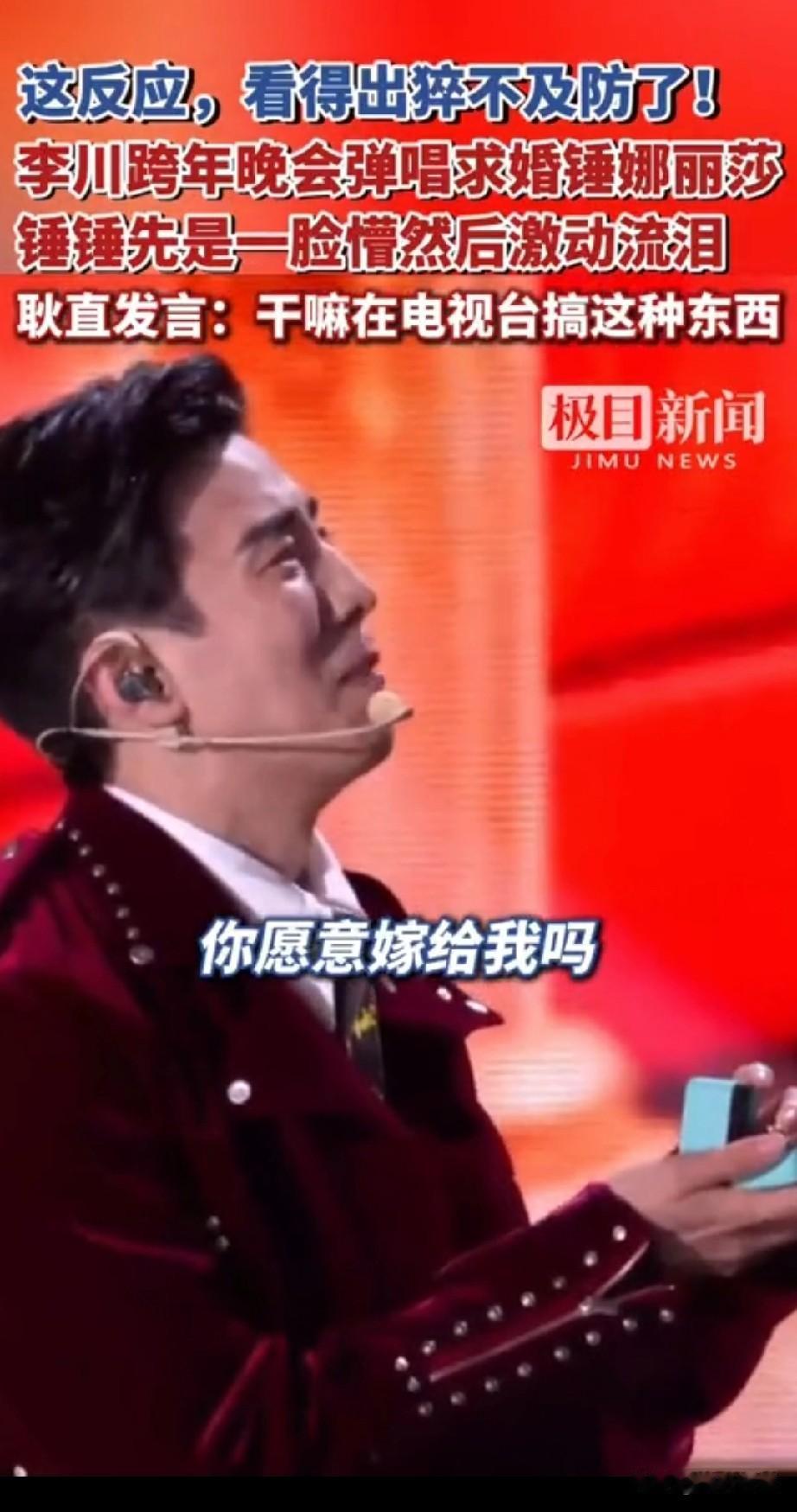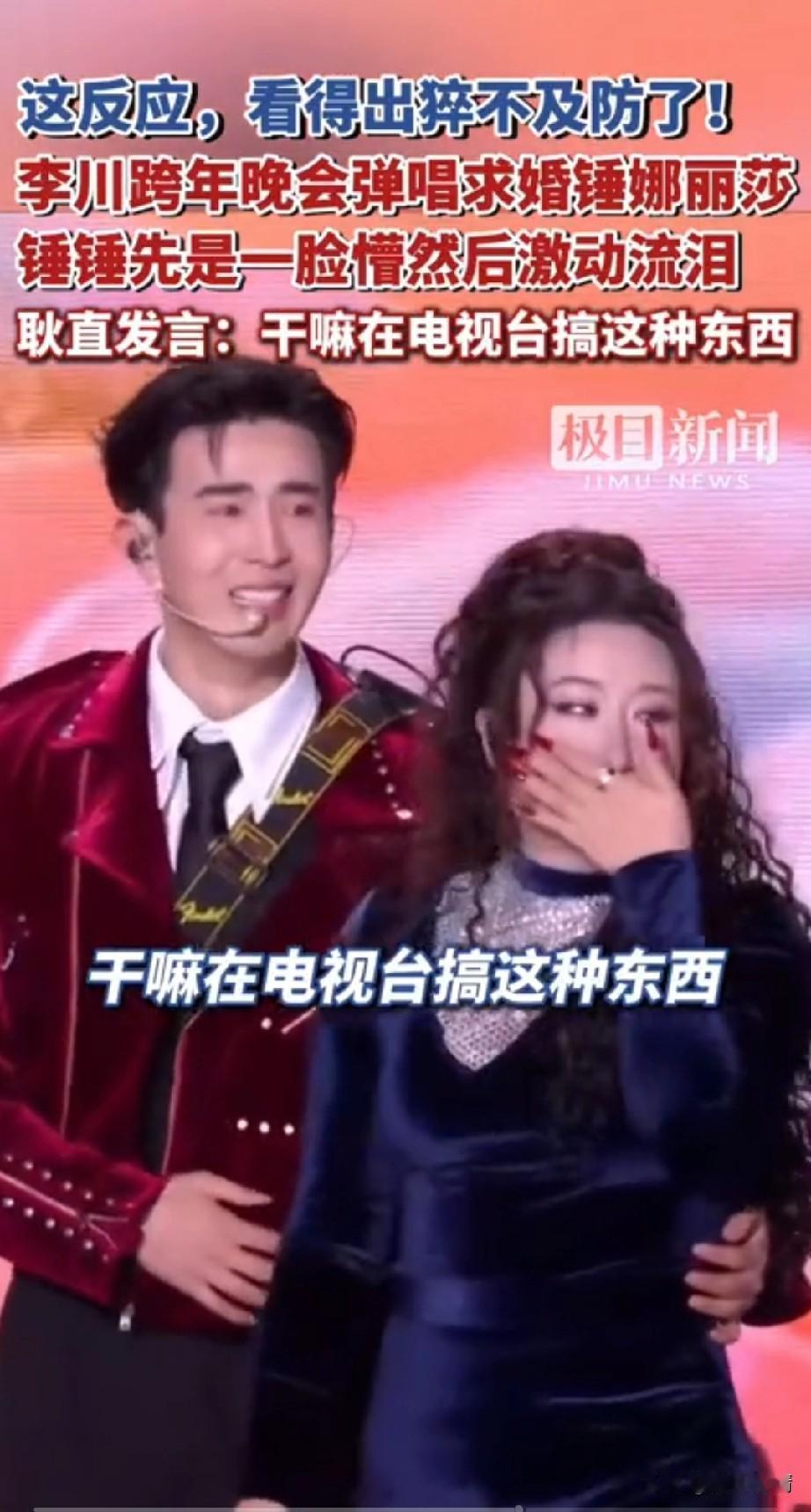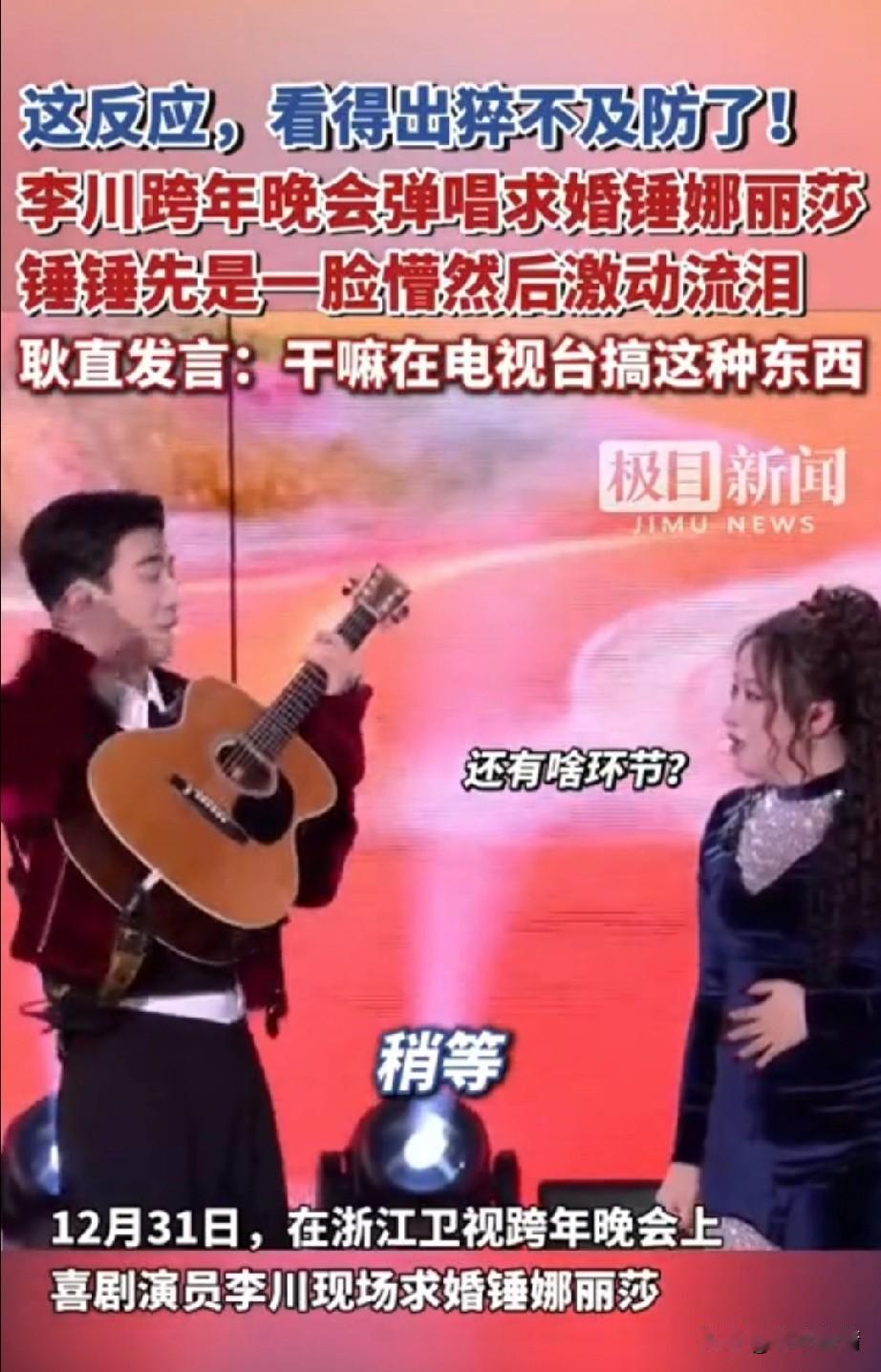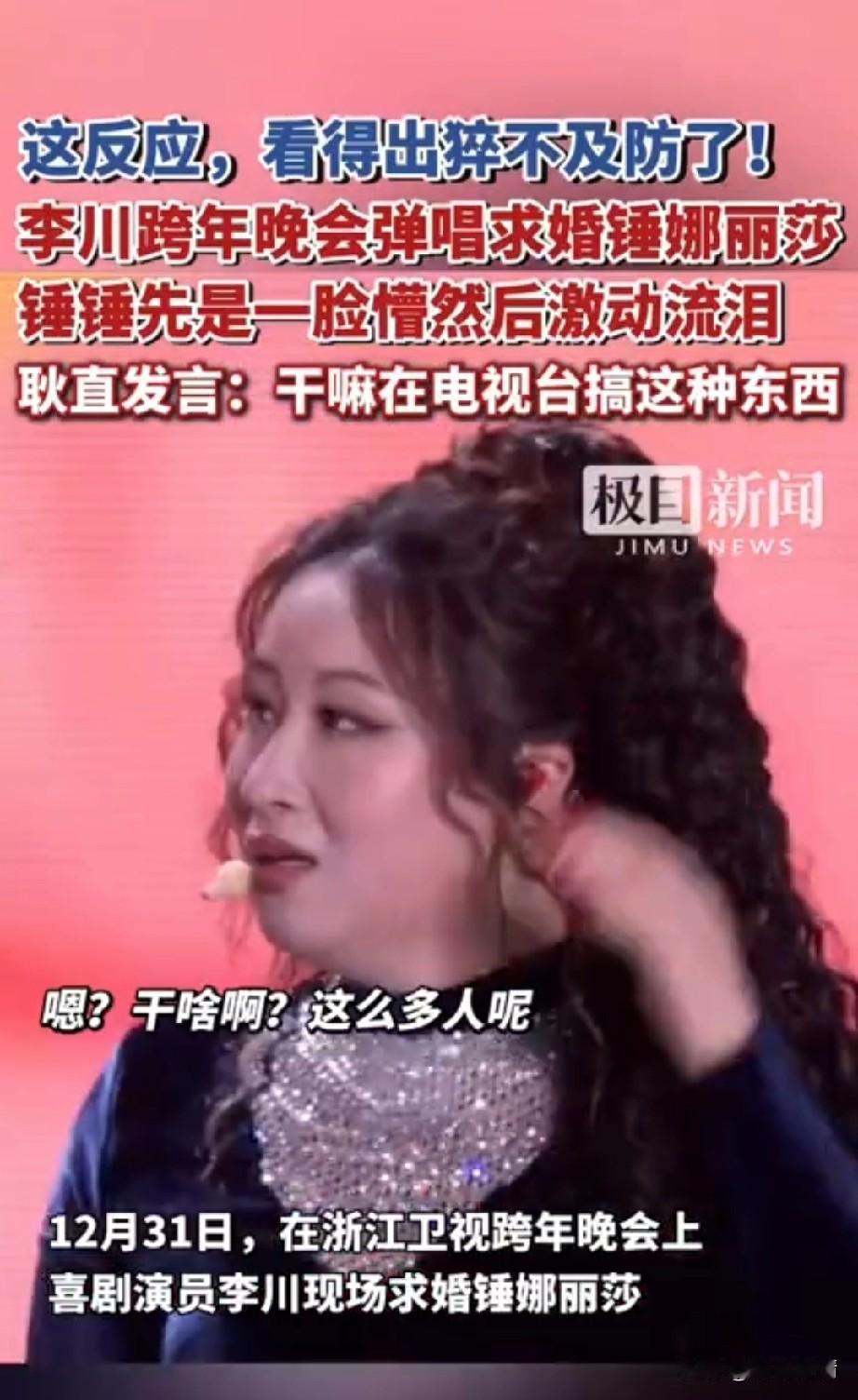 谁能想到?大龄优质女的梦想实现了! 油腻霸总李川居然向锤丽娜莎求婚了, 昨晚浙江跨年晚会现场, 高大帅气的喜剧演员李川居然会来这出,这狗粮撒的让浙江观众猝不及防! 锤丽娜莎靠搞笑出名, 可以说是真的相貌平平, 和凤姐有的一拼, 李川居然会向她求婚, 让现场的观众惊讶不已, 锤丽娜莎算是李川的老板, 年龄也比李川大很多, 这样的求婚真的很少见, 崔丽娜莎现场被吓傻, 她的表情看得出来很意外, 还以为是李川新的喜剧 老板,我不想努力了, 结果却是真的, 李春直接弹唱向垂丽娜莎求婚, 这场姐弟恋,直接将锤地那啥感动哭了,锤锤先是一脸懵然后激动落泪, 耿直发言干嘛在电视台搞这种东西? 你不害臊,我还害臊呢! 把现场观众逗的哈哈大笑, 喜剧演员真的不简单, 能是把求婚现场秒变喜剧现场, 大家对于李川和垂丽娜莎的恋情怎么看? 跨年 姐弟恋 浙江跨年演唱会 李川 李川锤娜丽莎恋情