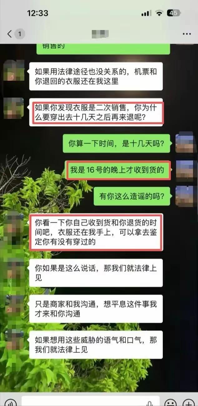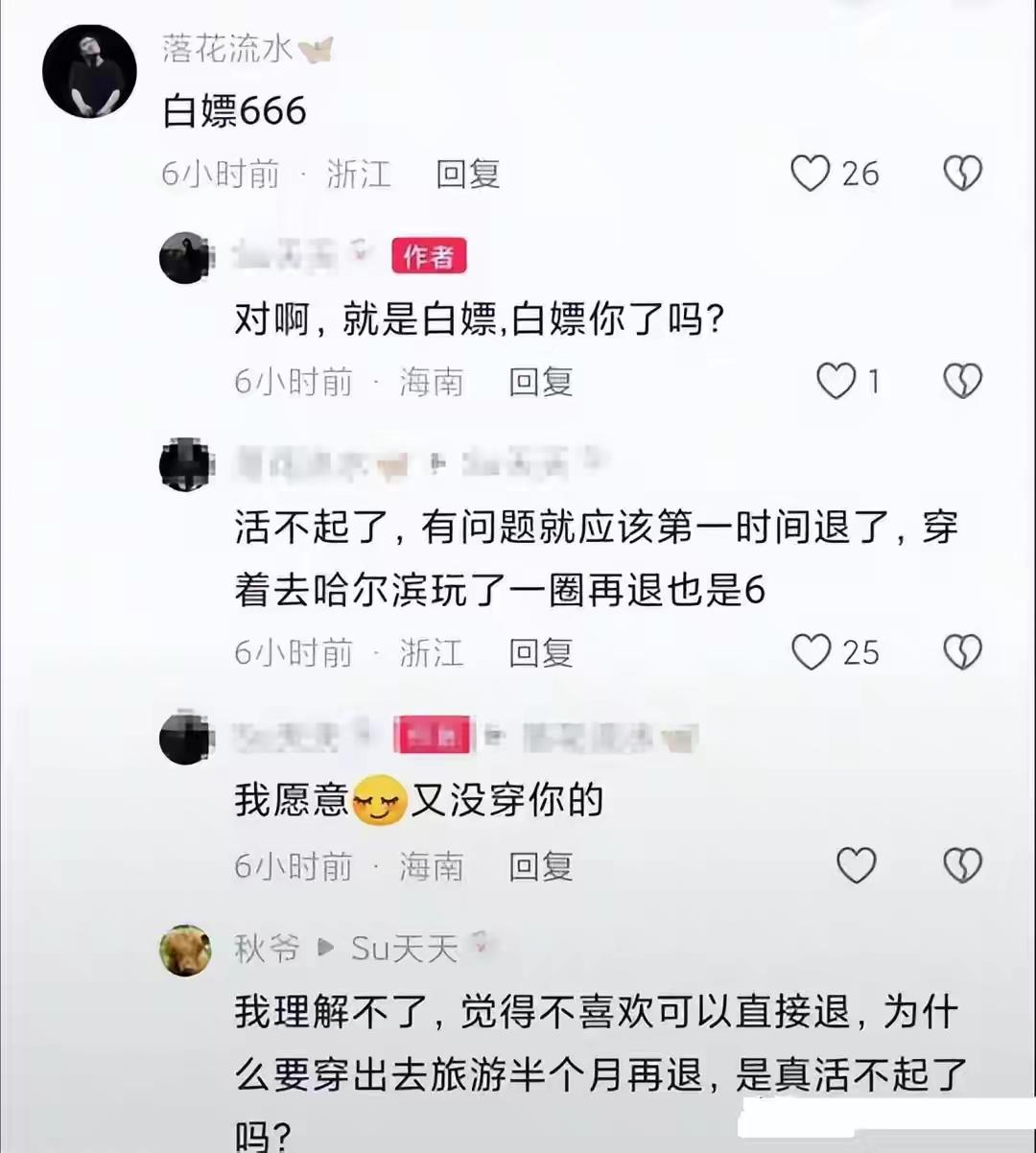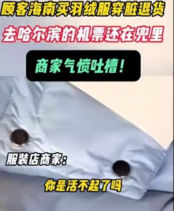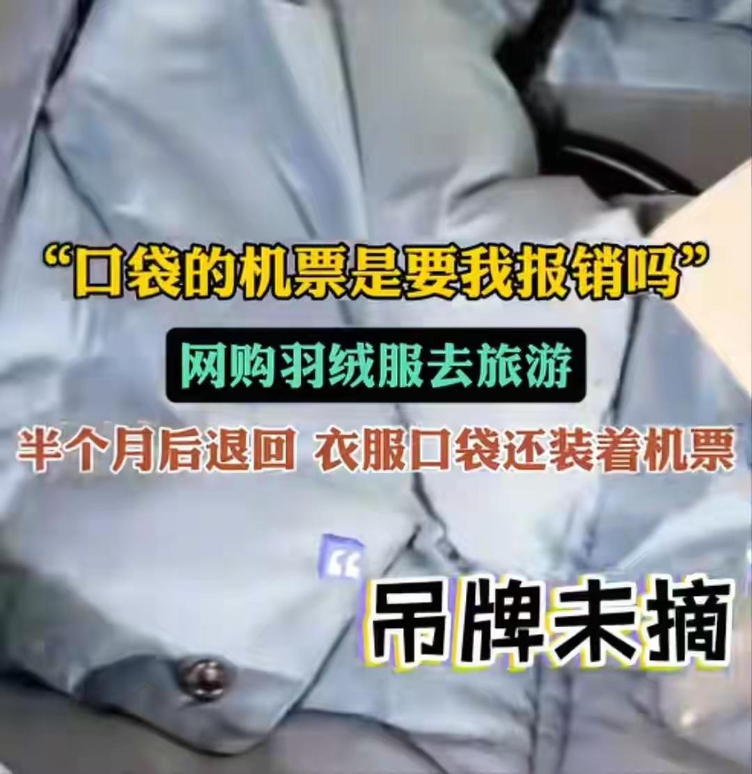 这张遗落在口袋里的机票,就像一个沉默的证人,把真相讽刺的露出来,更像一枚被意外引爆的地雷,瞬间炸碎了“七天无理由”的保护壳。 商家,顾客,无一幸免。 原本这是一个普通再普通的事情。 衣服不合适,七天无理由退货。 可是,口袋里装着的飞机票,却说明了一切。 从海南三亚到冰城哈尔滨,这张飞机票,勾勒出了这件羽绒服过去几天的真实旅程。 商家收到退回的羽绒服,退回工厂,让工厂把污渍处理,别影响二次销售。 工厂的工作人员从羽绒服口袋里,掏出来那个“不会说话”的证人。 让人感到讽刺的“铁证”,口袋里掏出的纸片,一张赫然印着苏女士姓名、航班号以及目的地的登机牌。 这工厂的无名火就起来了。 妥妥的白嫖证据,证据确凿。 他们没有和商家商量,直接曝光了这件事情。 随后,苏女士开始被网友找到。 社交平台里面的内容,一览无余。 她穿着那件退掉的羽绒服,视频,照片,更是让网友扒出来了。 现在,苏女士成了白嫖的对象,让人指指点点。 听说连她的高中老师都知道了。 苏女士受不了,她报警了。 报警的结果,是那个卖羽绒服的商家,也被牵连,不让他们继续开网店。 羽绒服商家觉得冤枉,这个事情不是他们曝光的,可是却要他们承担责任。 本来是简简单单的事情。 可是,苏女士穿了衣服去旅游一番后,又觉得不合适,退货退款了。 可她又把证据留在了口袋里。 这只能怨自己蠢。 为什么要有白嫖的心理? 换位思考,如果自己是开网店的店家,会怎么想,怎么办呢? 衣服买回家,试穿一下,不合适就退,很正常。 这穿了好几天又说不合适,这又算哪般? 这不是白嫖,又是什么? 现在,很多人钻着七天无理由退货的这个理由,白嫖七天新衣服穿。 这样子的小心思,这样子的占便宜的心理,让人觉得过分。 现在,苏女士也有了这样子的心理,她也这么干了。 可是,她很不幸 ,自己打了自己的脸。 有时候啊,这赚小便宜的事情,还是不要做了。 自己苦苦经营的信誉,被一张纸片大摆了一道。 得不偿失啊! 大家说是不是这个理?
