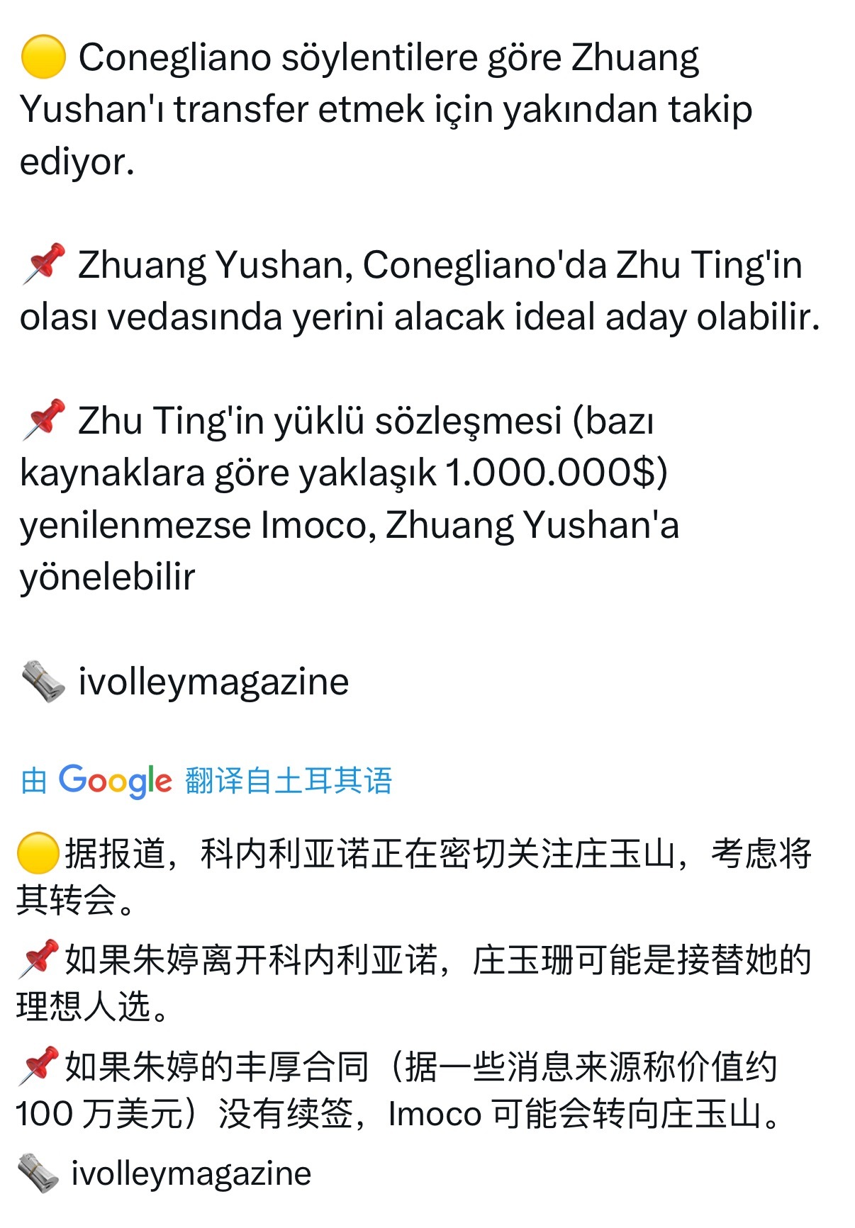 🟡据ivolleymagazine报道,科内利亚诺正在密切关注庄宇珊,考虑将其转会。📌如果朱婷离开科内利亚诺,庄宇珊可能是接替她的理想人选。📌如果朱婷的丰厚合同(据一些消息来源称价值约 100 万美元)没有续签,科内利亚诺可能会转向庄宇珊。国际排坛动态