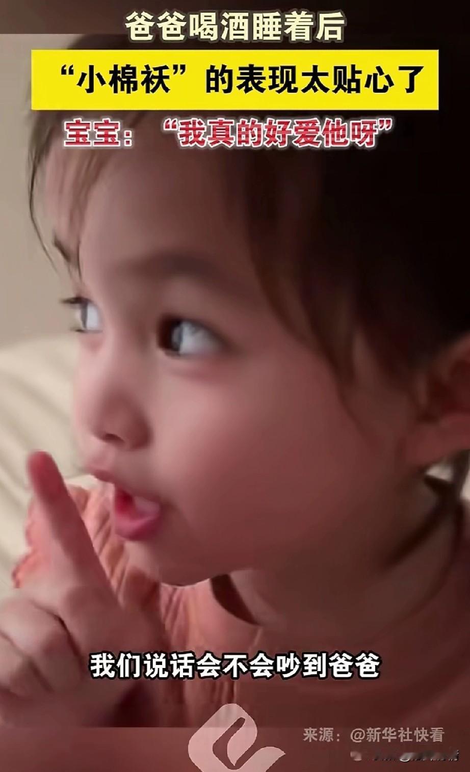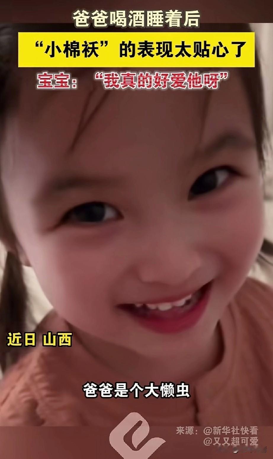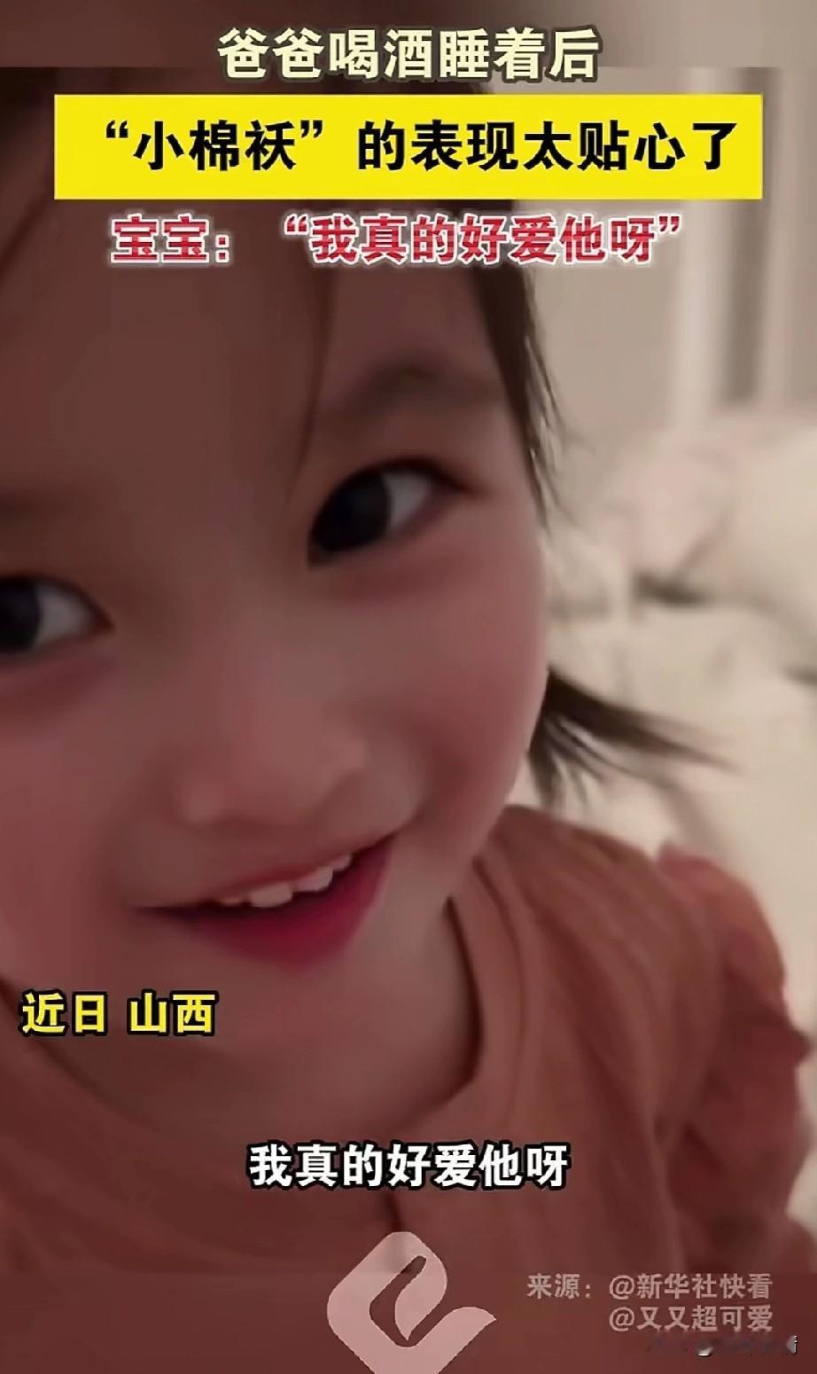 山西这个小姑娘火上了新华社, 他的爸爸喝酒后回家睡着了, 他看着睡着的爸爸, 跟妈妈说自己好爱爸爸, 爸爸是个大懒虫, 怎么天天睡觉呀? 不然他要意识到说话会不会吵到爸爸睡觉,就问自己的妈妈, 自己说话会不会吵到他? 奶声奶气的非常可爱, 她的妈妈告诉他不会的, 她这才不担心了, 说完后就乖乖躺在了爸爸身边, 还给自己的办法盖了盖被子, 这小棉袄实在太贴心了, 怪不得女儿都喜欢爸爸, 这把把起来后看到这个视频, 那不得好好给女儿买个布娃娃! 关键这女宝宝实在是真的太可爱了, 网友表示就在骗我生女儿, 大家对于女儿在爸爸酒后表白喜欢爸爸怎么看? 生儿子幸福还是生女儿幸福 山西女孩爸爸 山西爸爸