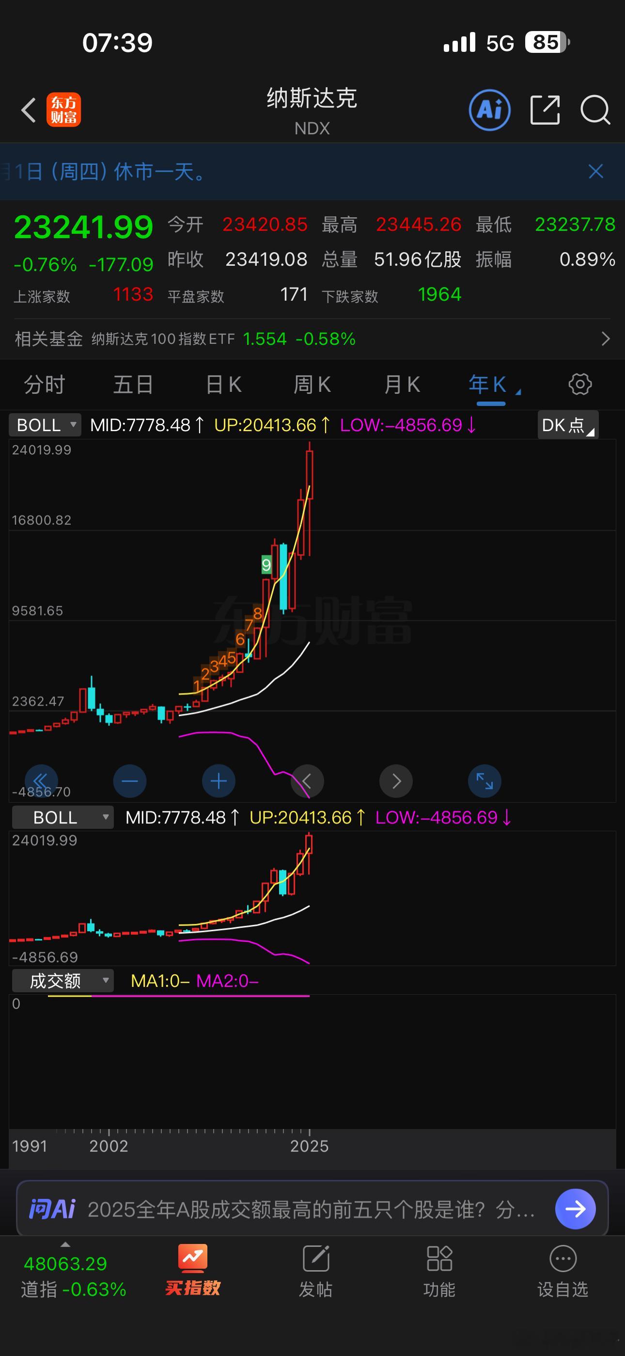 纳指实现年线三连阳,25年涨幅比沪指高一点,但不及双创涨幅大。