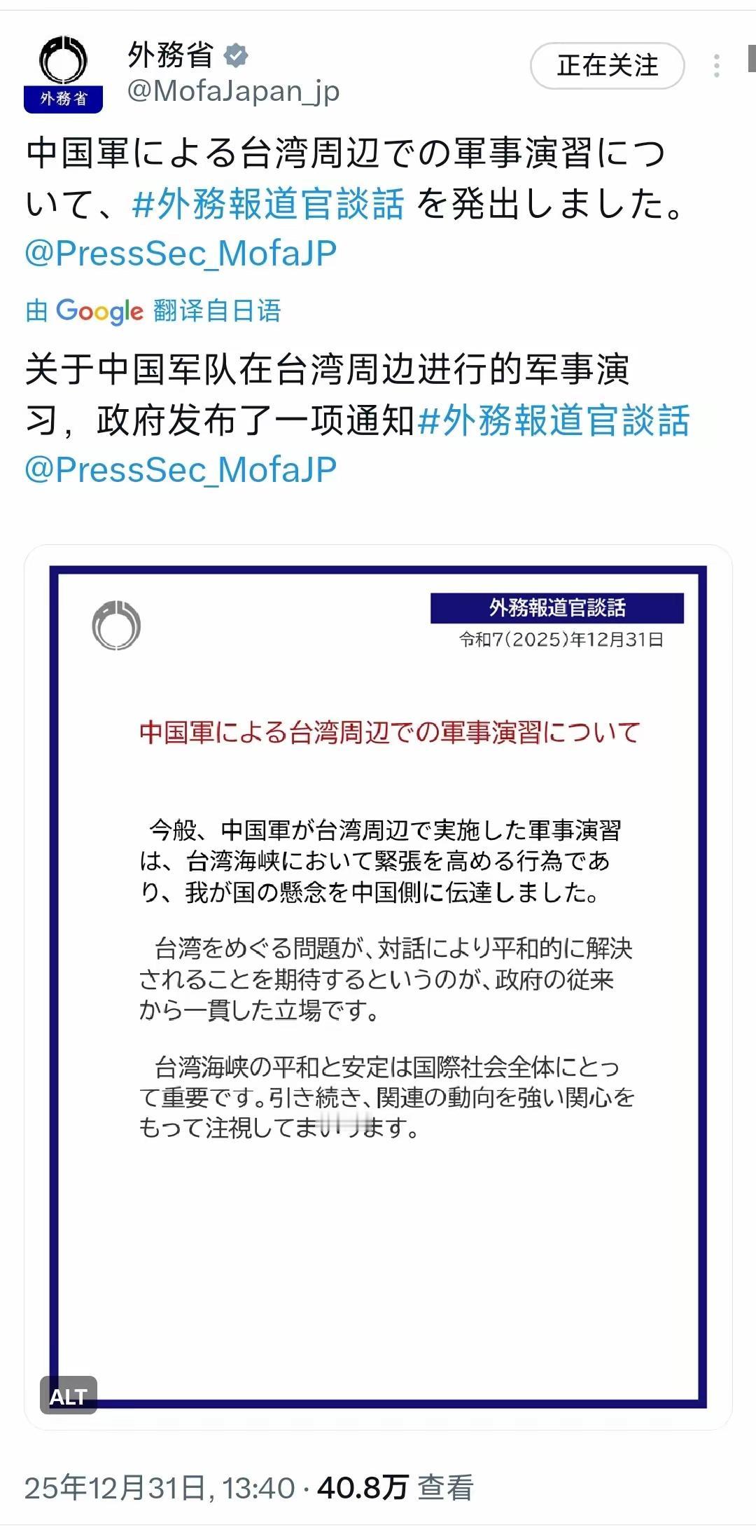 日本外务省12月31日终于对“正义使命-2025”演习发布了一份外务发言人谈话: (第一段:)“此次,中国军队在台湾周边实施的军事演习是在台湾海峡加剧紧张的行为,已将我国的关切传达给中方。” ♦“正义”“是在加剧紧张的行为”?日本不承认这是“台湾有事”,还是不敢承认这是“台湾有事”?就算是加剧紧张又关你日本甚事?你算那颗葱?少装蒜,有多远滚多远。 (第二段)“(日本)政府一贯的立场是,希望围绕台湾的问题能通过对话和平解决。” ♦不对。高市早苗不是辩解说插手台湾有事是历届日本政府(存在但没有言明)的共识吗?怎么变成“希望”“对话和平解决”啦?认怂?以后少装大尾巴狼。 (第三段)“台湾海峡的和平与稳定对国际社会整体至关重要。我们将继续密切关注相关动向。” ♦这又特么不对啦。日本不是说好了“台湾有事是日本有事”吗?怎么又变成国际社会的事啦?耍无赖? 日本外务省发的这个谈话,整个看下来就是用装蒜、认怂和耍无赖把自己打扮成文质彬彬的模样,说几句像人的话装腔作势,仿佛对中国发出动武威胁的事从来就没有过的样子,这就是一个善于伪装的恶魔该有的样子。但必须说,这也是日本的狡猾,它宁可被人说虚伪也不会采取像高市早苗说的那样的行动,否则,“正义之箭”外驱或者消灭的就是它!
