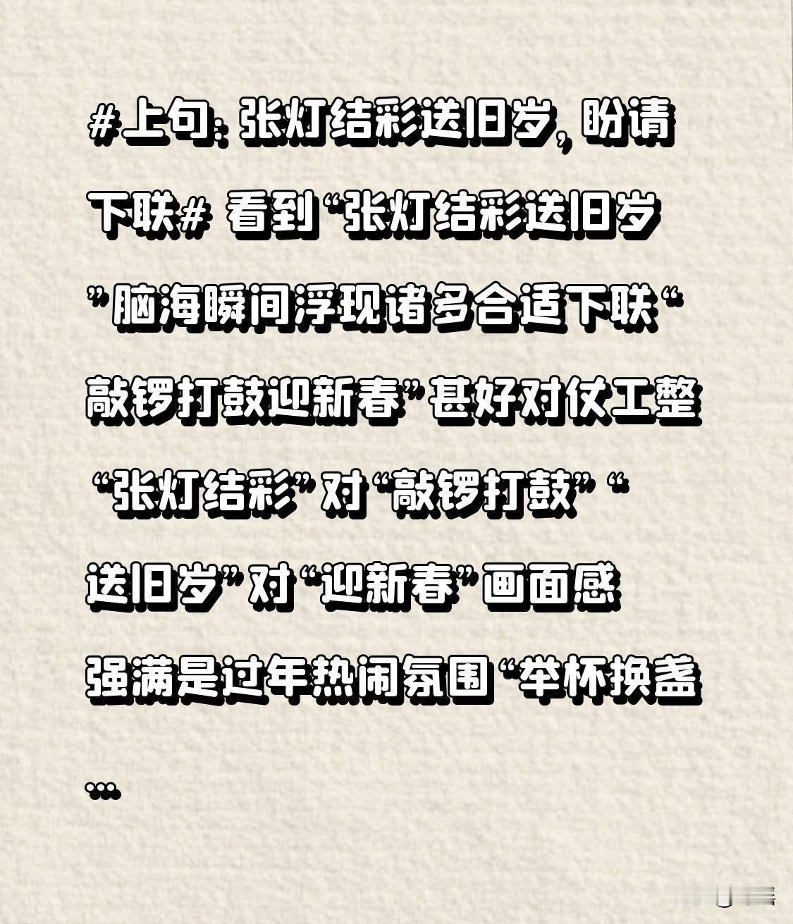 看到“张灯结彩送旧岁” 脑海瞬间浮现诸多合适下联 “敲锣打鼓迎新春”甚好 对仗工整 “张灯结彩”对“敲锣打鼓” “送旧岁”对“迎新春” 画面感强 满是过年热闹氛围 “举杯换盏贺新年”很妙 展现家人团聚、把酒言欢 饱含新年美好祝福 “燃鞭放炮迎新年”也佳 鞭炮是过年标配 寓意驱邪祈福迎新岁 这些下联韵味各异 与上联完美搭配 为新年增添喜气