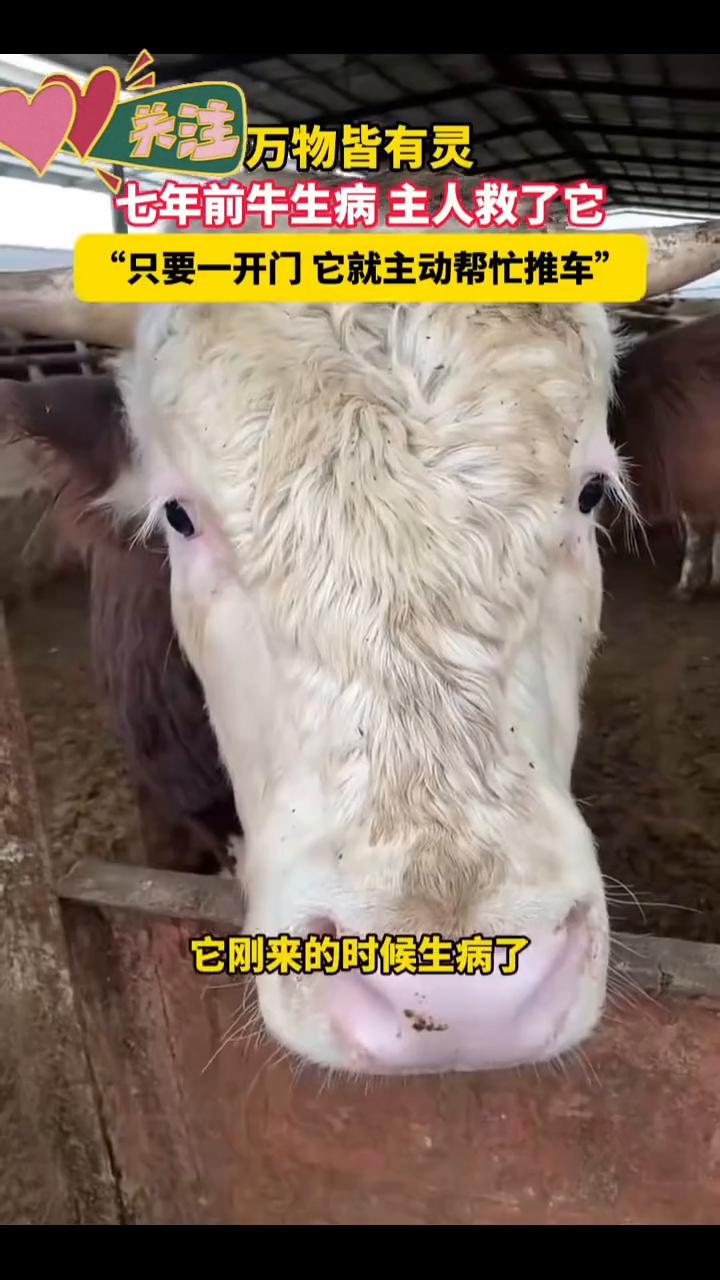 万物皆有灵,七年前牛生病主人救了它,只要一开门它就主动帮忙推车。 声音来源:唐女士。 我们养了七年的牛,多多少少也有六七百头了,但第一次遇见那么懂事的牛,它刚来的时候生病了,差点死了,然后我对象给它治好了。所以每一次只要是一开门,它就帮忙推车,我感觉它真的是"报恩牛"。