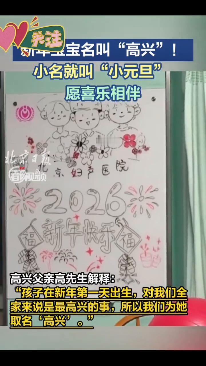 新年宝宝名叫"高兴",小名就叫"小元旦"。 2026年1月1日1时43分,北京妇产医院产房里传出响亮的啼哭声,该院首位"新年宝宝"顺利出生。小家伙身长46厘米,体重2925克,宝宝取名为"高兴"。 高兴父亲高先生解释:"孩子在新年第一天出生,对我们全家来说是最高兴的事,所以我们为她取名"高兴"。"希望她一生都喜乐相伴,高高兴兴的。"新年宝宝名叫"高兴"!至于小名则直接取自这个特别的日子:"小元旦"。你好,"小元旦"!祝愿你平安快乐的长大!