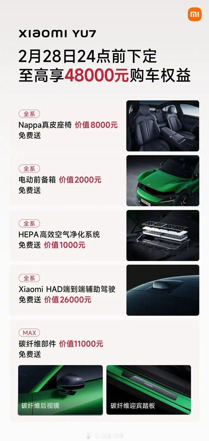 雷军本来为跨年直播准备的小米 YU7 新年福利:2 月底前下定全系可享 3 年 0 息,首付 7.49 万,月供可以低至 4,961 元。送 Nappa 真皮座椅、电动前备厢等。试驾另送 1:64 合金车模。大家快冲42how 新能源汽车