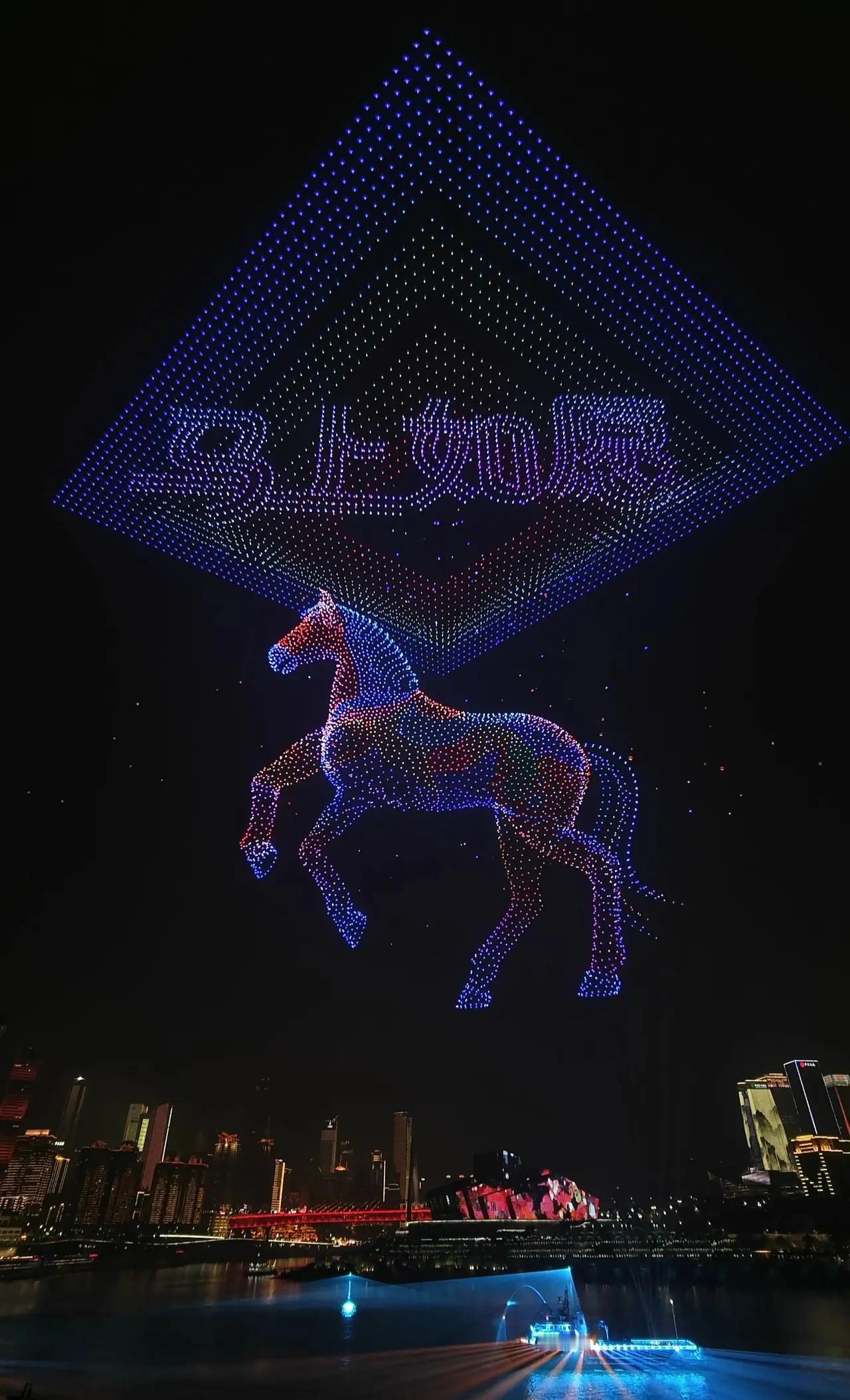 跨年夜,重庆两江交汇的上空,无人机秀出“马上如愿”,祝福国人心想事成,幸福美满2