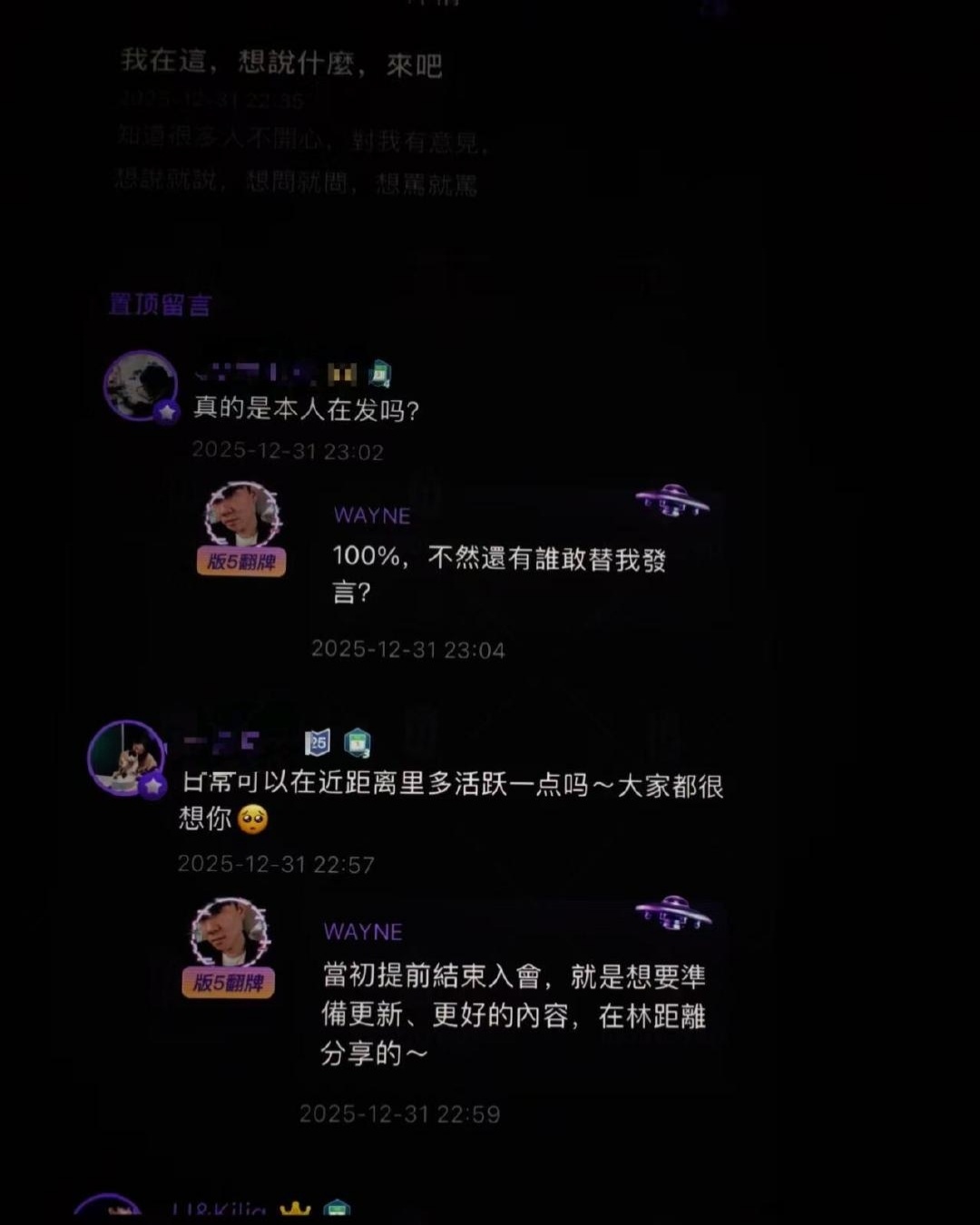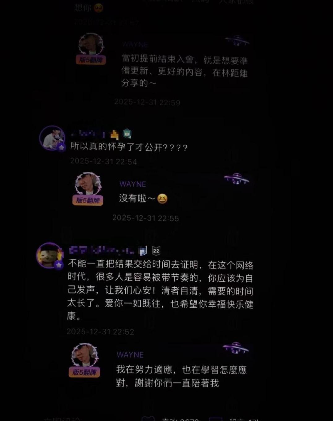 林俊杰维护七七2026年1月1日,针对粉丝担忧七七“身份可疑可能影响事业”,林俊杰在微博评论区回复:“放心,虽然以前我叫林三岁,但是我不傻”,首次明确表达对女友的信任及自主选择权。此次回应距离他上一次翻牌粉丝(2025年除夕)近一年,也是自2025年12月29日借母亲寿宴官宣恋情后首次公开维护七七。林俊杰维护七七