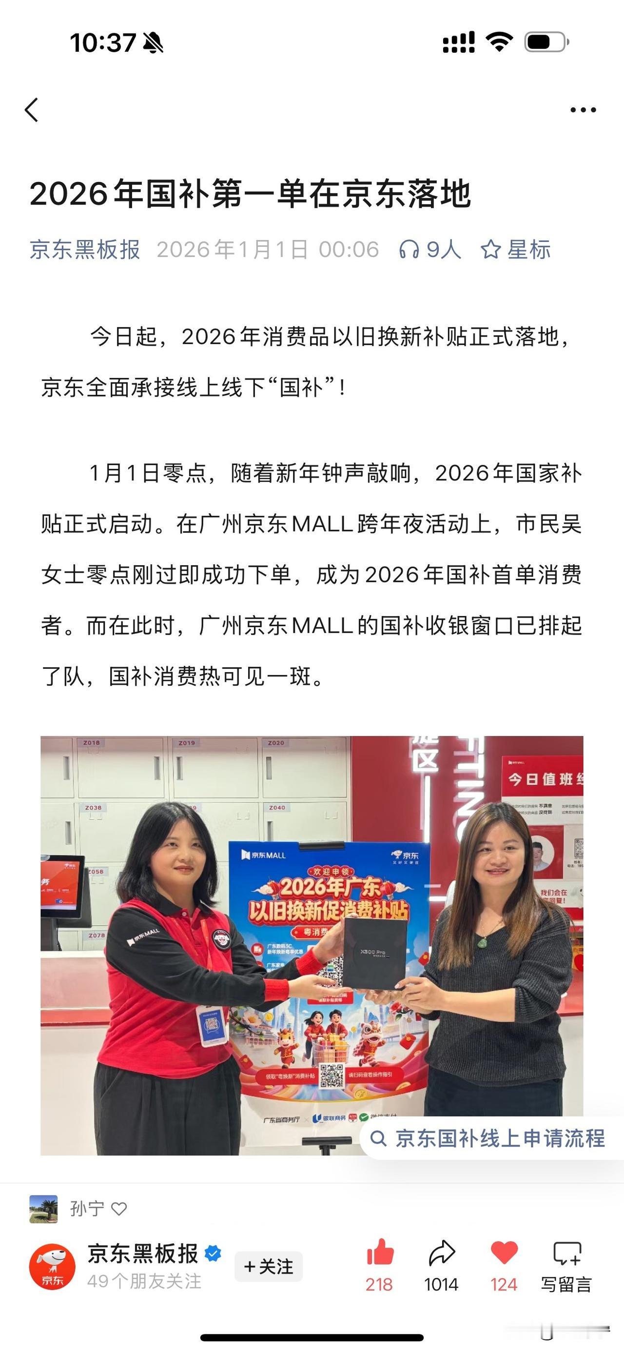 没有朋友,没有欢聚,没有烟花,没有约会,没有购物,没有消费,也没有什么祝福。熬夜过了12点,朋友圈刷完,年就算跨完了,很多的人跨年,真的没有什么仪式感。过节,就像过了一场寂寞。 但是也有越来越多的人开始觉醒,他们要创造自己的仪式感。哪怕为自己准备一份礼物,比如一部手机、一个音响、或者一个包包,一套化妆品。也许不算贵重,但也算为忙碌一年的自己,郑重的说一声“辛苦了”! 比如在广州京东MALL,很多人还在家里刷手机,一位普通消费者吴女士,已经完成了一次特别的选择——她用国家补贴下单了一部手机,成为2026年国补的第一单! 她不是“抢首单”的人,也不是为了上新闻。她只是提前了解到政策,想换一部手机,想在新的一年给自己一点实在的好处,想要过年不那么平淡,想要一份简单的仪式感!原价5999元的手机,国家补贴直接减了500元。那一刻,她开心地说真划算,这种开心,便是对新的新年,最好的交代! 2026年1月1日零点刚过,国家新一轮消费品补贴正式启动,全国第一单国补在京东落地。不是发布会上的数据,也不是PPT里的规划,而是一个普通消费者,在跨年夜下了一单,补贴当场生效,价格立刻降低,实惠和该有的仪式感,一样都不差! 这些年,大家对“好政策”并不陌生,文件里写得很好,解读也很多,但真正让人无力的,是落地那一步。规则复杂、流程绕人、平台推诿,最后往往变成一句:“知道了,但算了。” 而这一次,没有“算了”。 零点一到,系统能用,补贴能抵,线上线下一起跑。5999元的手机,直接减500;一万多的家电,补贴1500,清清楚楚,明明白白。你不用研究半天条款,也不用担心是不是“名额用完”,更不用被来回折腾。 这背后,其实是一种态度。 说句实在的,承接国家政策,平台完全可以只做“形式正确”,挂个入口,喊个口号,剩下的交给消费者自己研究。但京东显然没走这条省事的路。提前准备、全链路配合、线上线下统一标准,把“国补”当成一件必须认真完成的事,而不是一场短期热闹。 所以2026年国补第一单在京东落地!并不意外。它更像是多年习惯的延续——国家政策往下走,京东就往前顶。尤其是在家电、数码、以旧换新这些最贴近普通家庭的领域,真正考验的不是宣传能力,而是执行能力,是你愿不愿意把复杂的事留给自己,把简单的体验留给用户。 很多人其实不是不愿意消费,而是不愿意被消耗。被规则消耗,被流程消耗,被反复确认消耗。当一项政策能让人感觉“被尊重、被照顾、被认真对待”,消费自然会发生。 新年的第一天,国补第一单落地在京东,意义不只在“第一”,而在于它让人重新相信一件事:好政策,只要遇到肯负责的平台,是真的能变成普通人生活里的好消息,更能第一时间把跨年的仪式感,送到千家万户! 跨年不是烟花那一秒,更不是枯燥的朋友圈,而是从新年的第一刻开始,学会补贴自己,爱惜自己。让生活的品质,真的往前走一点点!