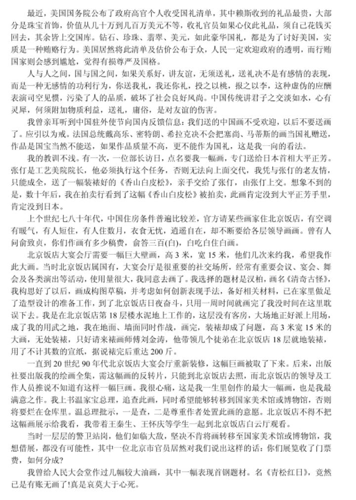 著名画家吴冠中说,七八十年代的时候,大多数画家居住条件不好,,他和一些著名画家,被请到北京饭店居住,有暖气有空调,长的住了几个月,工作就是不停的画画,白吃白住,但不给报酬, 一个部长要访日,要求他画一幅画送给日本首相大平正芳做国礼,他把自己的《香山白皮松》让部长带走了, 20多年后,这幅画在香港拍了1000多万港币,吴冠中确信这画根本没到日本, 他在那几年画的很多画,都已经失踪了。
