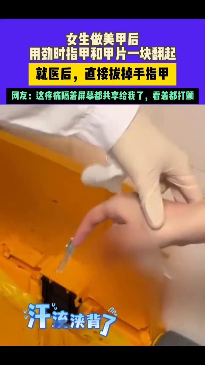 女生做美甲后,指甲和甲片一块翻起,就医后直接拔掉手指甲。 网友:这疼痛隔着屏幕都共享给我了,看着都打颤。 12月29日(发布),四川。关注女生做美甲后,用劲时指甲和甲片一块翻起,这是干什么?因为一个寸劲指甲翻了,粉劲吧,疼,汗流来背了。 提醒:爱美甲的朋友一定多加注意,避免受伤。