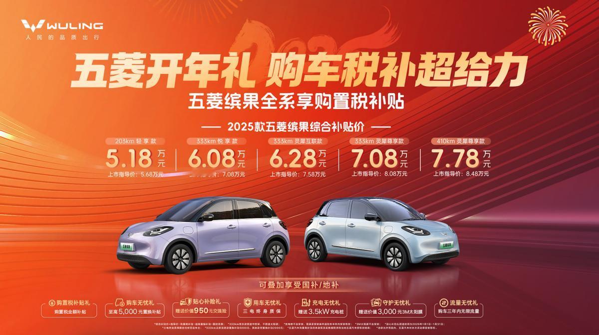 想要宏光MINIEV?现在入手正当时。 最近身边有朋友计划新年入手一台代步车,预算5万左右,接送孩子,上下班通勤,周末还能近郊出游,我想了想,宏光MINIEV四门版301km臻享+款是个不错的选择。 为什么呢?宏光MINIEV四门四座的设计以及“好看、好开、好停、好省”的核心产品力,能让代步出行更有乐趣。四门设计+2190mm的轴距,一家人出行也能舒适有余。 而301km的续航,35分钟的直流快充,能满足城市通勤代步,接送孩子,跨城出游的多元化场景。 更为重要的是2026年新能源购置税从全额免征变成了减半征收,但五菱开年礼带来了购置税补贴礼,购买宏光MINIEV家族、缤果、缤果S车型可享购置税全额补贴,也就是五菱帮你承担了另一半的购置税。 再叠加购买宏光MINIEV的至高4000元无门槛超级置换补贴之后,宏光MINIEV四门版综合补贴价最低3.88万元起。 如果大家想要购买更大尺寸的代步车,那就选择缤果家族,更大的空间,更长的续航,更多配置,能让代步出行更有质感,更多缤纷。 而仅需综合补贴价6.38万起的缤果S和综合补贴价5.18万元起的2025款五菱缤果也是很给力哦! 总体而言,虽然新能源购置税政策有变,但五菱的补贴可以让大家购车无忧,无论是宏光MINIEV家族,还是缤果家族,现在入手的就是最佳时机!
