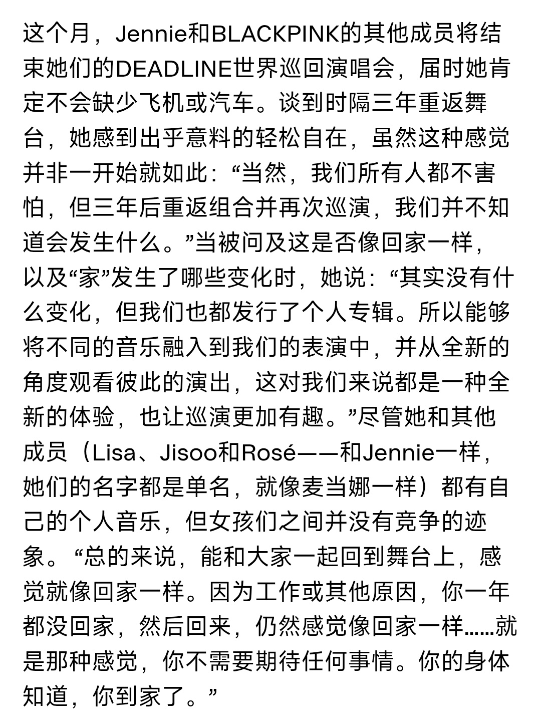 JENNIE在采访中提到BLACKPINK🖤💗Q:时隔三年重返舞台,是否像回家一样?以及“家”发生了哪些变化?J:…和大家一起回到舞台上,感觉就像回家一样。因为工作或其他原因,你一年都没回家,但是回家后,家仍然是家……就是那种你熟悉的安全感。你的身体知道,你到家了。