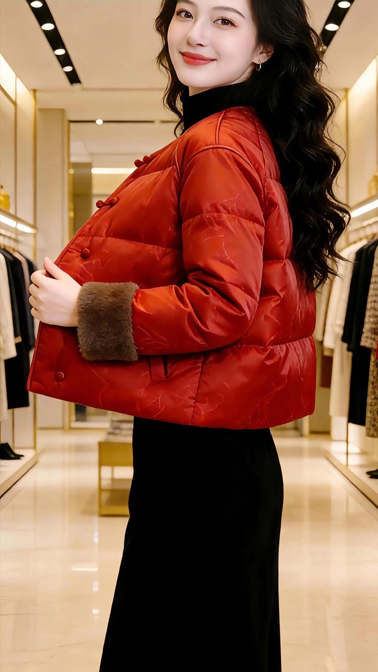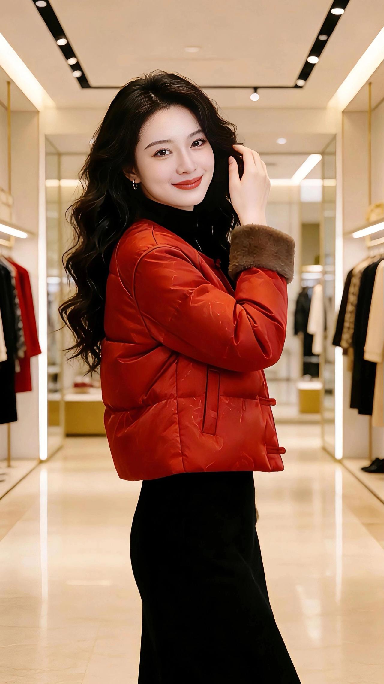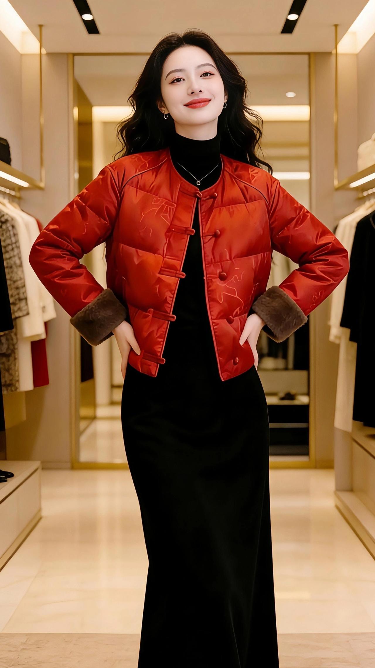 红袄映年 鎏金线条勾勒的衣廊里,暖光漫过光洁的大理石地面,将那抹正红揉得温润。新岁的意头,便凝在这件盘扣红袄上,暗纹似流云缠了衣身,獭兔毛的袖口坠着绒绒的暖,像攥住了冬日里的一团软火。 她立在光影里,黑发蜷成柔浪,垂眸时指尖轻叠,是中式的温婉;抬步时衣摆微扬,红袄的菱格绗缝随动作漾开褶皱,又添了几分俏然。抬手拢发的瞬间,唇畔笑意漫开,红袄的艳与黑裙的雅撞出层次,像墨色宣纸上落了一点朱砂,艳而不俗,媚而不妖。 这抹红,是辞旧的温软,也是迎新的热烈。它裹着冬日的暖,也盛着年节的甜,在衣香鬓影的长廊里,把东方的韵致揉进了日常的光景,让寻常的试衣时刻,也沾了几分岁时的温柔与期盼。 高级感穿搭 时尚穿搭 新年穿搭 新中式穿搭