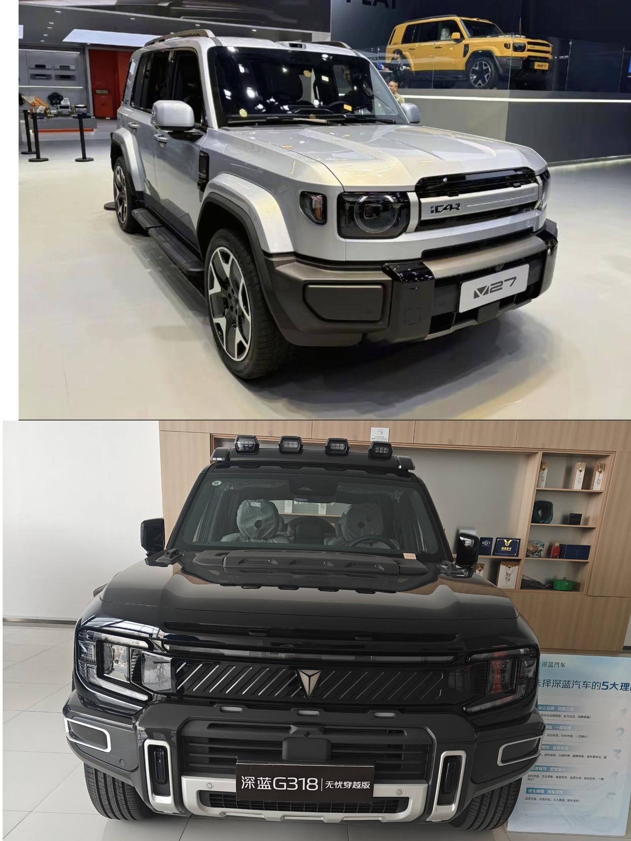 我个人很喜欢硬派的SUV,特别是方盒子车型。今天说说如果预算20W左右,想选一台硬派新能源方盒子SUV,绕不开同为增程动力模式的奇瑞iCAR的V27和长安深蓝的G318这两台车,接下来对比来看看,究竟哪台车更胜一筹: 1️⃣外观篇: 两车外形接近,都是比较平直的线条设计,标配固定踏板和后挂备胎,硬派越野范十足。气质这方面可以说谁都不输谁,接下来看细节: 🔵iCARV27: ✅优点:带有激光雷达,配置更高,对于市区高速开车辅助能力强,并且复古造型能引起大部分人的情怀感受,可以说是多种风格共存。 ❎缺点:相比G318来说没有尾翼,车尾显得设计不足。其次就是整车造型和丰田LC76太像了,缺少原创性。 🔵深蓝G318: ✅优点:车顶射灯造型威武帅气,车头贯穿灯带,前保险杠造型更丰富,显得整车更偏向年轻时尚的设计风格。 ❎缺点:侧面看车窗线条设计不够大气,车顶行李架和车身的整体性略差。 ✍🏻打分:我个人比较喜欢设计比较年轻时尚且原创性略高的G318,G318+1分。 2️⃣内饰篇: 两台车内饰风格差别很大,接下来进行两车对比: 🔵风格对比: 两车都是硬派越野的设计风格。深蓝G318可以从仪表台的大把手和粗大的电子档把就可以看出来。而V27设计略有不同,门把手依旧粗大硬派,但采用了怀挡方式,刚中带柔的感觉。 这点不分好滴,平局 🔵细节设计: G318仪表台的设计宽大平整,造型简单,属于传统车企风格。 V27中控台层次感更强,并且取消传统档把后中岛区域布局更合理,实用性更高。而且也占了晚上市的好处,后排增加了拓展口,可以满足后排娱乐需求,最特别的还是竖向的天窗搭配上氛围灯科技感很强,属于比较年轻时尚的设计。 ✍🏻打分:iCARV27更胜一筹,+1分。 3️⃣空间篇: 两台车在都配备后挂备胎的情况下,G318车长5010,轴距2880;V27车长5055,轴距2910。只要奇瑞设计在线,空间比G318大是肯定的。 ✍🏻打分:iCARV27+1分。 📖总结归纳: 两台车都是硬派方盒子车型,但也都是增程动力模式,所以也注定这两台车更适合平时代步。通过以上对比,奇瑞ICARV27综合实力更强,接下来就看它的定价了。 【请到“懂车帝APP”查看投票】