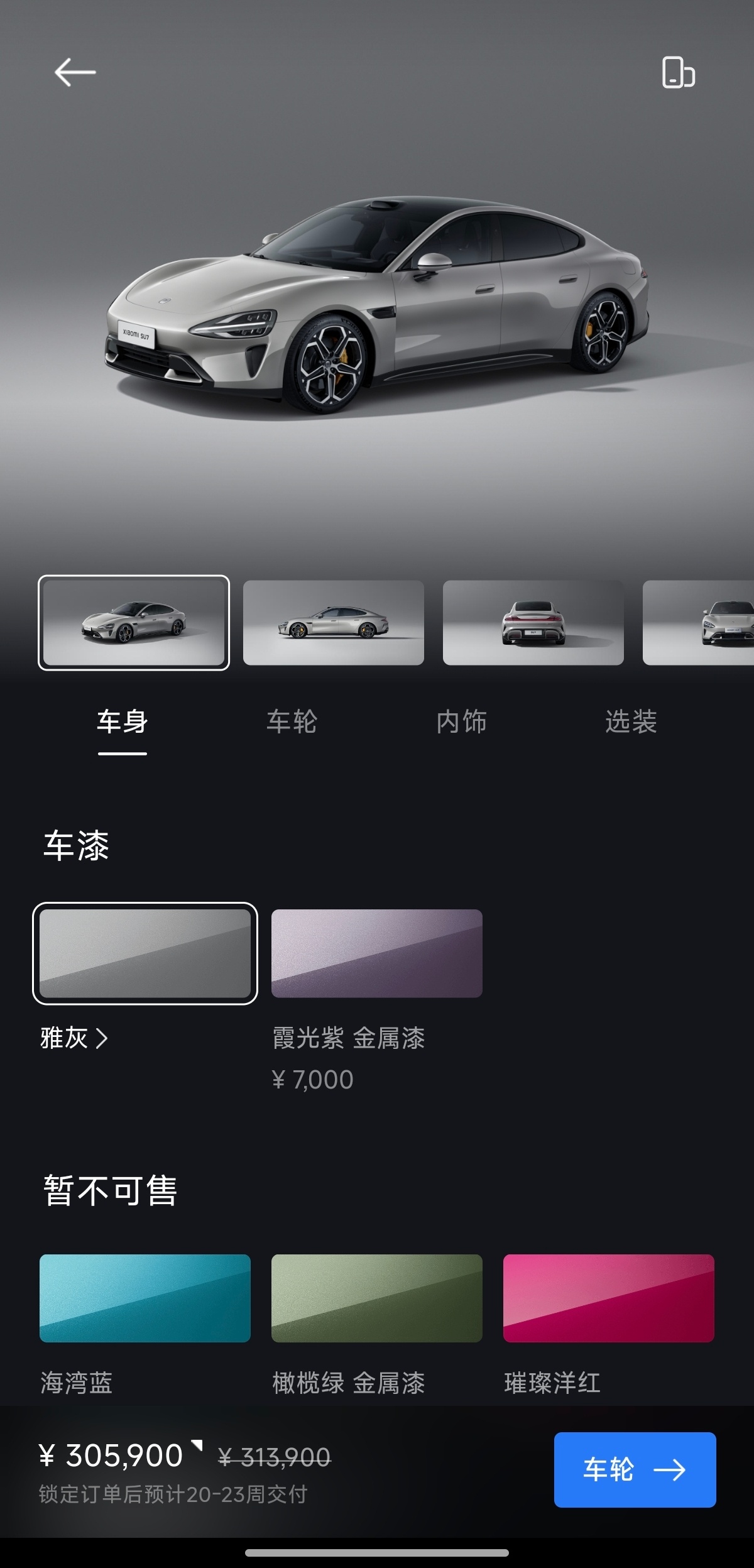 小米SU7应该是改款马上就会公布了,和其他所有改款车型一样,面领着被刺用户的风险。目前看小米的解法还挺有意思,首先是很多配置都显示售罄不再补货了,再叠加取消购车权益,应该是物料结尾清空+放弃大部分订单:以SU7 Max为例配色只剩下雅灰和霞光紫,轮毂只剩下20寸运动,内饰只剩下紫色和红色无法选配冰箱SU7 Pro只剩下紫内紫外和20寸轮毂,SU7标准版只剩下灰色紫色,配19寸低风阻轮毂全系等待时间加长,基本全部转产YU7,YU7交付周期进一步缩短,目前看,小米这波操作等于半明牌宁可不要订单也不被刺新车主了。这也意味着SU7改款(SU7 2026 ?焕新SU7?)马上就要来了。