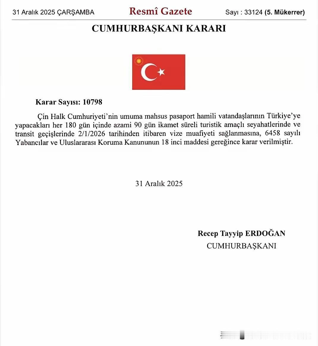 2025年最后一天晚上的深夜,土耳其可谓是突然对中国发大招,埃尔多安正式签署总统令,决定自2026年1月2日起,为中国持普通护照的公民前往土耳其实行免签,每180天内最多停留90天。 那么,土耳其为何做出这样的决定呢? 答案藏在实实在在的经济账本里。旅游业占土耳其GDP比重超13%,关系着300多万人的生计,2025年前三季度旅游收入就冲到了500亿美元,全年目标直指640亿美元。 可这么大的市场里,中国游客占比才0.78%,2024年全年只有40.97万人次,这对坐拥棉花堡、圣索菲亚大教堂等顶级资源的土耳其来说,简直是没开发的宝藏。 更关键的是,中国游客人均消费近1000美元,远超欧美游客,这种“高价值客源”谁不想抢?伊斯坦布尔老城区开餐厅的奥马尔最有感触,2025年夏天他试着在菜单上加了中文翻译,接待的中国游客一下子多了三成,临走时大家还会带几罐他家自制的橄榄油,这让他早早盼着免签政策落地,现在已经把餐厅墙面重新刷成了中国游客喜欢的暖色调,还学了几句简单的中文问候。 周边国家的竞争压力也逼着土耳其快马加鞭。 俄罗斯2025年底刚宣布对华免签,马来西亚早就实现互免签证,连韩国都对中国团体游客放开了免签,土耳其要是不跟上,这块蛋糕只会被分走更多。 更重要的是,中土直飞航班已经从每周21班扩容到49班,15个主要城市能直飞伊斯坦布尔,交通便利度足够支撑免签后的客流增长。 做了8年土耳其专线导游的李姐,免签消息一出,手机微信直接被咨询刷屏,“之前最费时间的就是帮客户办签证,现在说走就能走,春节团早就报满了,还有人问能不能定制自驾环线”,她的经历印证了去哪儿平台的数据——政策公布当天,伊斯坦布尔航线搜索量直接涨了3.2倍。 这步棋远不止旅游那么简单。2024年中土双边贸易额达到428.85亿美元,中国已经是土耳其第二大贸易伙伴,可贸易逆差一直让土耳其惦记,2024年中国对土出口381亿美元,进口却只有37亿美元。 大量中国游客的到来,能通过吃住行游购娱的消费,直接填补服务贸易的缺口,这种“消费逆差补偿”比单纯谈判更有效。 更深层的是战略对接,中国“一带一路”倡议和土耳其“中间走廊”战略正在深度融合,中欧班列经土耳其中转15天就能从中国抵达欧洲,中企承建的图兹湖天然气储库能把储存容量从12亿立方米扩到54亿立方米,这些合作都需要更便捷的人员往来做支撑。 免签政策一落地,商务考察的企业高管不用再为签证耽误时间,项目工程师往返也更灵活,这对推进后续合作的作用不言而喻。 2026年是中土建交55周年,免签更是土耳其递出的外交橄榄枝。 之前受各种因素影响,两国高层互访不算频繁,这次主动放开免签,明显是想借纪念日契机升温双边关系。 按照外交对等原则,中方大概率会跟进优化土耳其公民入境政策,到时候不仅是游客,学术交流、文化互动都会更顺畅。土耳其对外经济关系委员会的库尔多卢说得实在,中国游客数量每年都在翻倍增长,这种民间往来能让两国合作更有温度。 就像在卡帕多奇亚做热气球生意的哈桑,他现在已经要求员工必须学会“安全”“漂亮”等中文词汇,还准备和中国旅拍机构合作,因为他知道,免签带来的不仅是游客,更是长期的合作机会。 说到底,土耳其的免签政策是互利共赢的明智之举。 既抓住了中国出境游的红利,又能推动贸易平衡和战略对接,还能借着建交55周年的契机深化双边关系。 这不是单方面的示好,而是基于自身发展需求的理性选择,更是全球化背景下国家间相互成就的必然。 随着人员往来越来越密,丝绸之路主题旅游线路的推广,两国的合作只会越来越深。 各位读者你们怎么看?欢迎在评论区讨论。