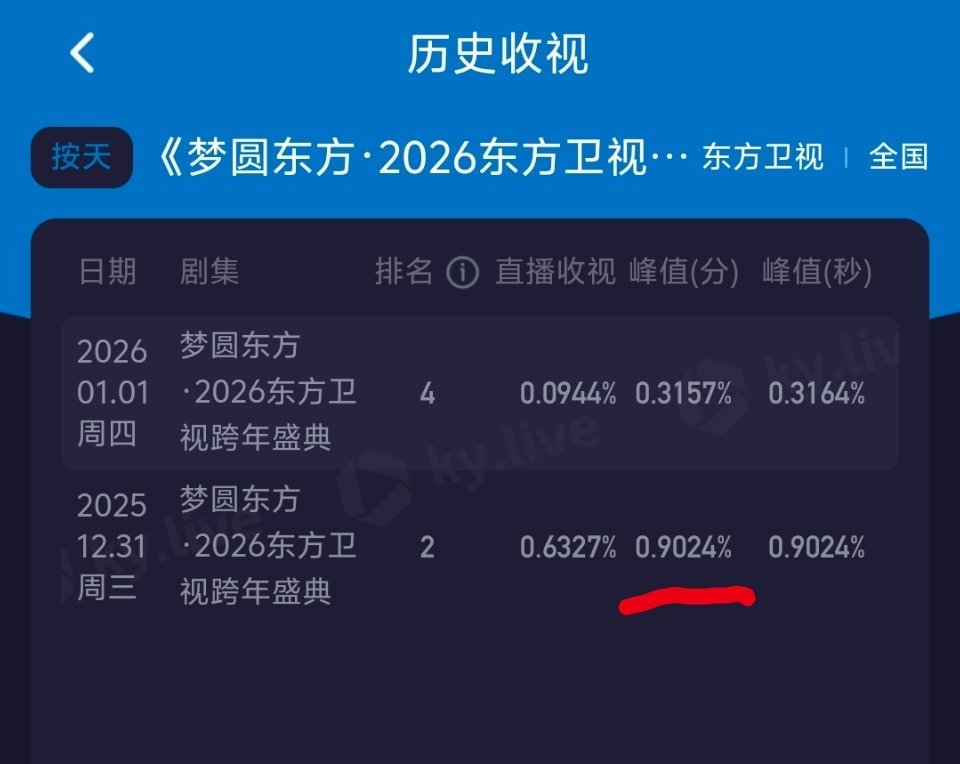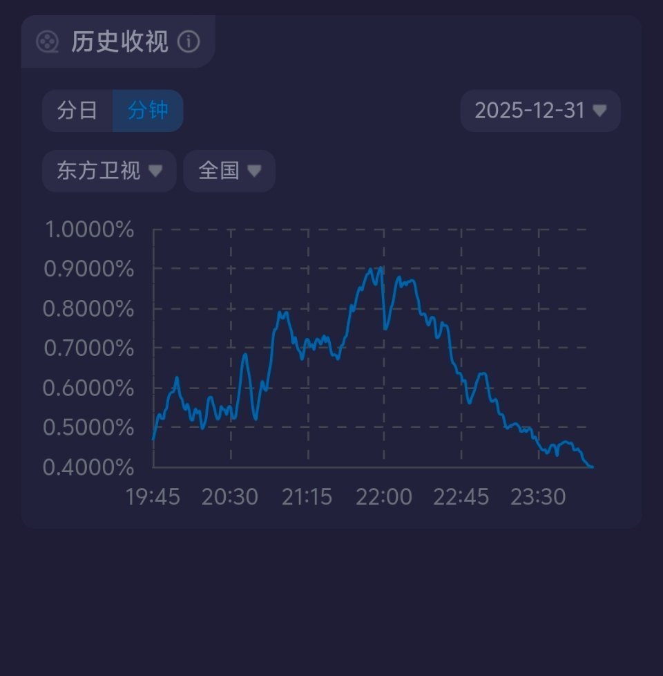 虚假营销又一例。2025年东方卫视跨年酷云最高峰值不过0.9,全程没有破1过,创下近几年来东方卫视跨年最差收视成绩。哪来的破1?这种属于无中生有、污染大数据、混淆公众视听。