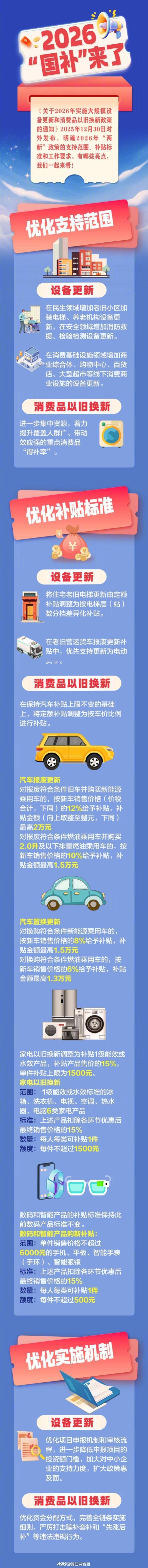 2026新国补来了汽车补贴改为比例制,新能源倾斜明显报废更新:新能源车补车价12%(上限2万元),车价≥16.67万元拿满补贴;燃油车(2.0L及以下)补车价10%(上限1.5万元),旧车需2013年6月前注册。 置换更新:新能源车补8%(上限1.5万),燃油车补6%(上限1.3万)。低价车型补贴缩水:10万元新能源车报废补贴从2025年2万降至1.2万,降幅40%,部分刚需家庭质疑公平性。家电类范围缩减、门槛提高仅6类产品可补:冰箱、洗衣机、电视、空调、电脑、热水器(取消厨电等品类);能效要求升级:仅补贴1级能效或水效产品,比例从20%降至15%,单件上限从2000元降至1500元(如8000元空调仅补1200元)。数码智能产品扩容,新增智能眼镜 手机、平板、智能手表/手环基础上,首次纳入智能眼镜,智能家居(含适老化产品)由地方自主制定细则;维持15%补贴比例,单件≤6000元,上限500元(如手机补500元需售价3333元以上)。