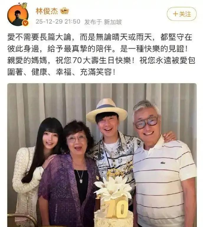44岁的林俊杰终于脱单了!就在前几天,他给妈妈过70大寿的时候,顺便晒出一张一家四口的温馨合照,里面那位长发美女紧紧靠在阿姨肩上,笑得特别甜,这不就是正式把女朋友带回家见父母了吗? 这位妹子叫七七,23岁,是个挺有名的网红,长得高挑精致,颜值在线,还特别会打扮。两人差了整整21岁,早从今年年初就开始传绯闻:她老出现在林俊杰演唱会的VIP第一排,从新加坡到东京伦敦,全程追场;夏天在新西兰一起逛街看星星,秋天在洛杉矶街头被拍到穿同色系衣服,林俊杰还帮她拎包,互动超自然。 其实这段感情稳得很,七七家境也好,模特出身,在国外上过设计学院,自己也有流量和实力,不是靠谁上位的类型。林俊杰出道这么多年,一直低调,这次选在妈妈生日这个节点公开,明显是认真想安定下来了。年龄大点又咋样,真爱来了挡不住,他现在看起来开心多了,继续唱好歌就行,生活甜蜜点才更有灵感嘛!这波操作太暖了,祝福他们长长久久。