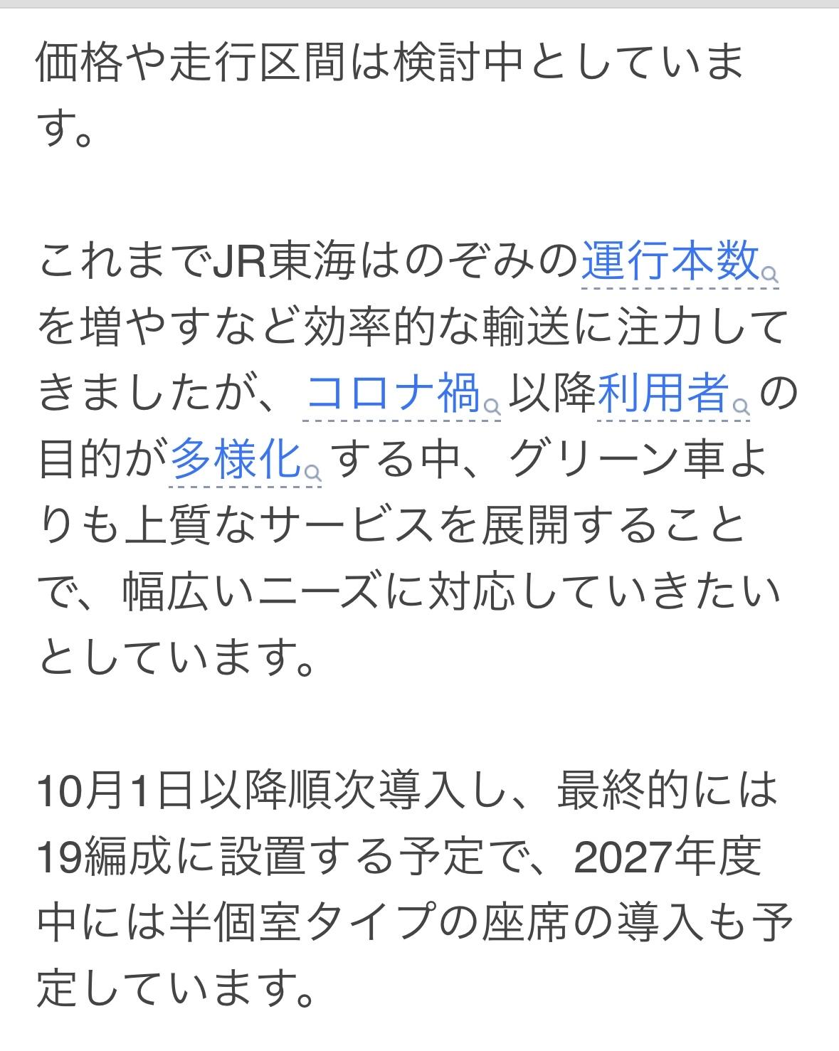 东海道新干线宣布,今年10月1日推出私人包厢式座椅,每列列车配备两个包厢。 包厢最多可容纳两人,配备专用Wi-Fi。除配有带腿托的可调节座椅,照明、空调、广播音量也都能调节。 新型座椅10月1日起逐步投入使用,计划在19列列车上安装。此外,半私密座椅也计划在27年推出。