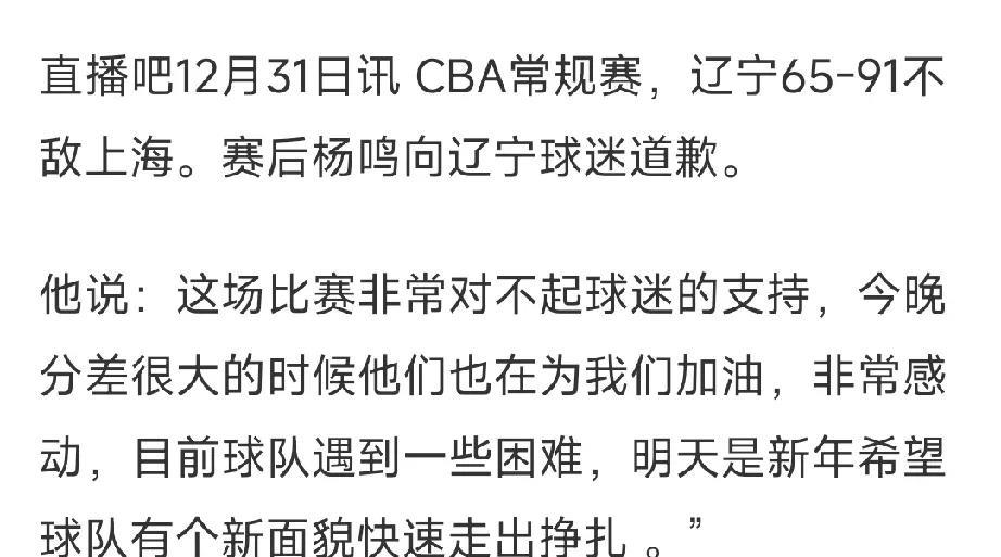 杨鸣向球迷道歉!巨大分差还在为我们加油! 辽宁男篮大比分惨败给上海队赛后,杨鸣接受采访,并向球迷道歉! 杨鸣表示,本场比赛要向球迷道歉,辽宁男篮落后很多还在为我们加油,非常感动! 确实球队现在遇到一些困难,希望新年有个新面貌,早日走出困境!